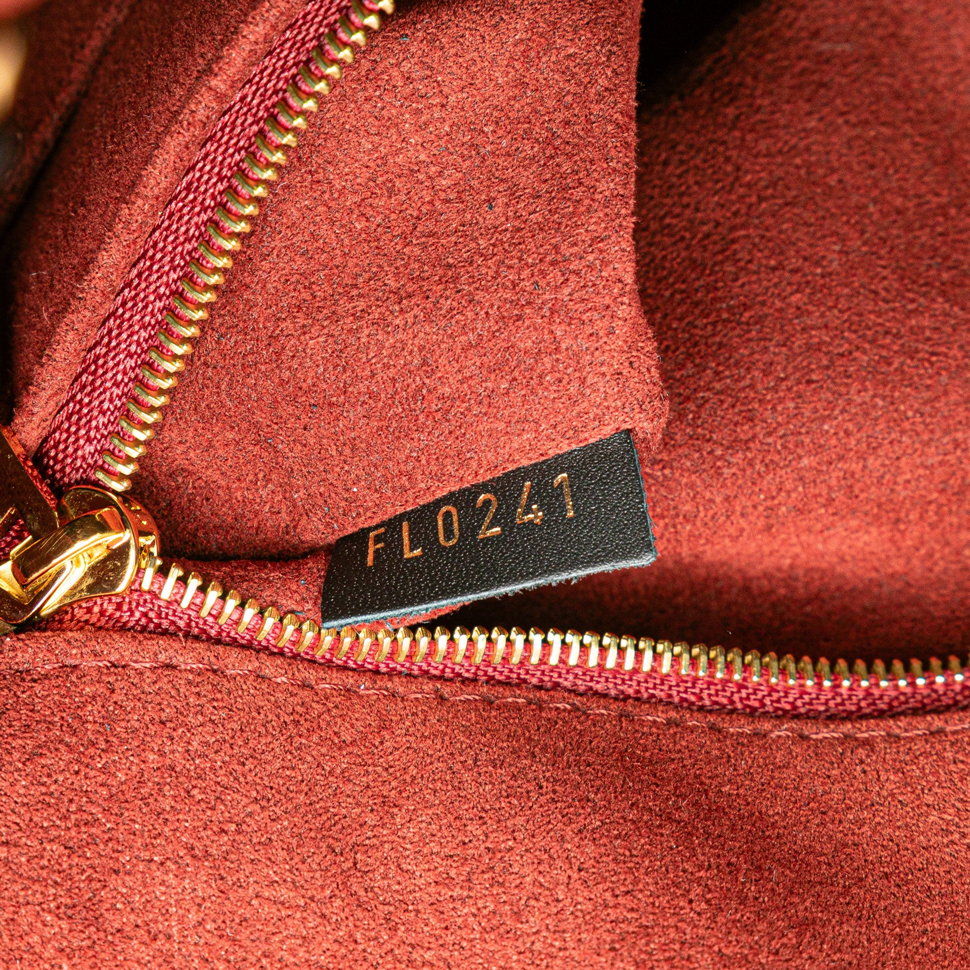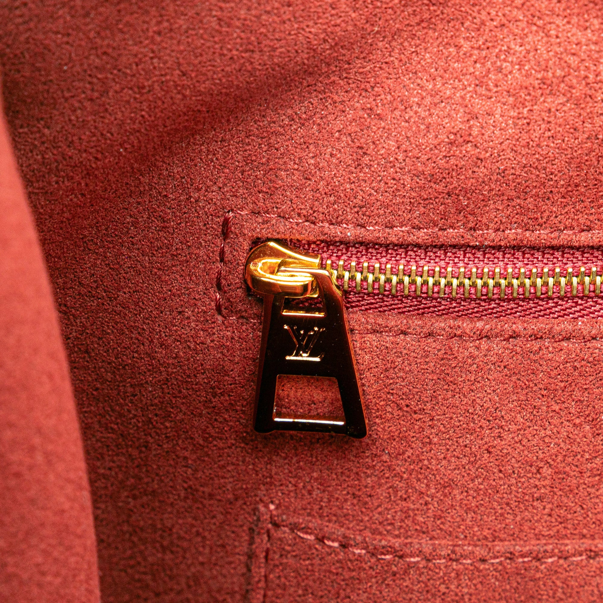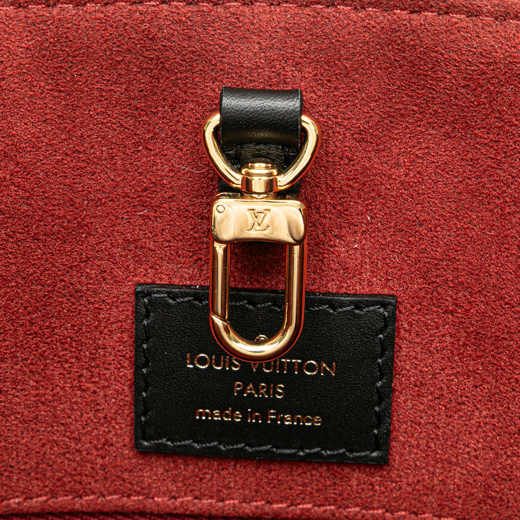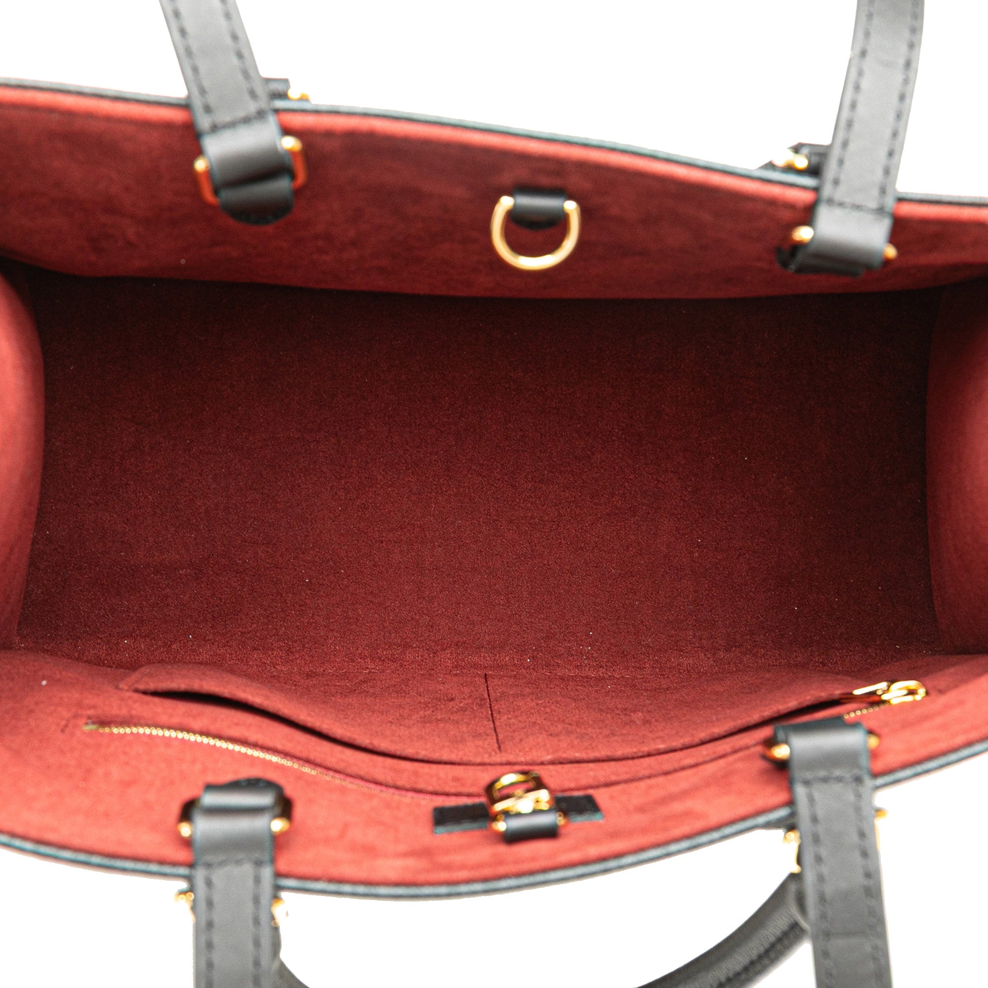 The Onthego MM features a monogram empreinte leather body, rolled leather handles, flat leather shoulder handles, an open top with lobster clasp closure, and interior zip and slip pockets. Inclusion: Dust bag, box. Retail Price: 3235.00