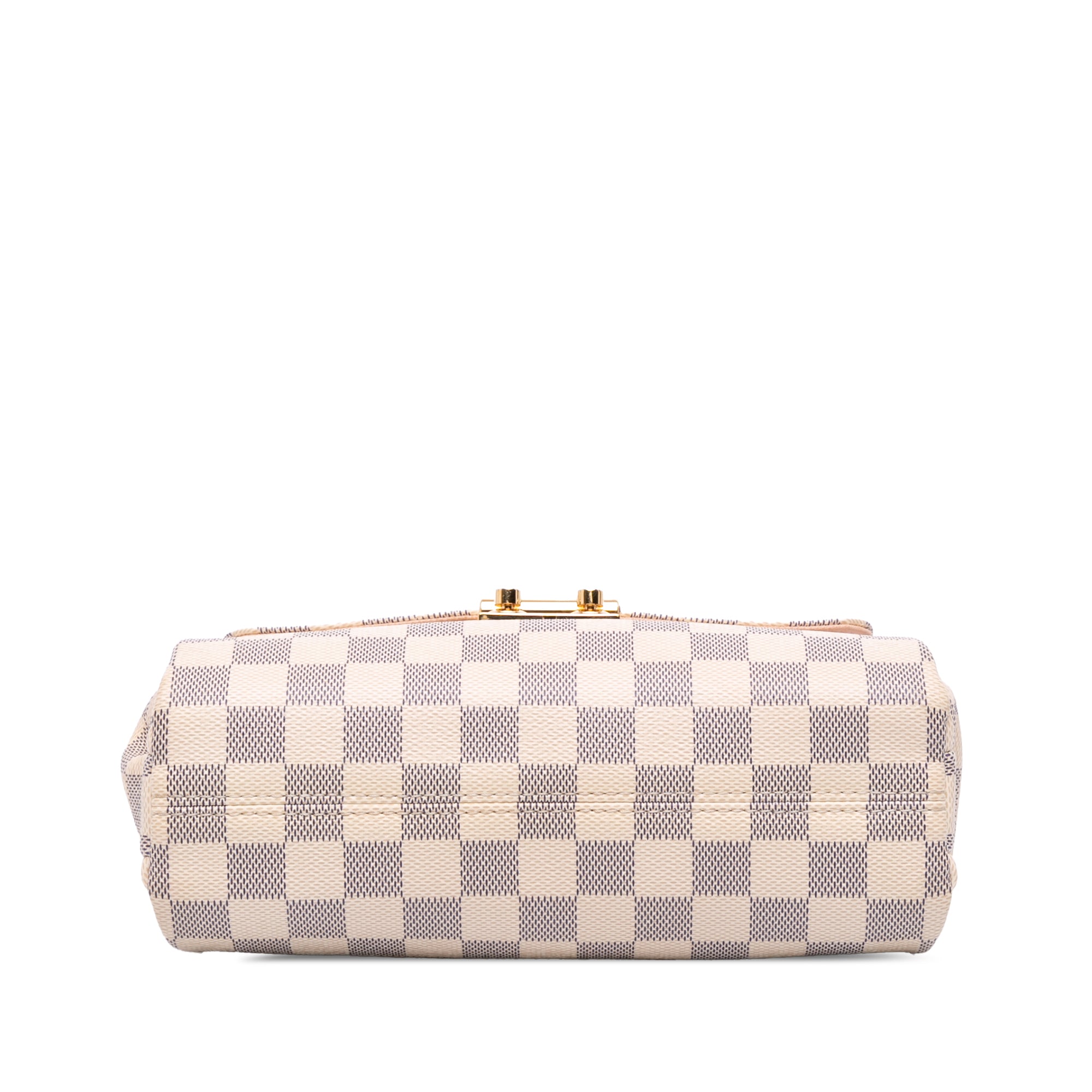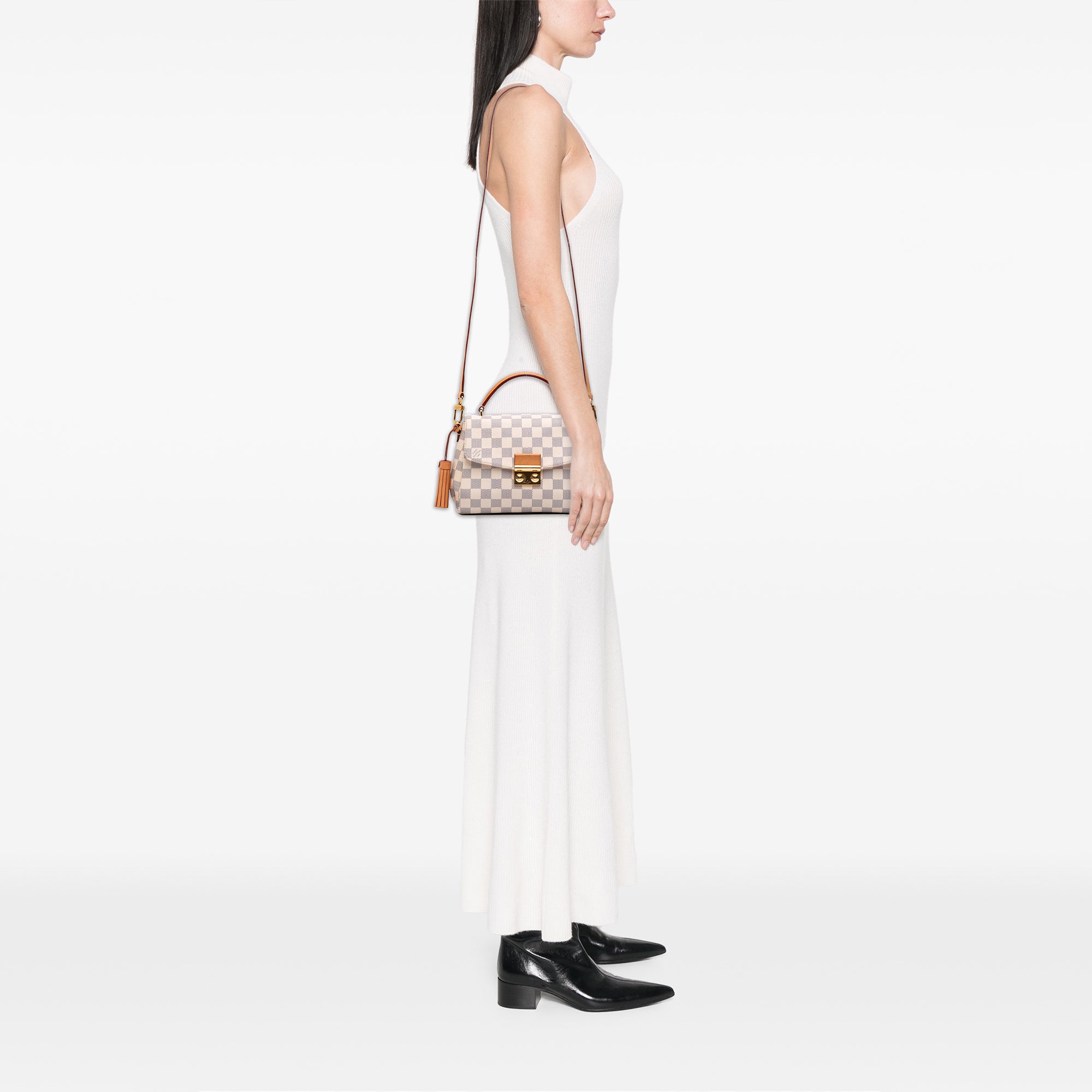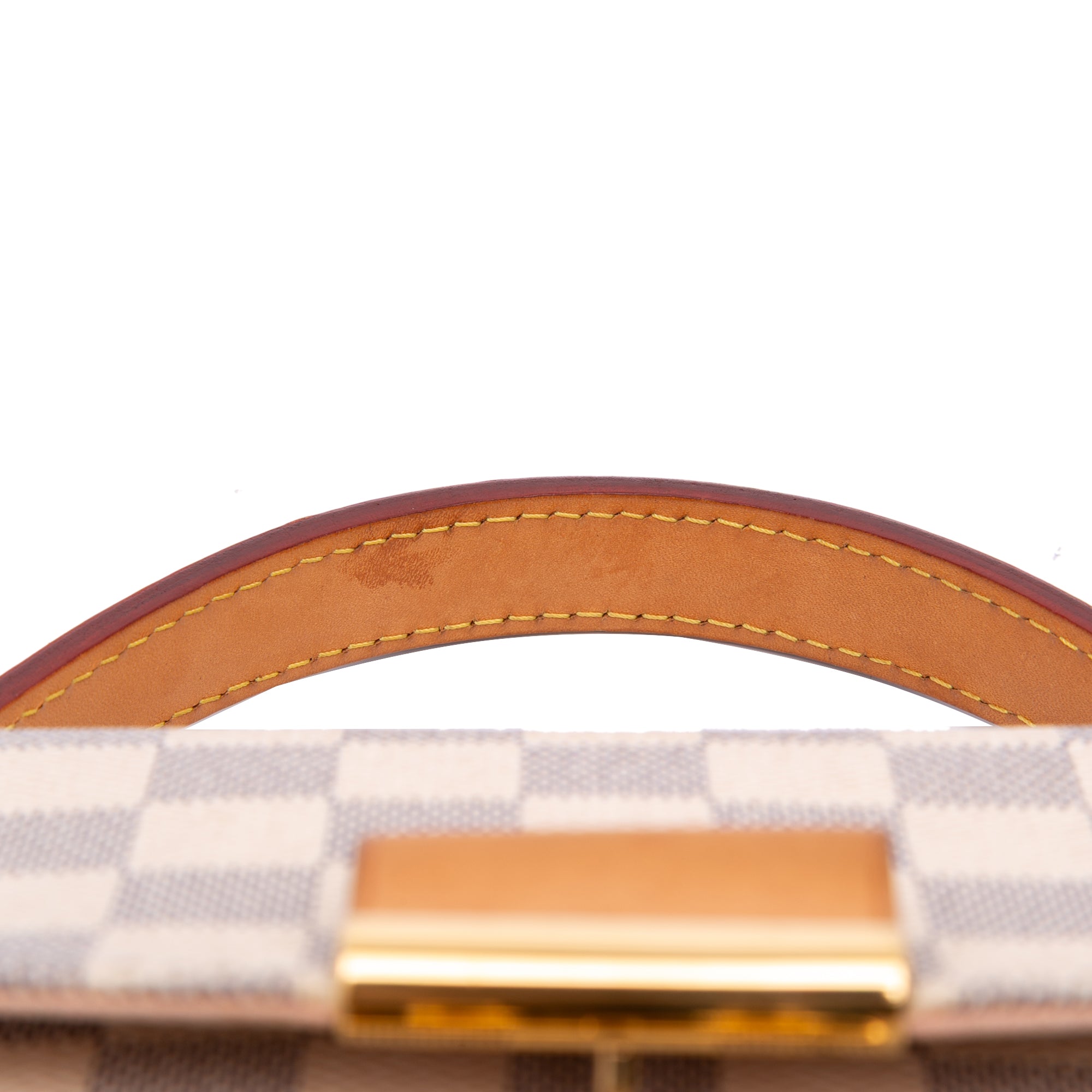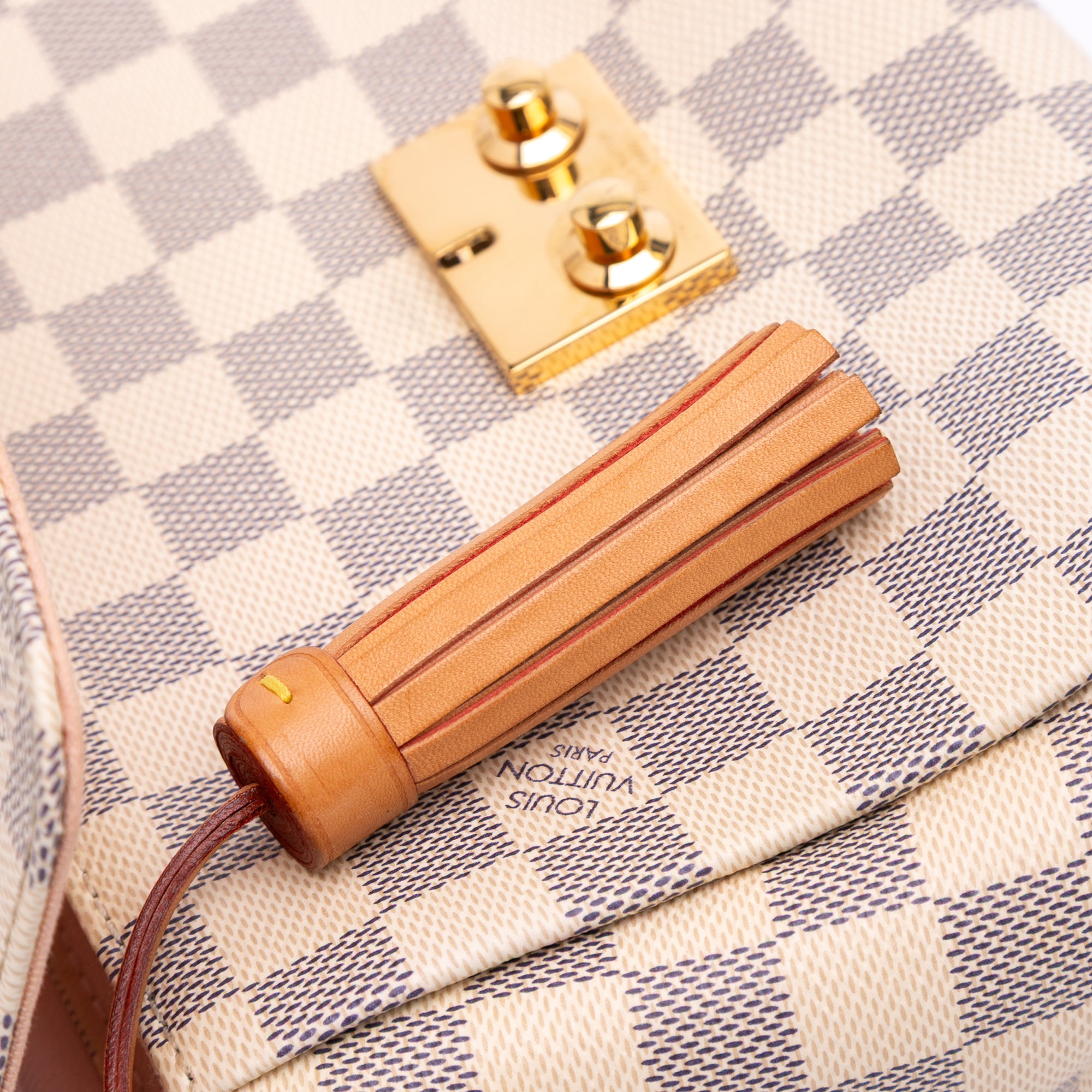The Croisette features a damier canvas body with vachetta leather trim, a leather tassel detail, a flat vachetta leather top handle, a detachable flat vachetta leather strap, a front flap with a gold-tone push-lock closure, and an interior slip pocket. Retail Price: 1960.00