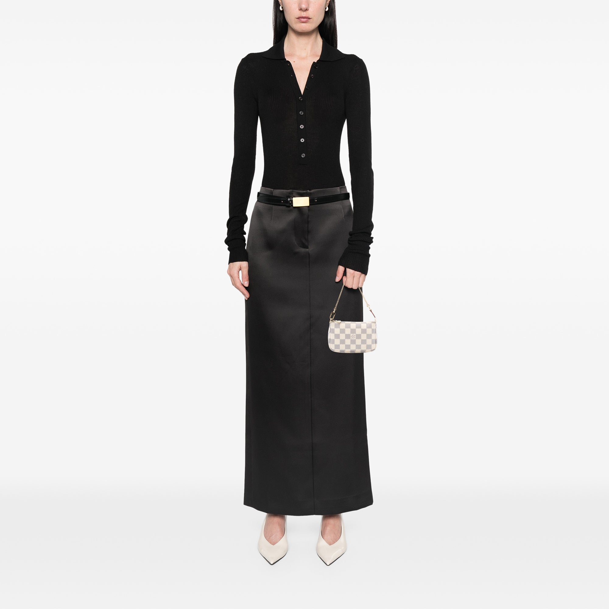 The Mini Pochette Accessoires features a damier canvas, a detachable chain strap, and a top zip closure. Retail Price: 753.00