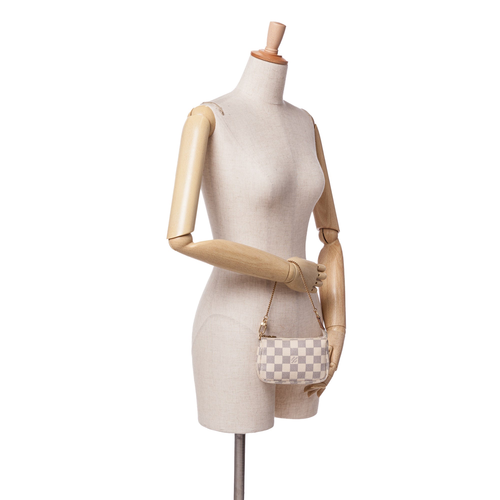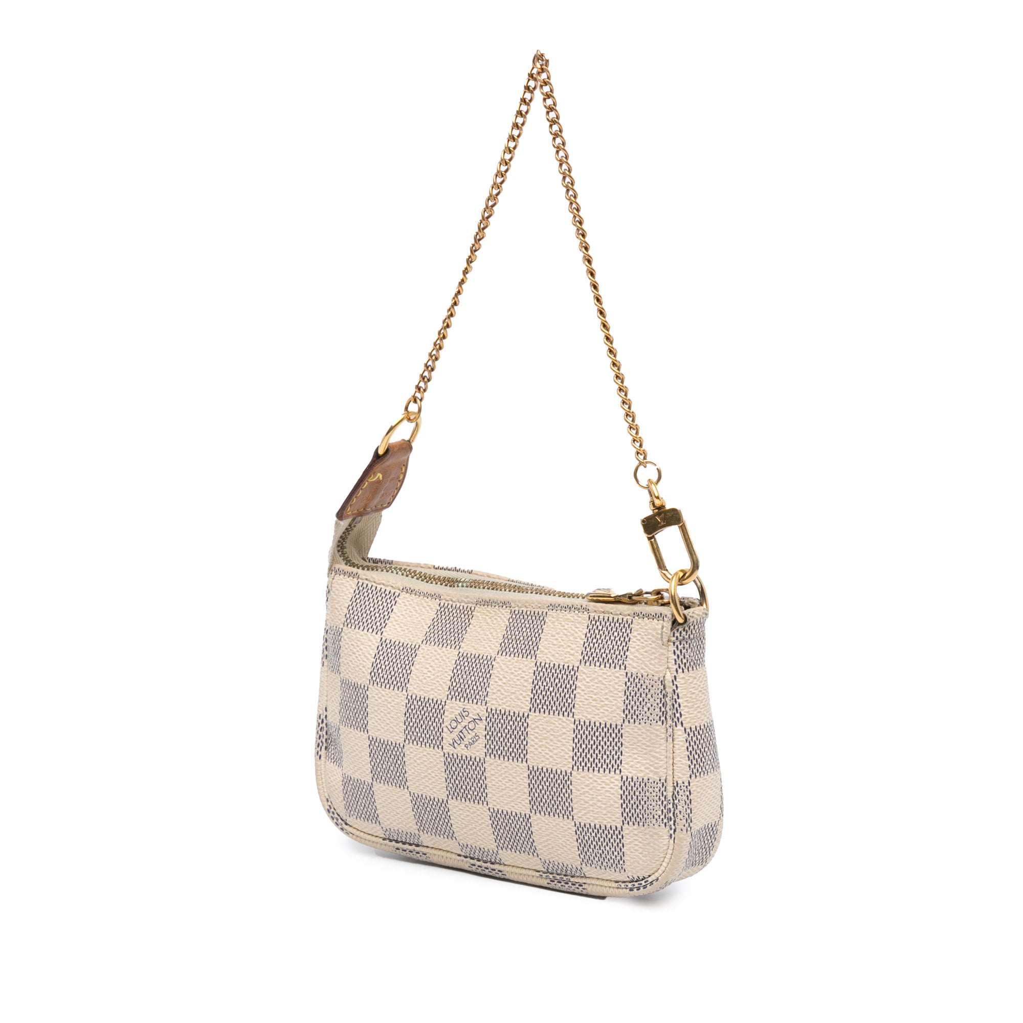 The Mini Pochette Accessoires features a damier azur canvas body, a chain link strap, and a top zip closure. Retail Price: 753.00