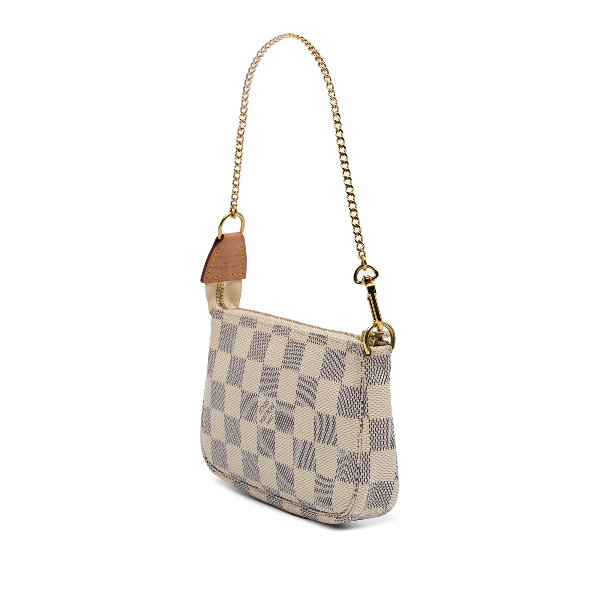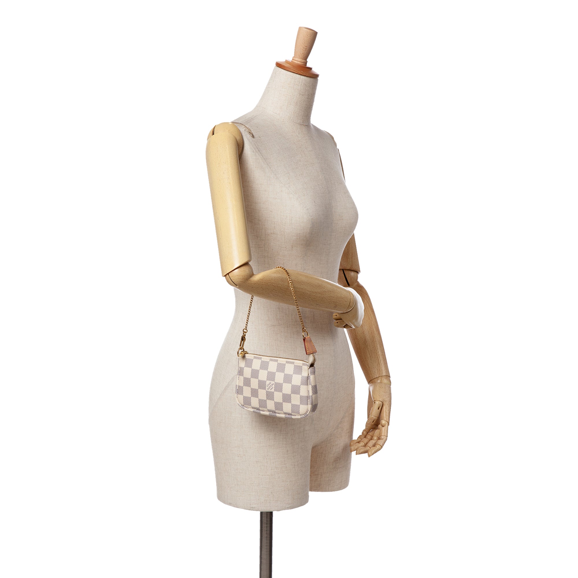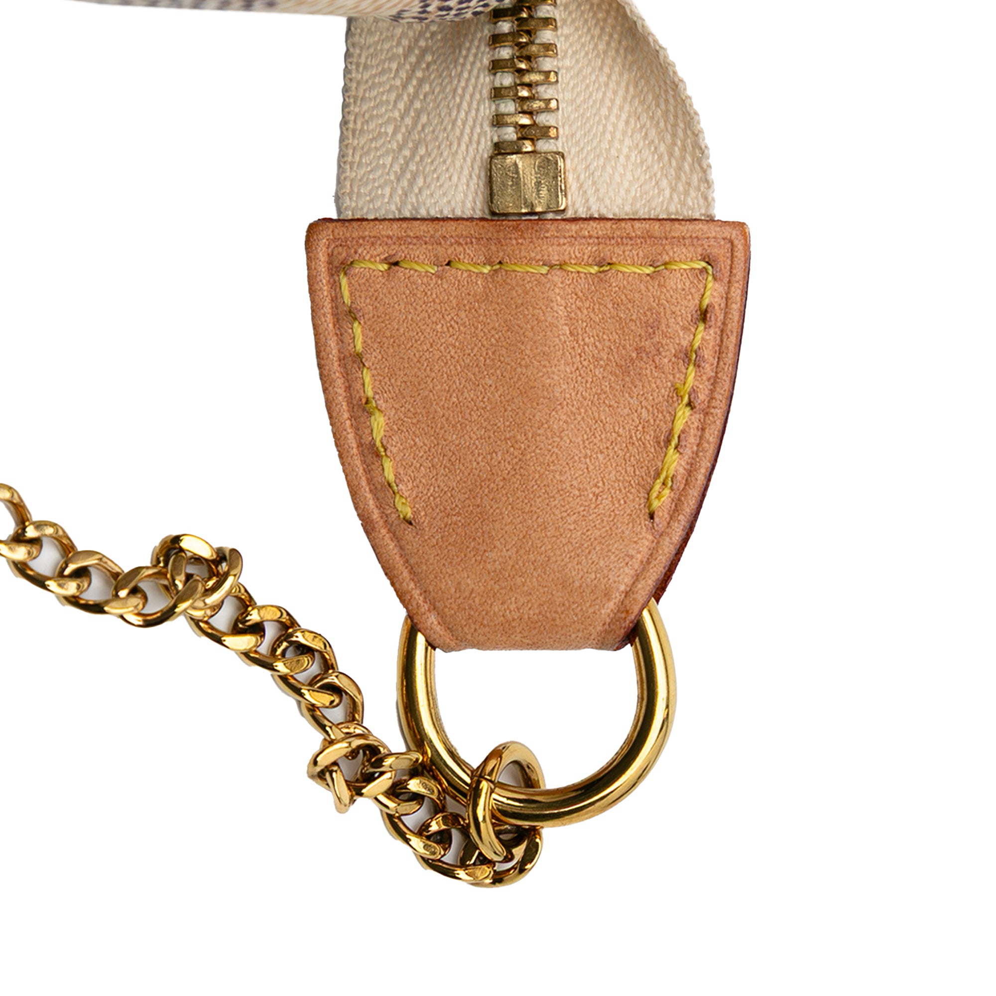 The Mini Pochette Accessoires features a damier azur canvas body, a detachable chain link handle, and a top zip closure. Retail Price: 753.00