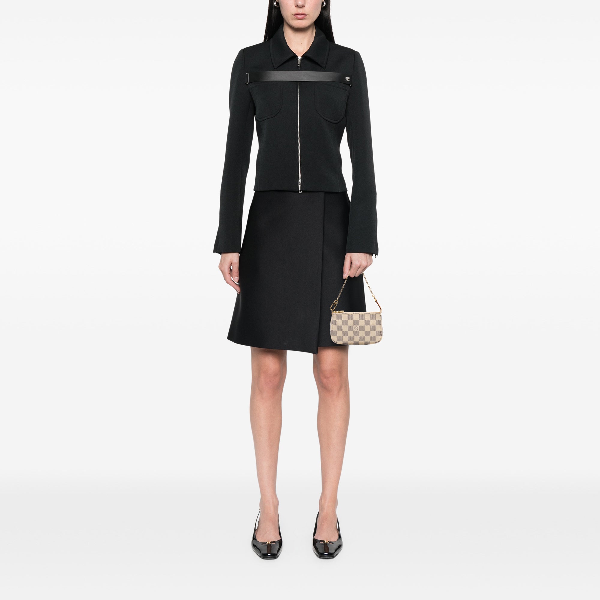 The Mini Pochette Accessoires features a damier canvas body, a detachable chain strap, and a top zip closure. Retail Price: 760.00