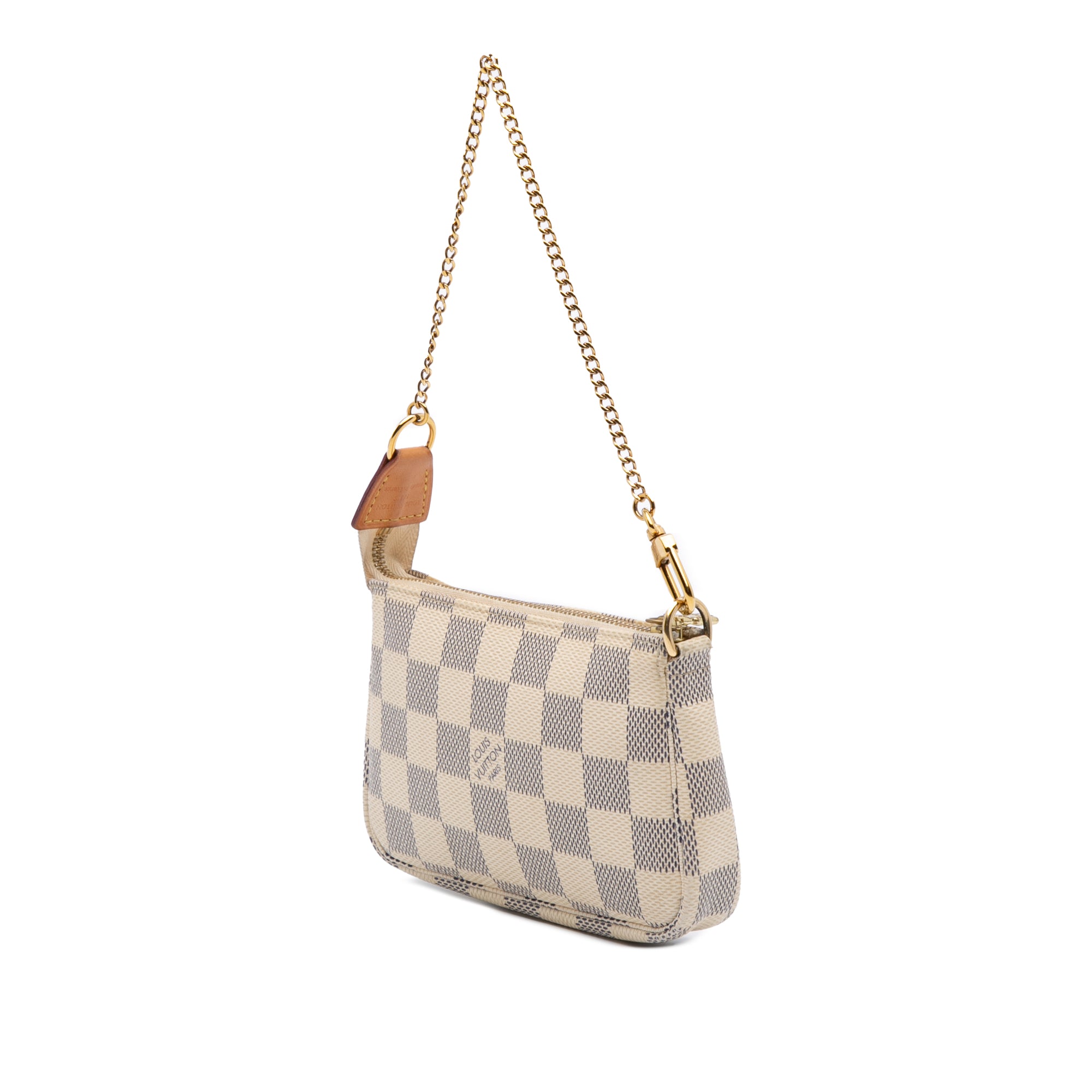 The Mini Pochette Accessoires features a damier azur canvas body, a detachable chain link handle, and a top zip closure. Retail Price: 753.00