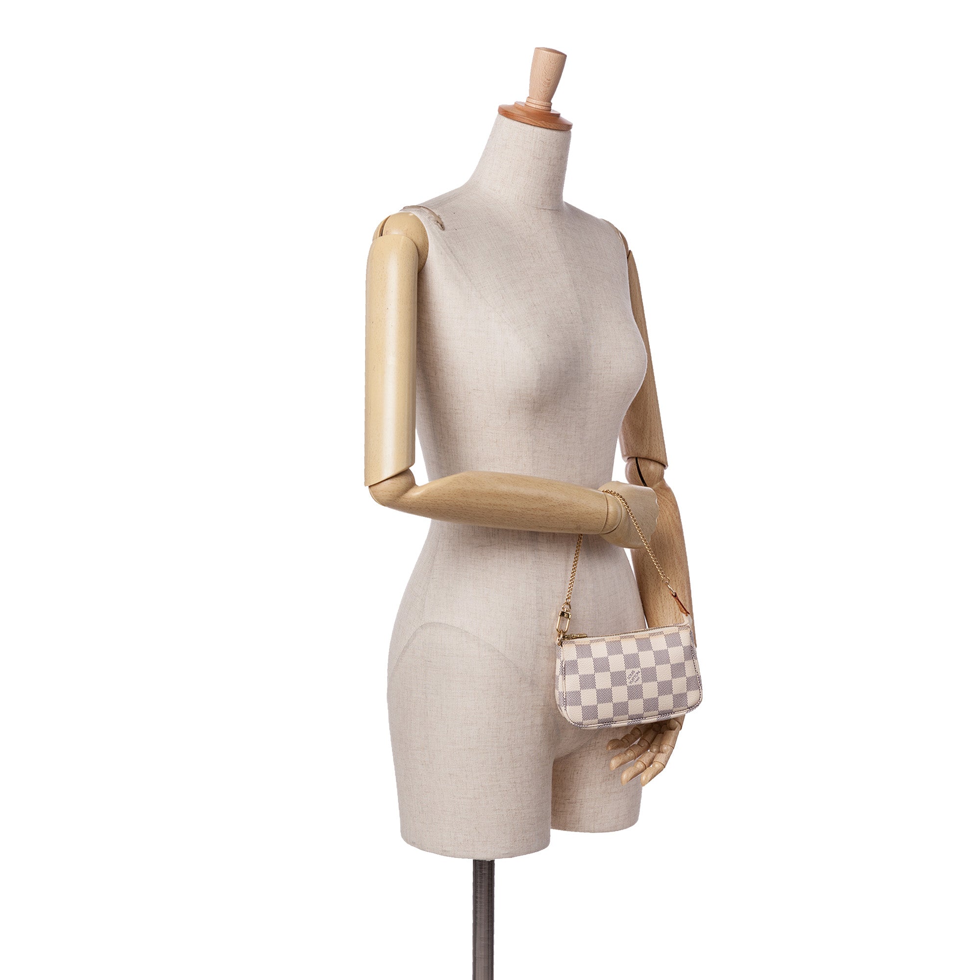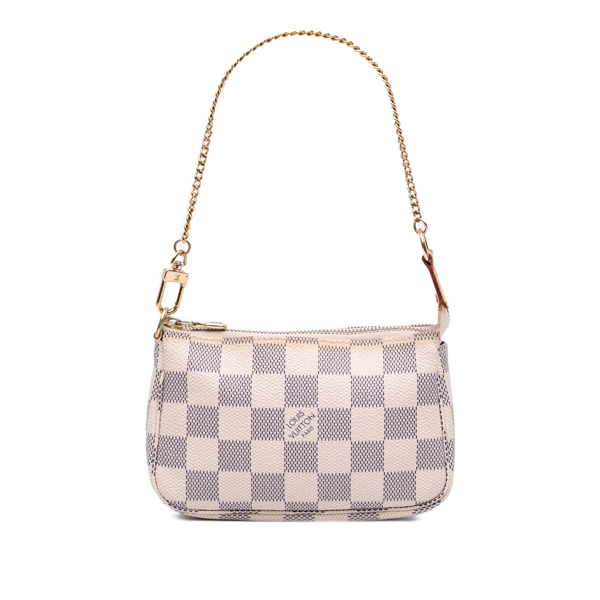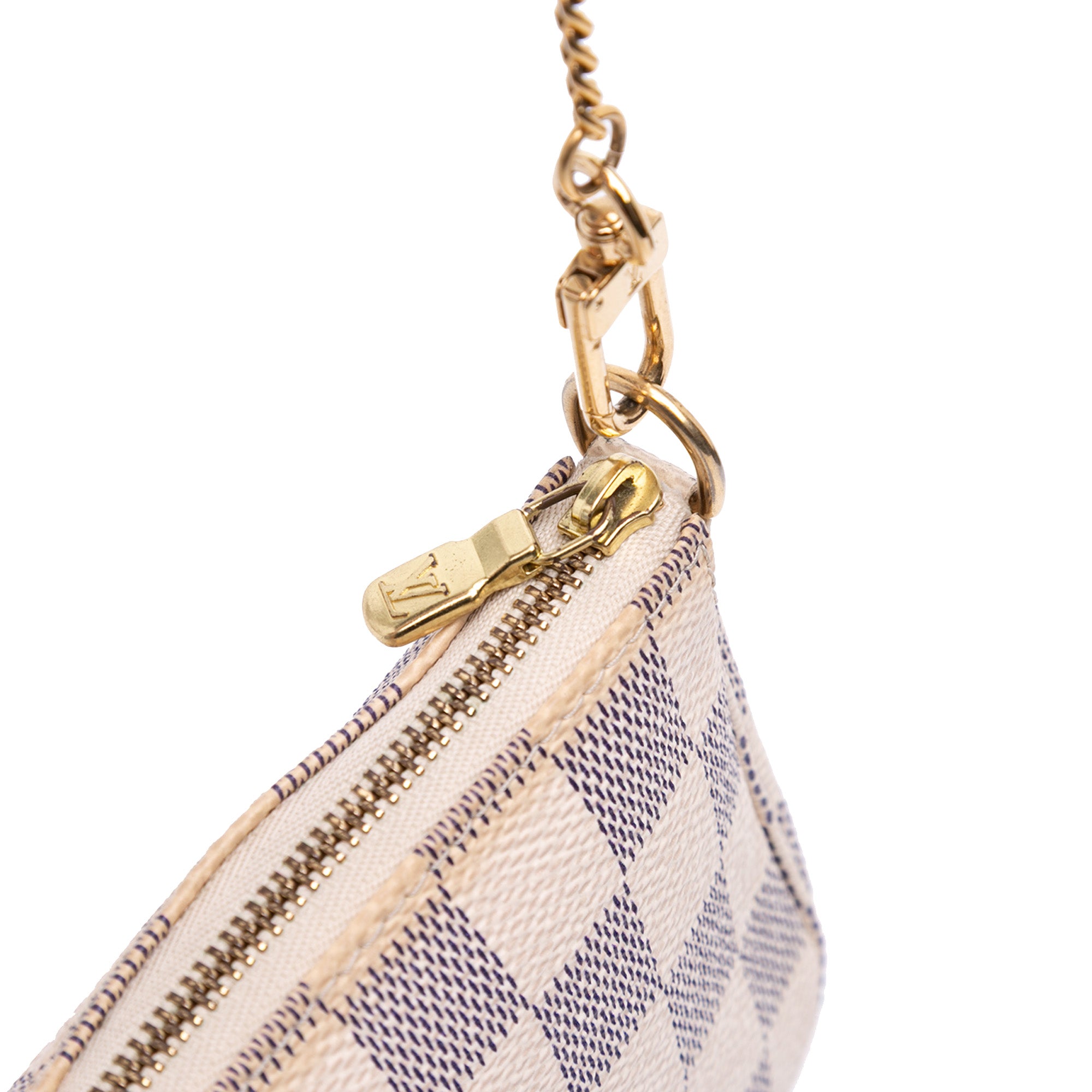 The Mini Pochette Accessoires features a damier azur canvas, a detachable chain link strap, and a top zip closure. Retail Price: 770.00