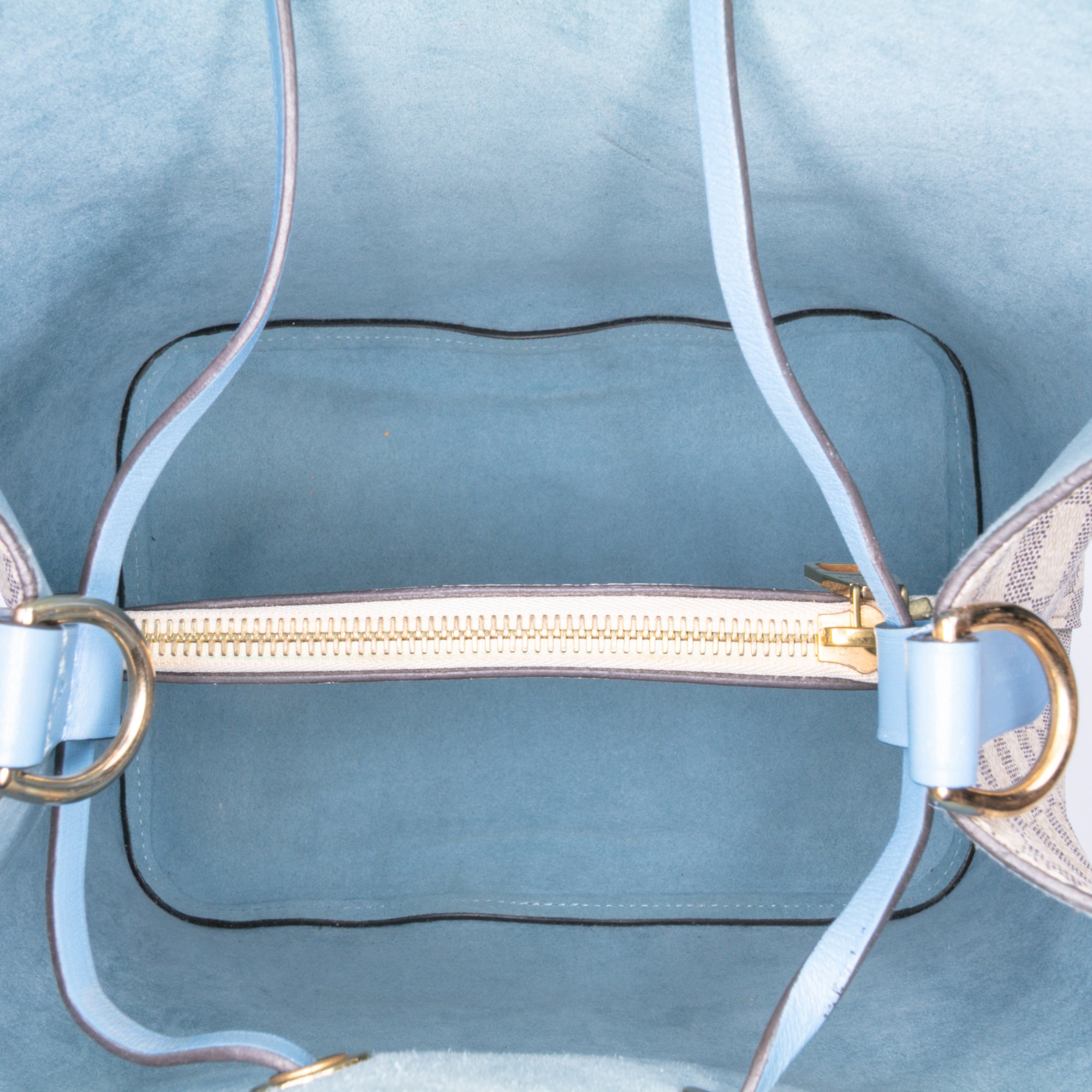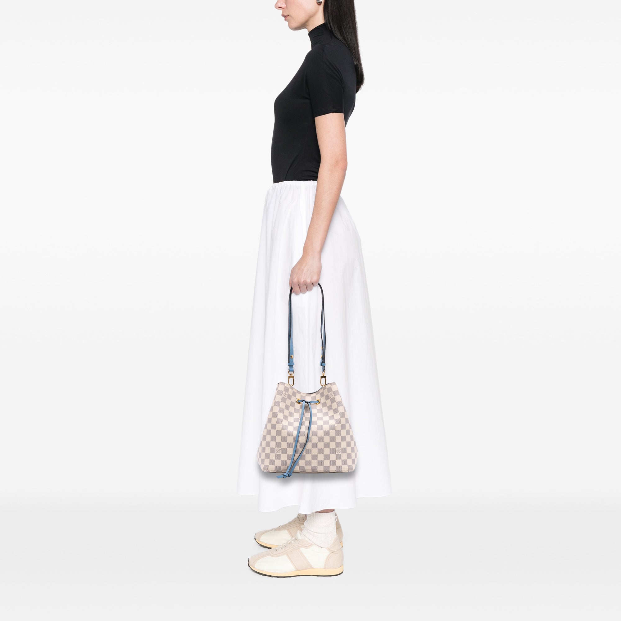 The Neonoe features a damier azur canvas body, an adjustable flat leather strap, a top drawstring closure, and an interior zip pocket. Retail Price: 2250.00