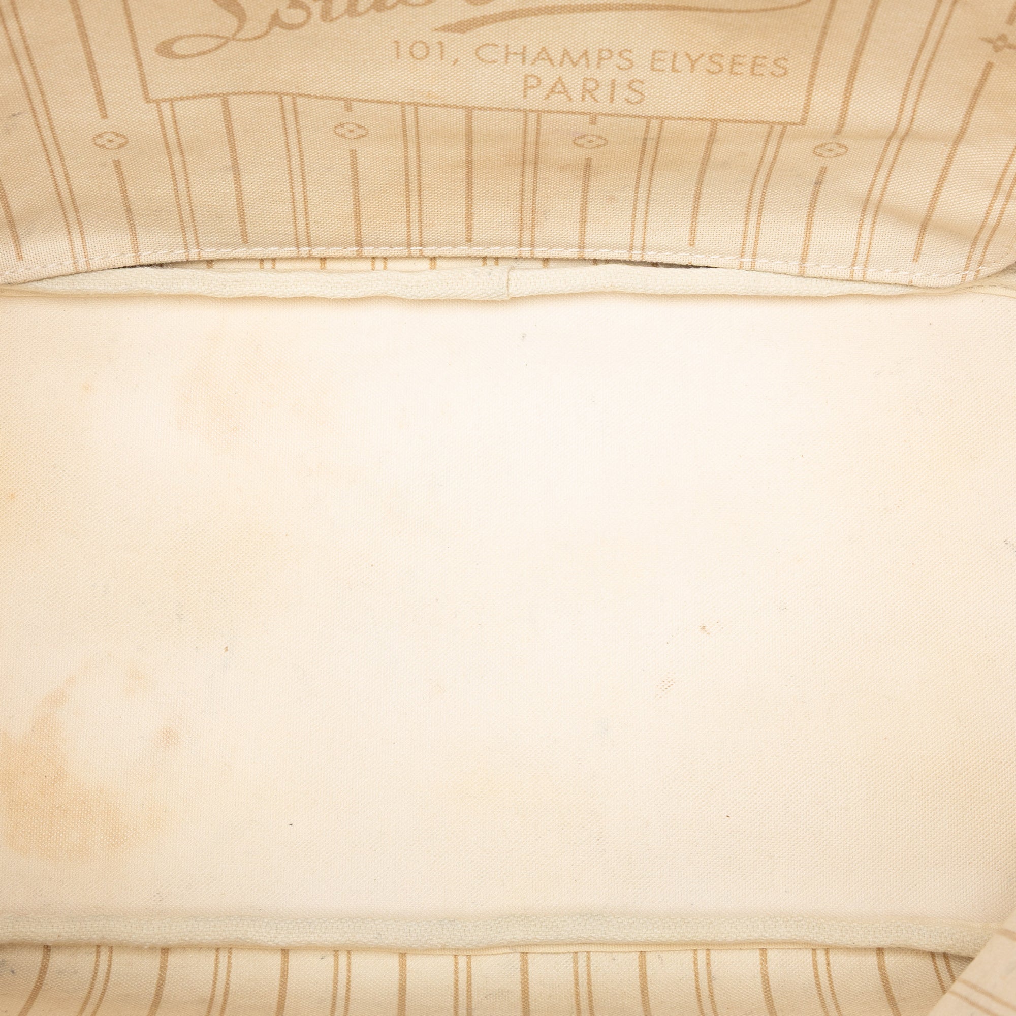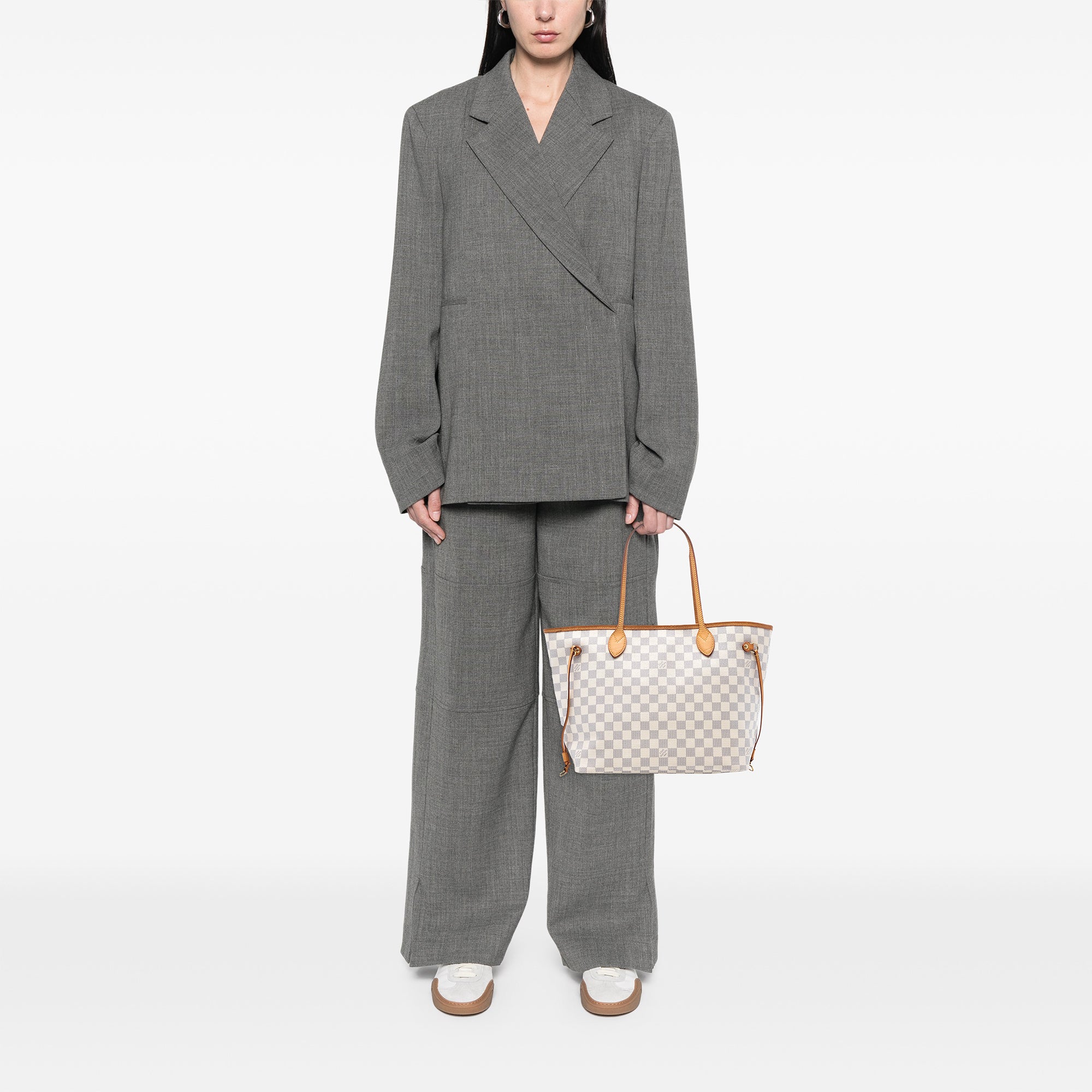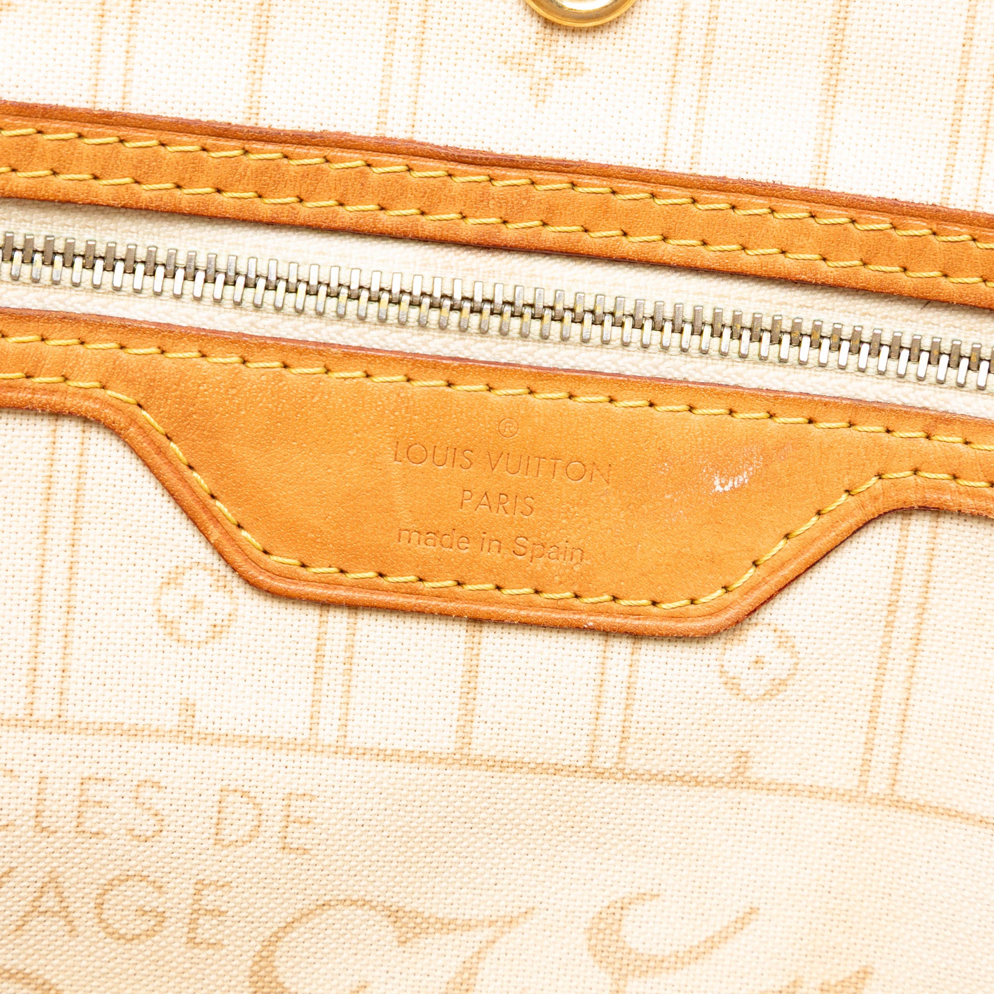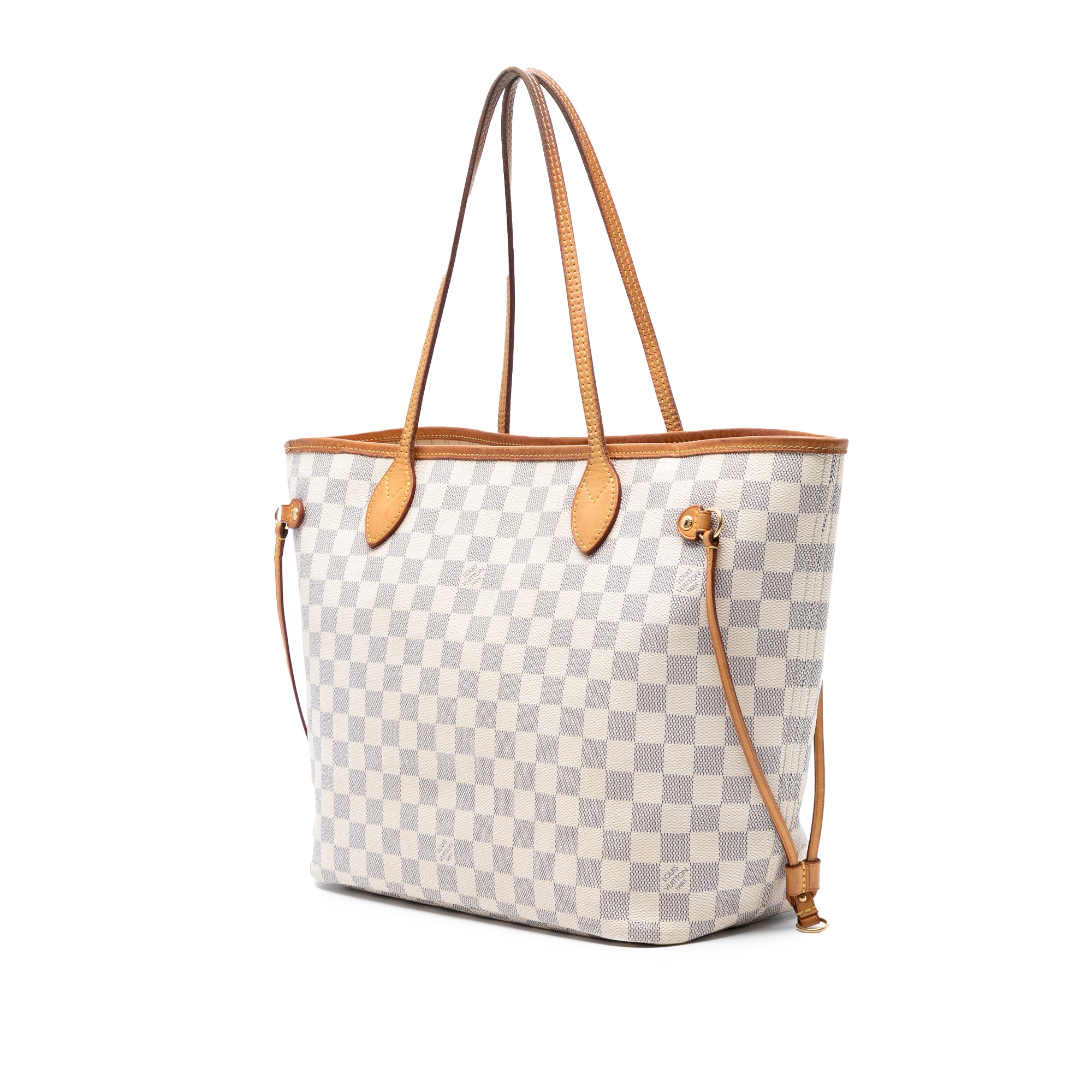The Neverfull MM features a damier azur canvas body with vachetta leather trim, flat vachetta leather straps, an open top with a lobster clasp closure, and an interior zip pocket. Retail Price: 1963.00