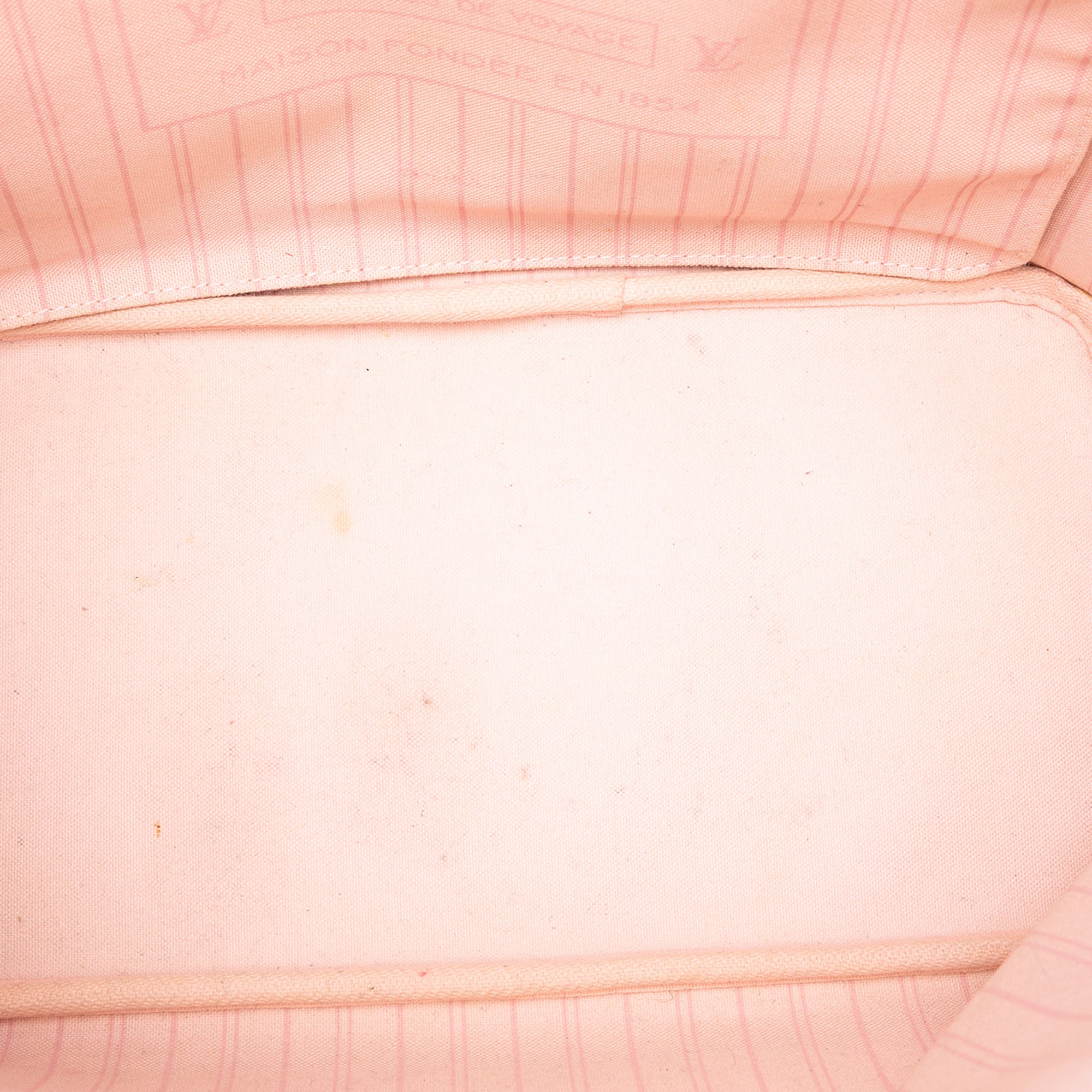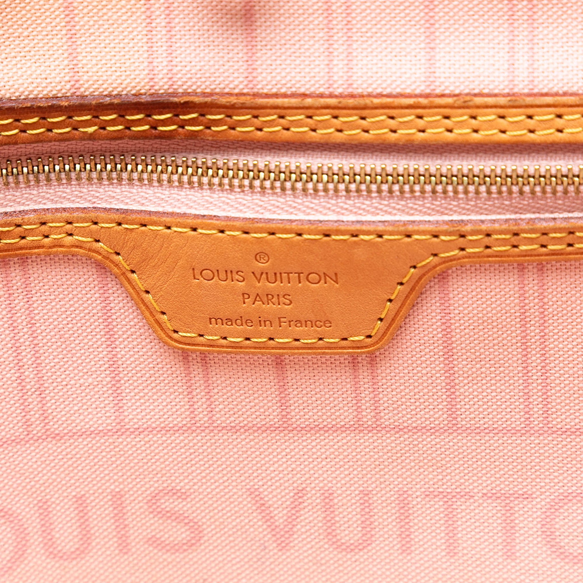 The Neverfull MM features a damier azur canvas body with vachetta leather trim, flat vachetta leather straps, an open top with a lobster clasp closure, an interior zip pocket, and a pouch inclusion. Retail Price: 1963.00