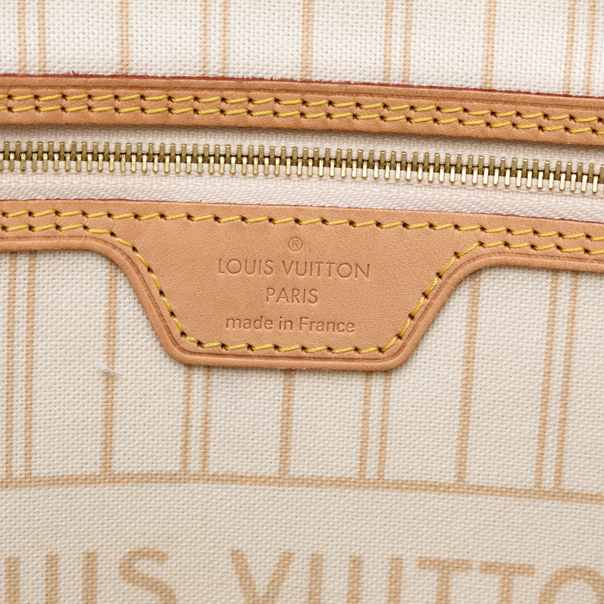 The Neverfull MM features a Damier Azur canvas body, flat vachetta leather handles, an open top with a lobster claw clasp, and an interior zip pocket. Retail Price: 1963.00