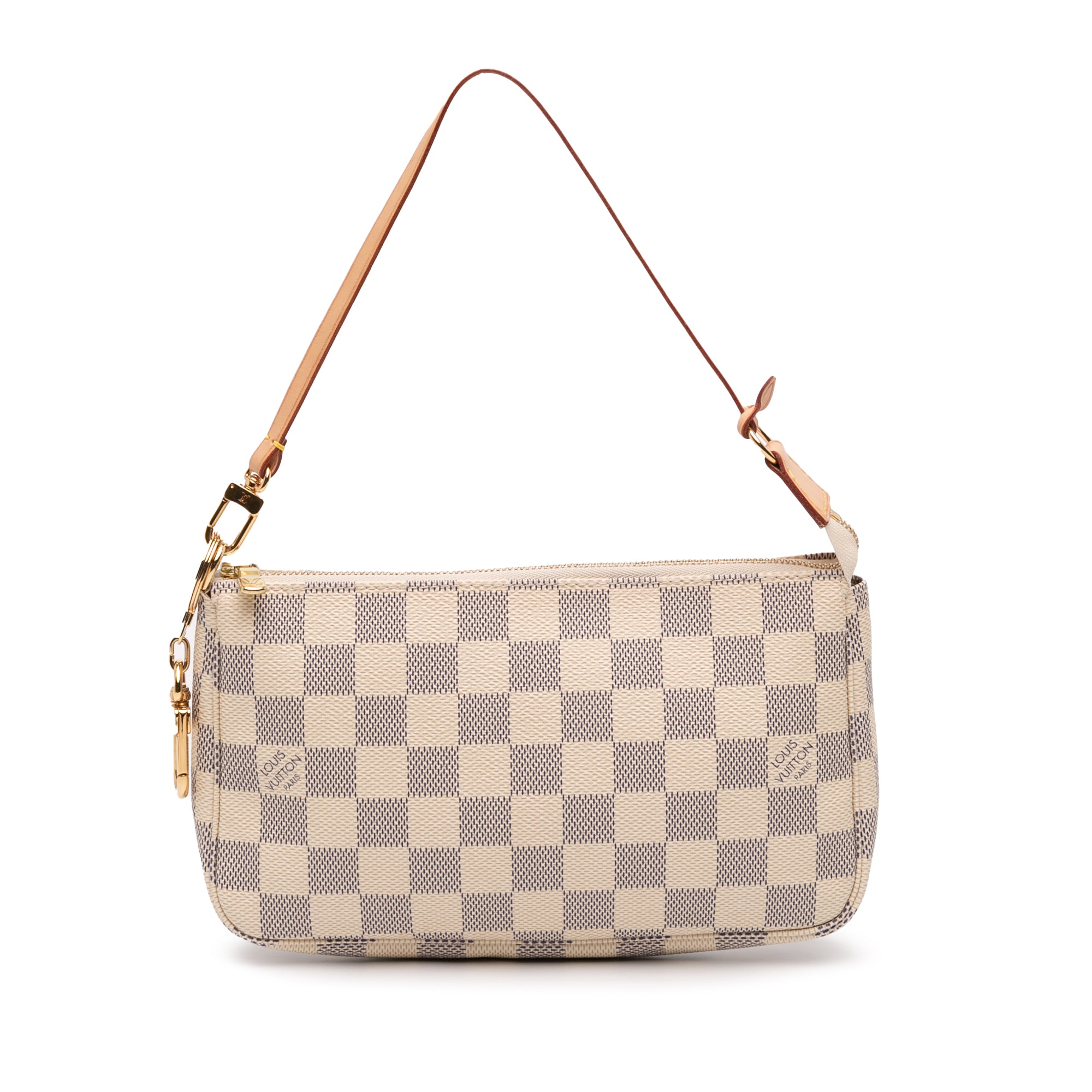 The Pochette Accessoires features a damier azur canvas body, a flat vachetta leather strap, and a top zip closure. Inclusion: Dust bag. Retail Price: 1290.00