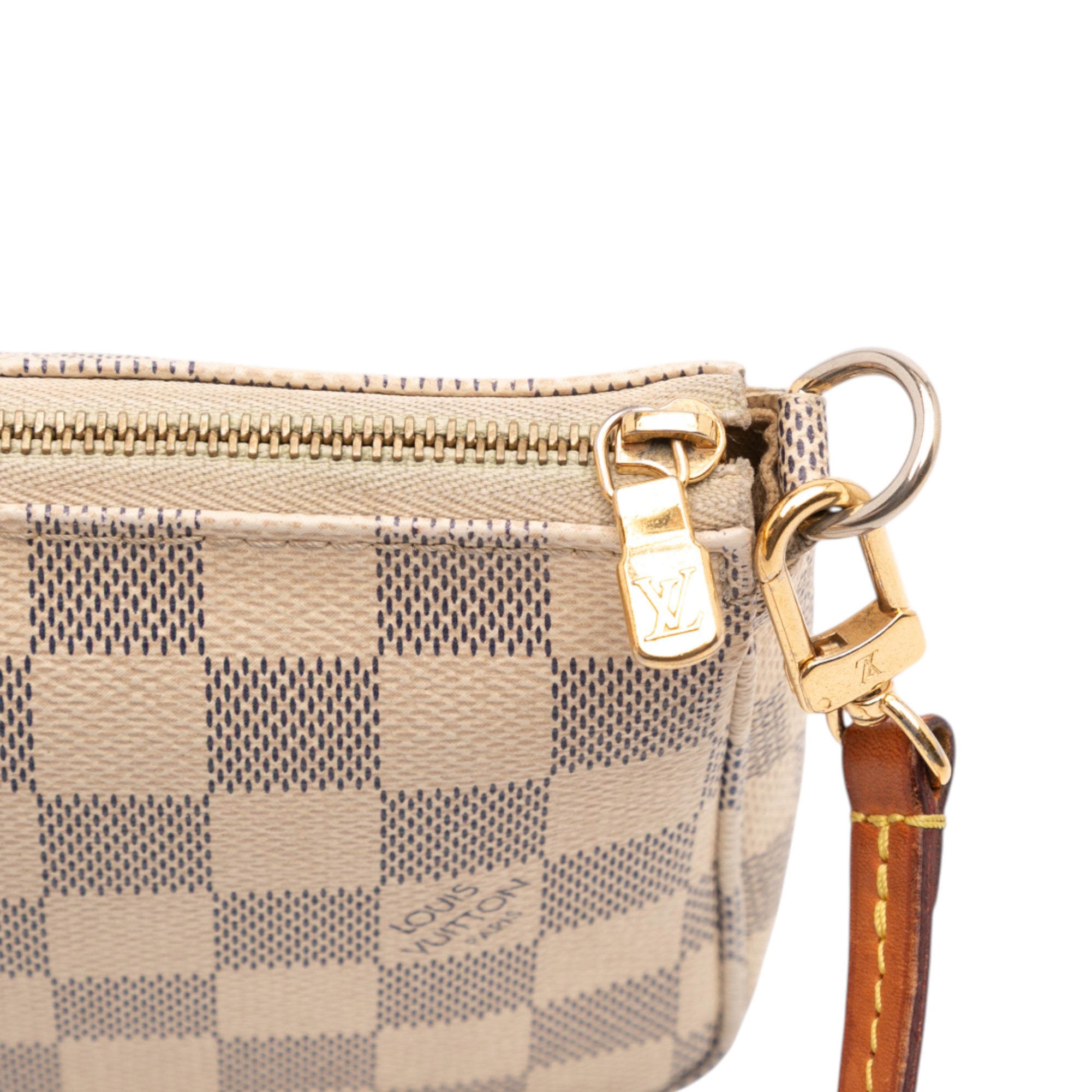 The Pochette Accessoires features a damier azur canvas body, a flat vachetta leather strap, a top zip closure, and an interior slip pocket. Retail Price: 1290.00