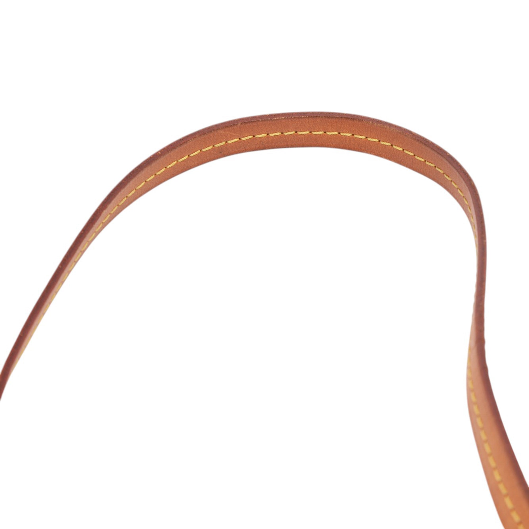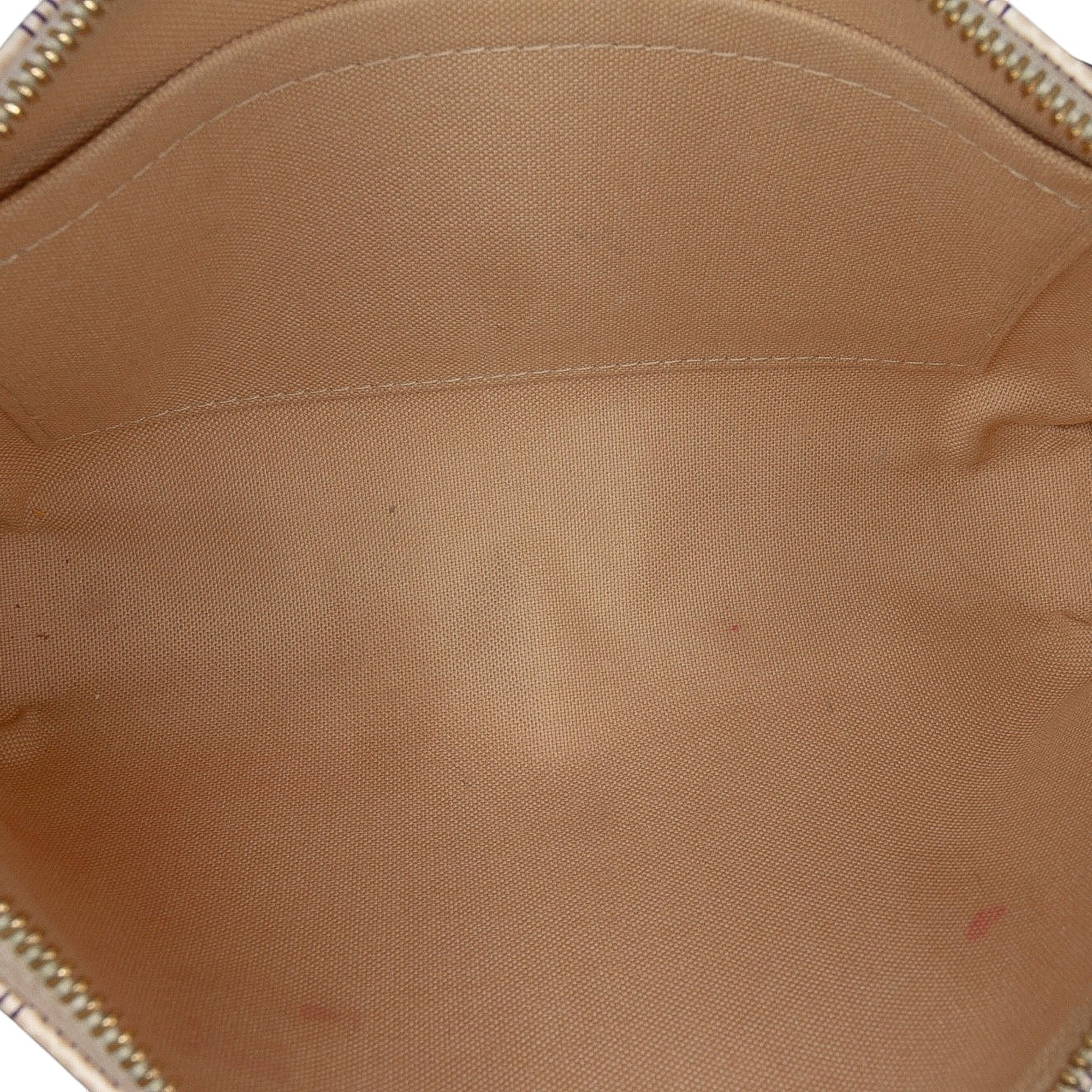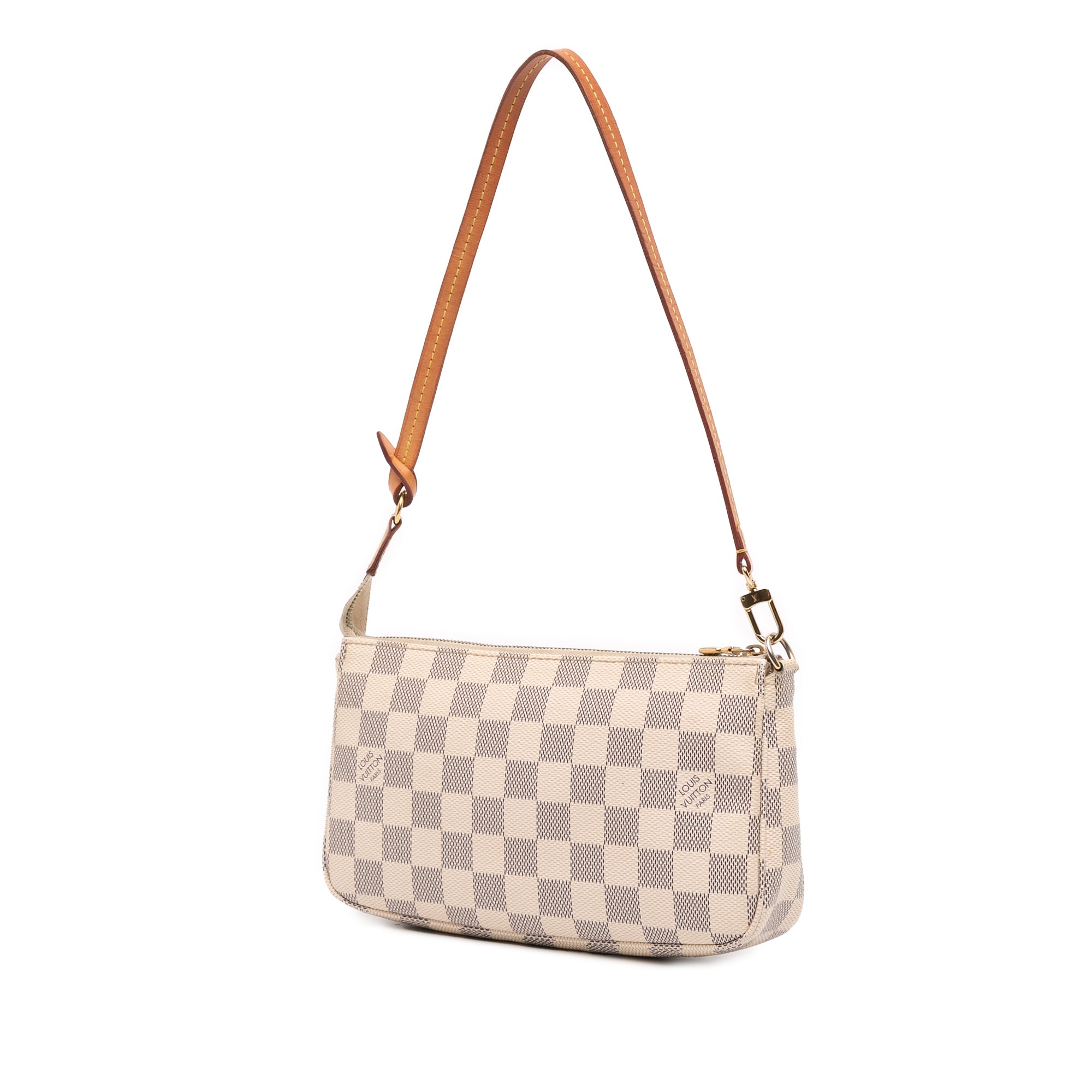 The Pochette Accessoires features a Damier Azur canvas body, a flat vachetta leather strap, and a top zip closure. Retail Price: 1290.00