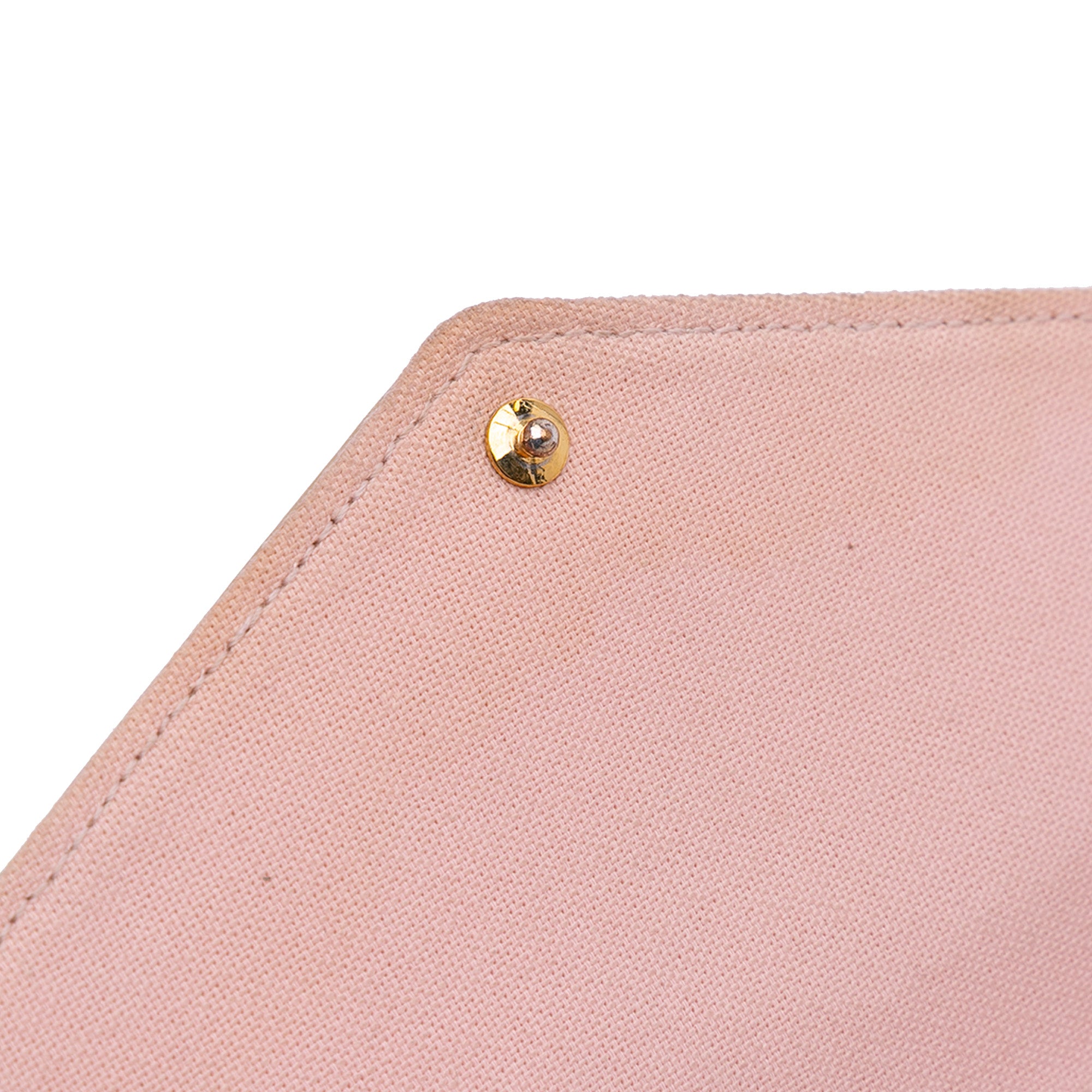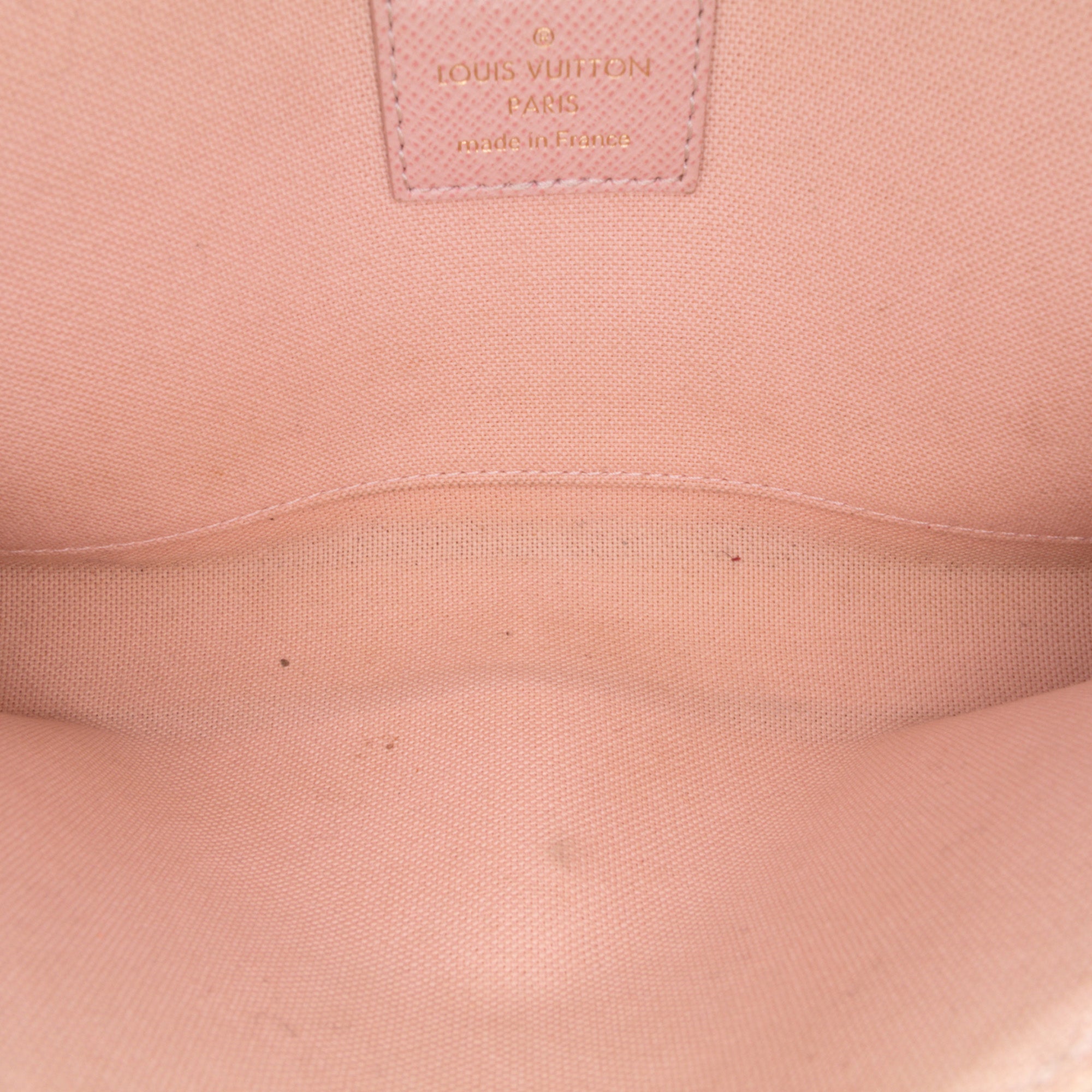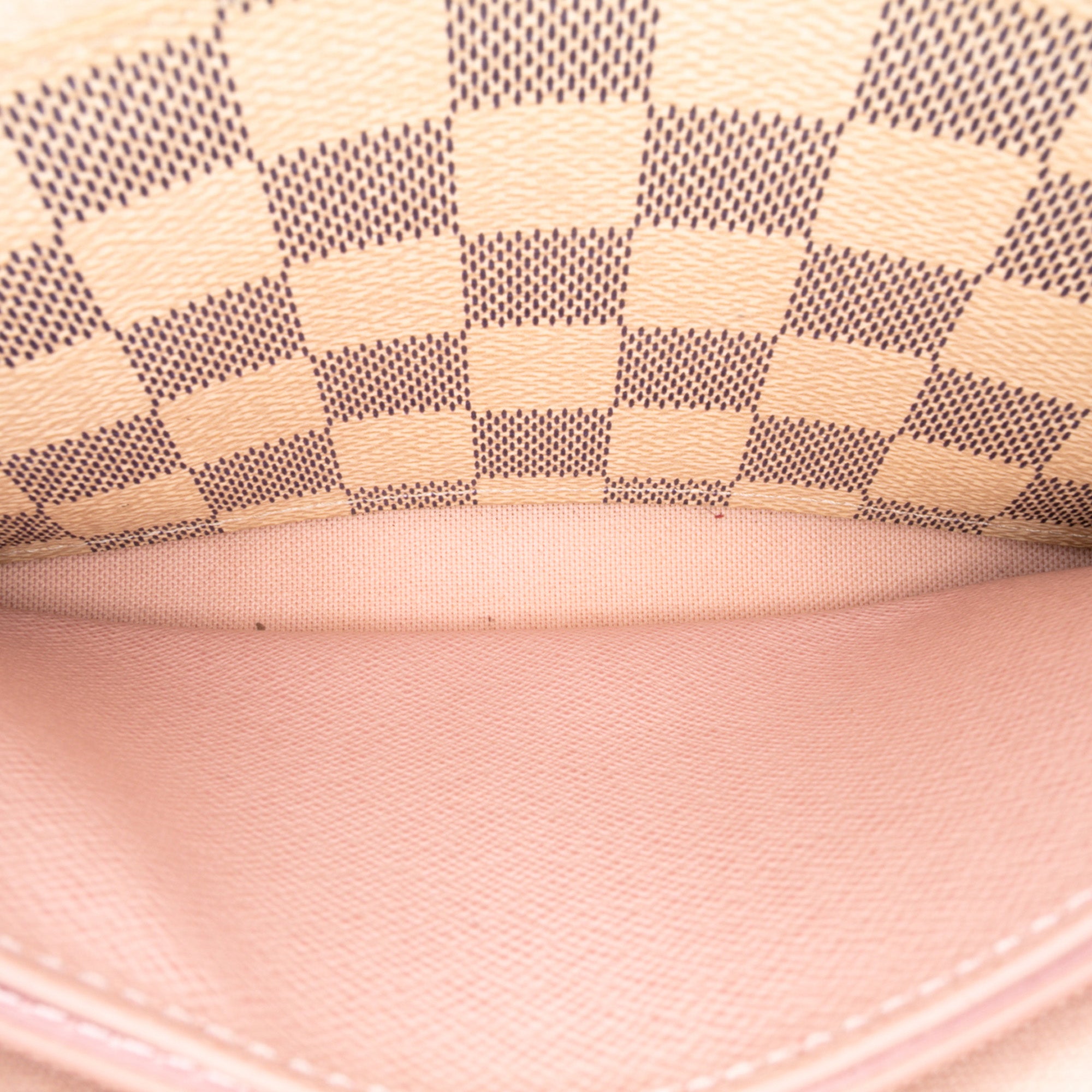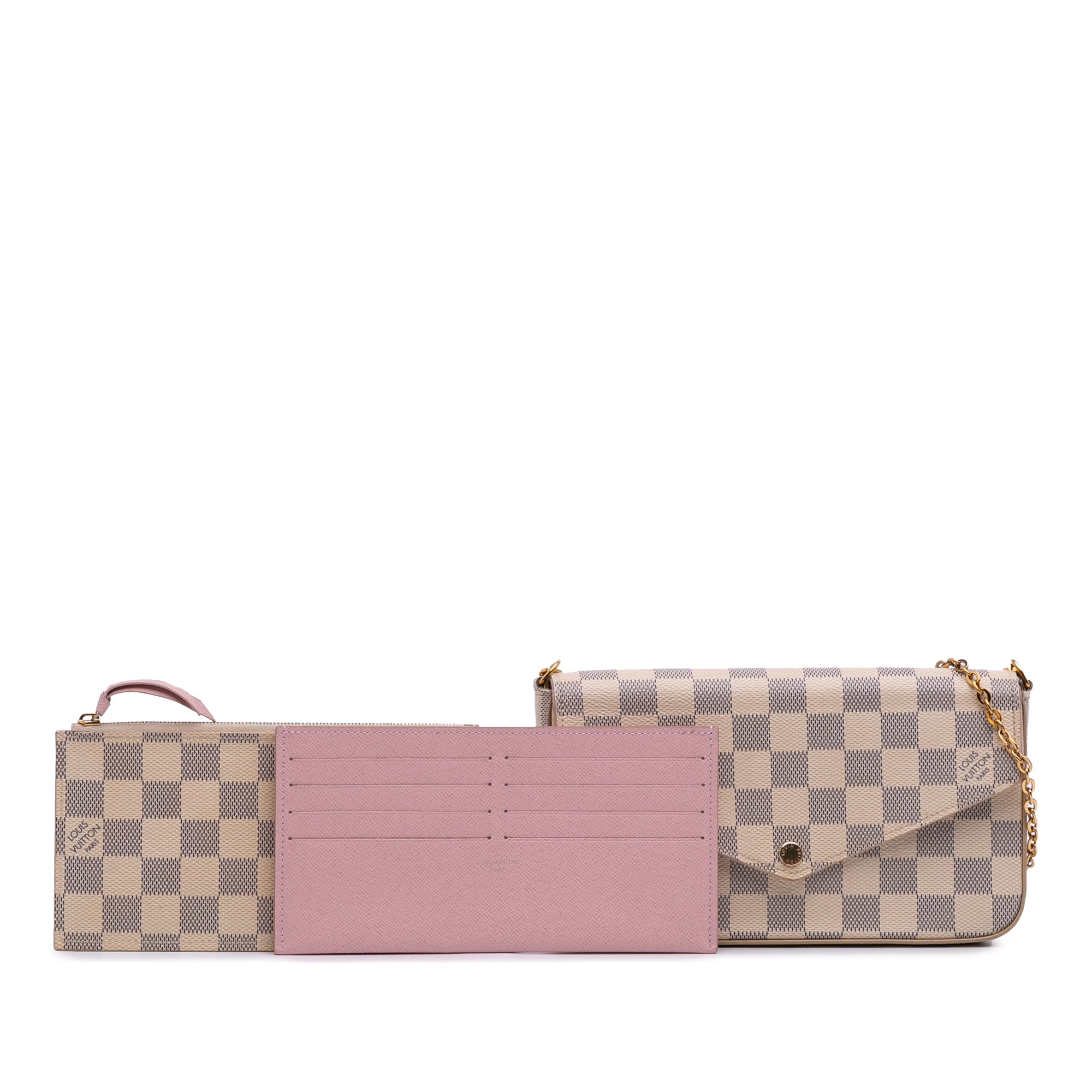 The Pochette Felicie crossbody bag features a damier azur canvas body, a detachable chain link shoulder strap, a front flap with a snap button closure, pouch inclusions, and an interior slip pocket. Retail Price: 2145.00
