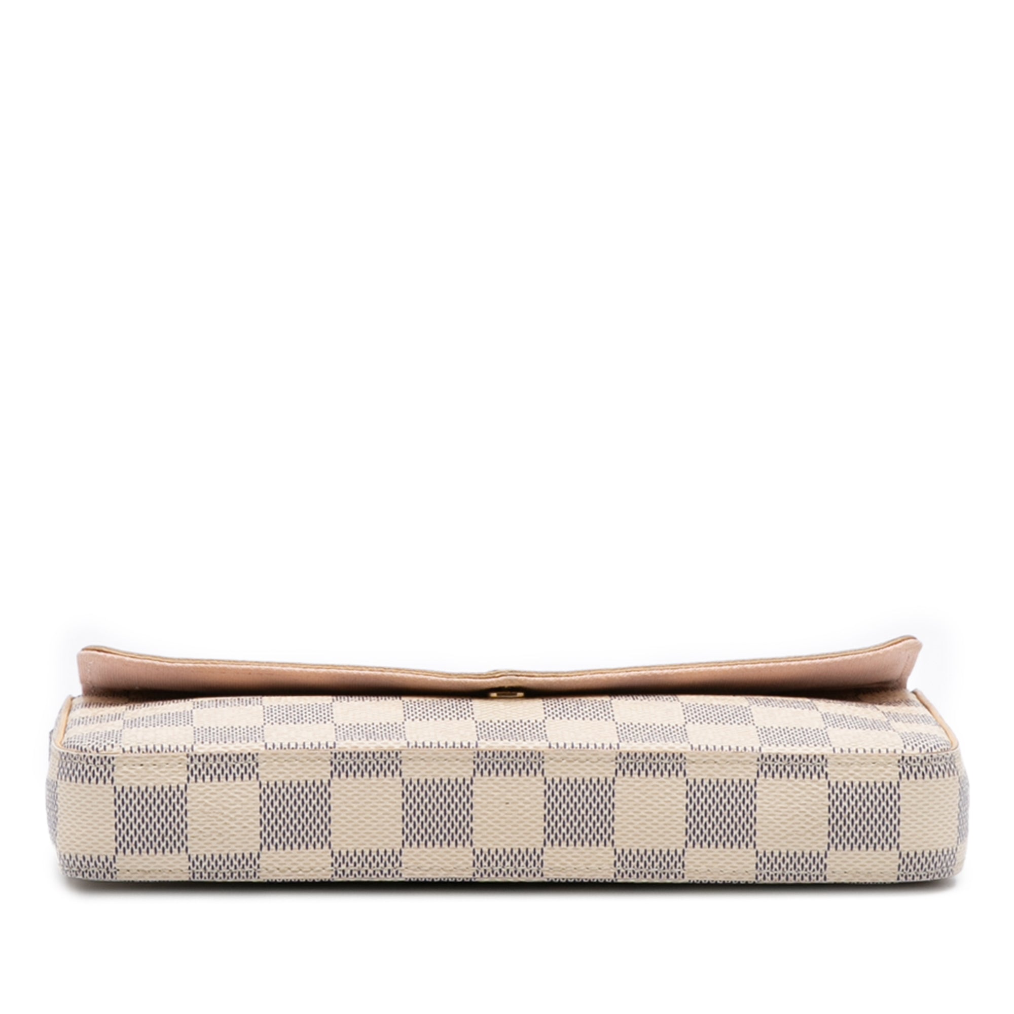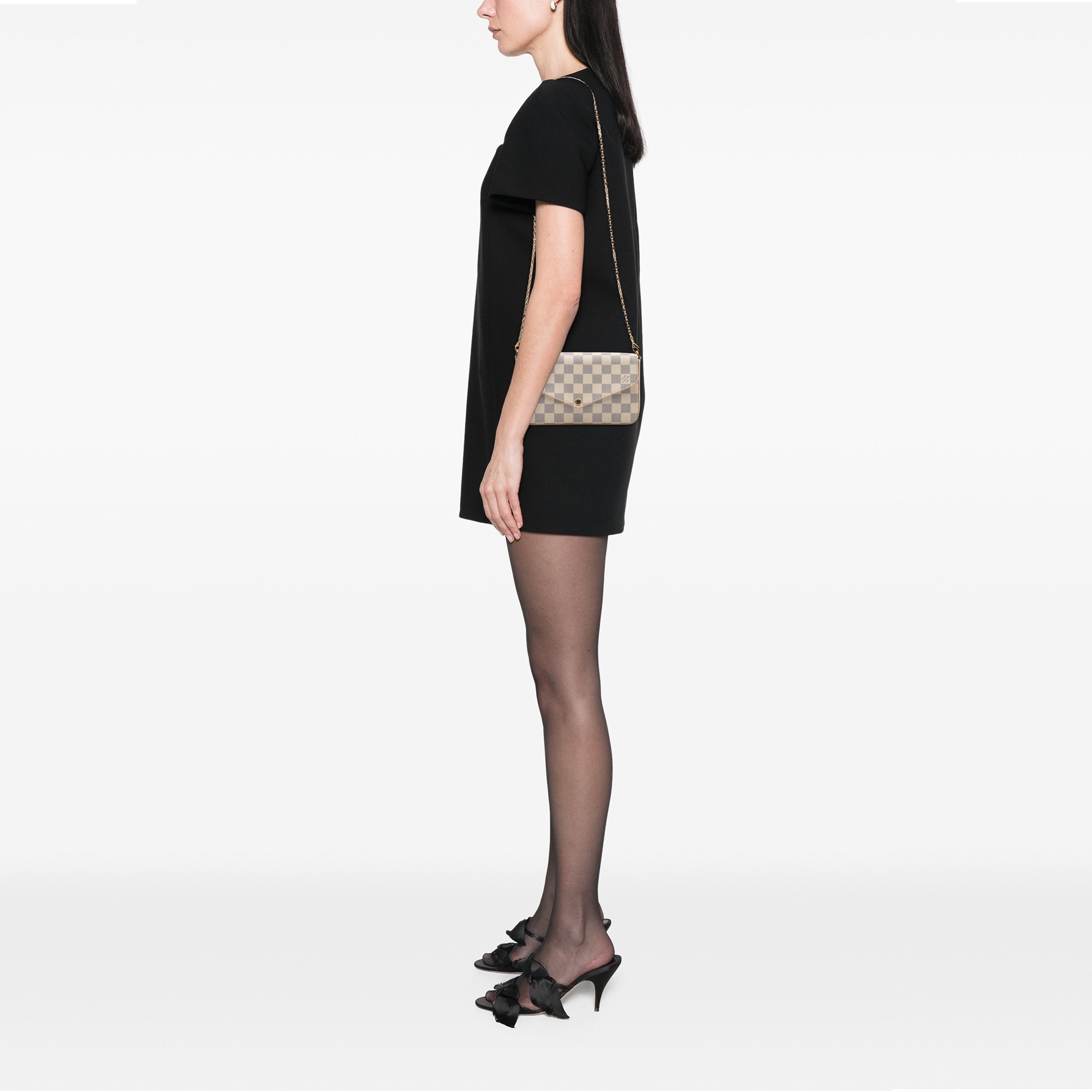 The Pochette Felicie features a damier azur canvas body, a detachable chain link strap, a front flap with snap button closure, an interior slip pocket, and pouch inclusions. Retail Price: 1550.00