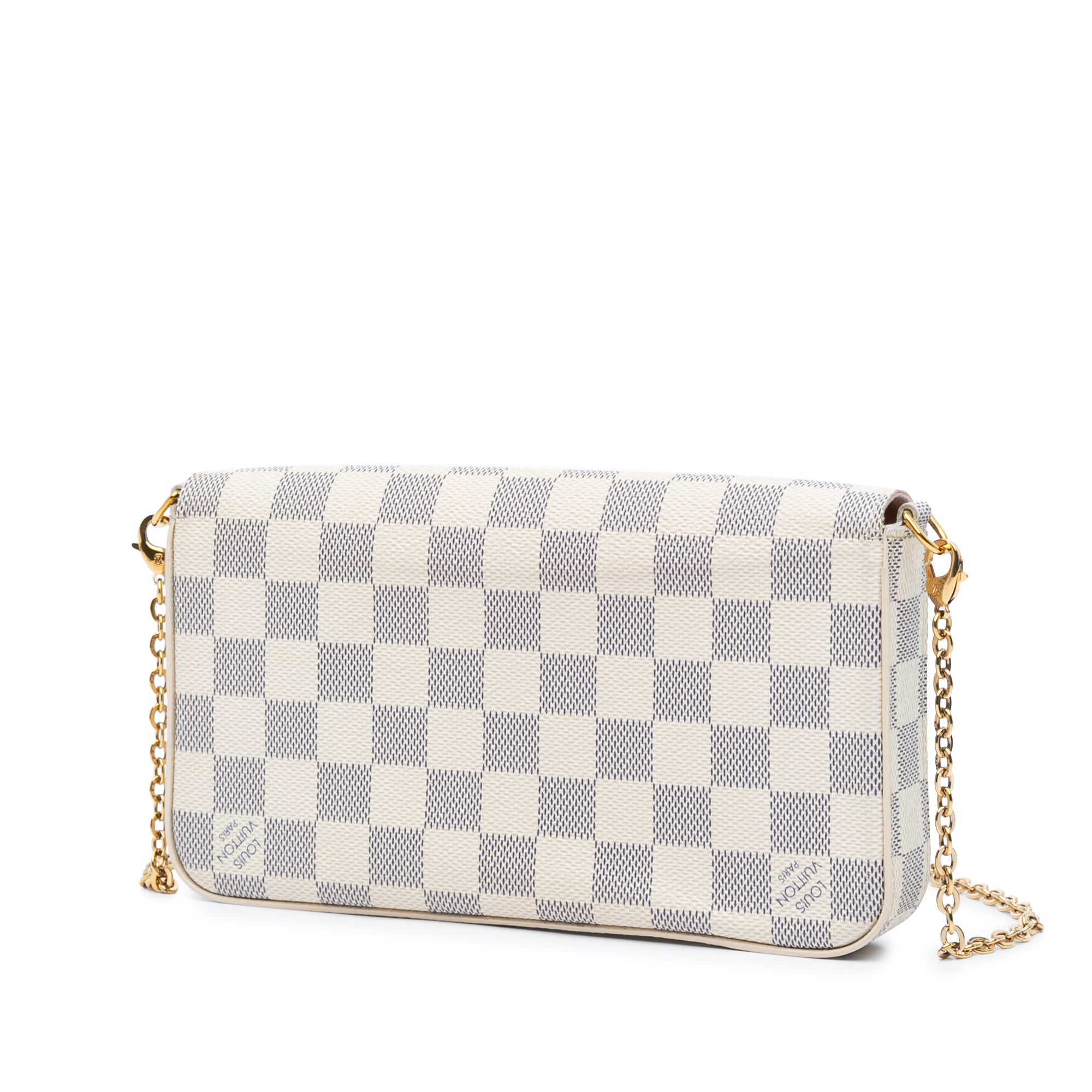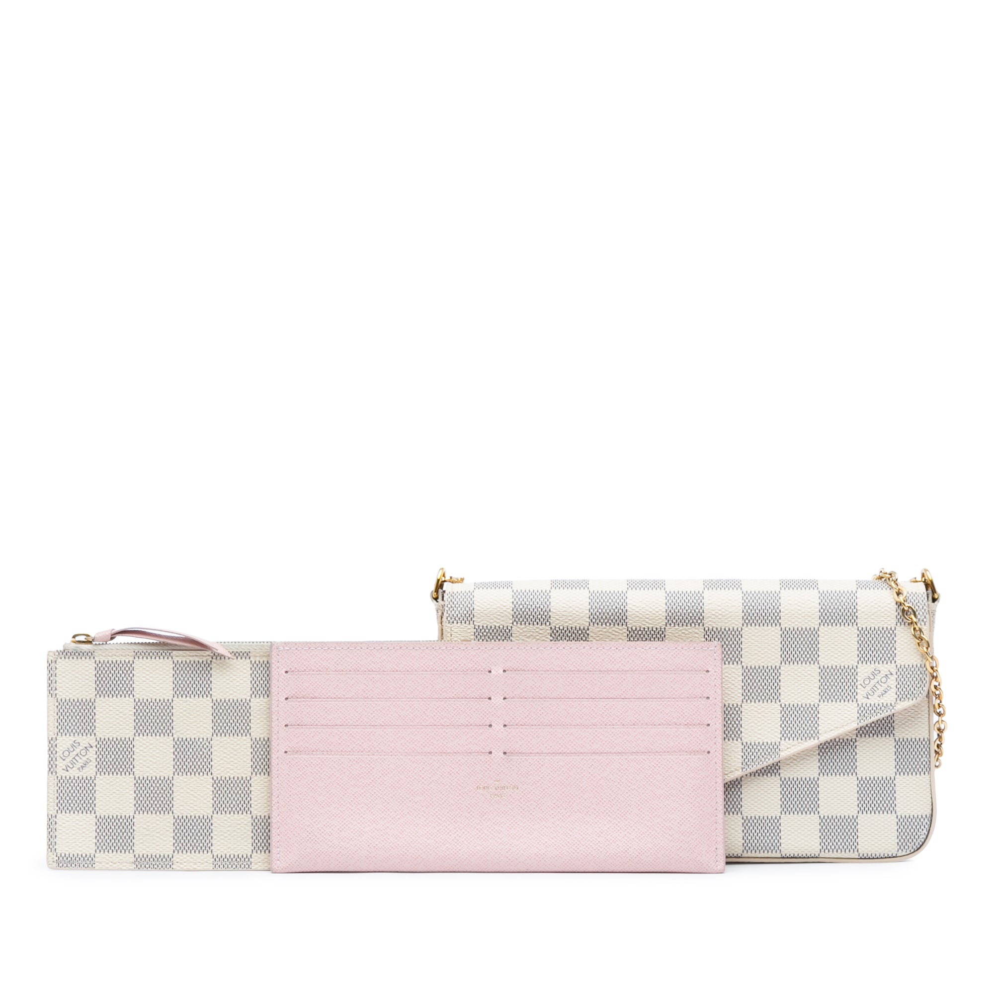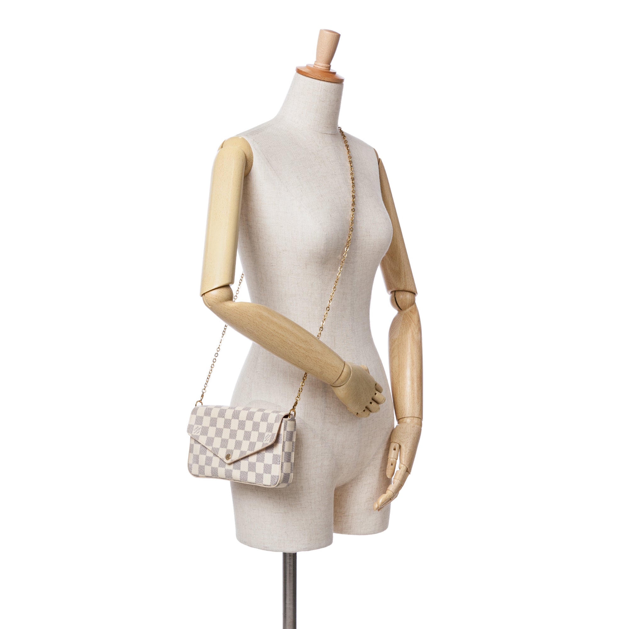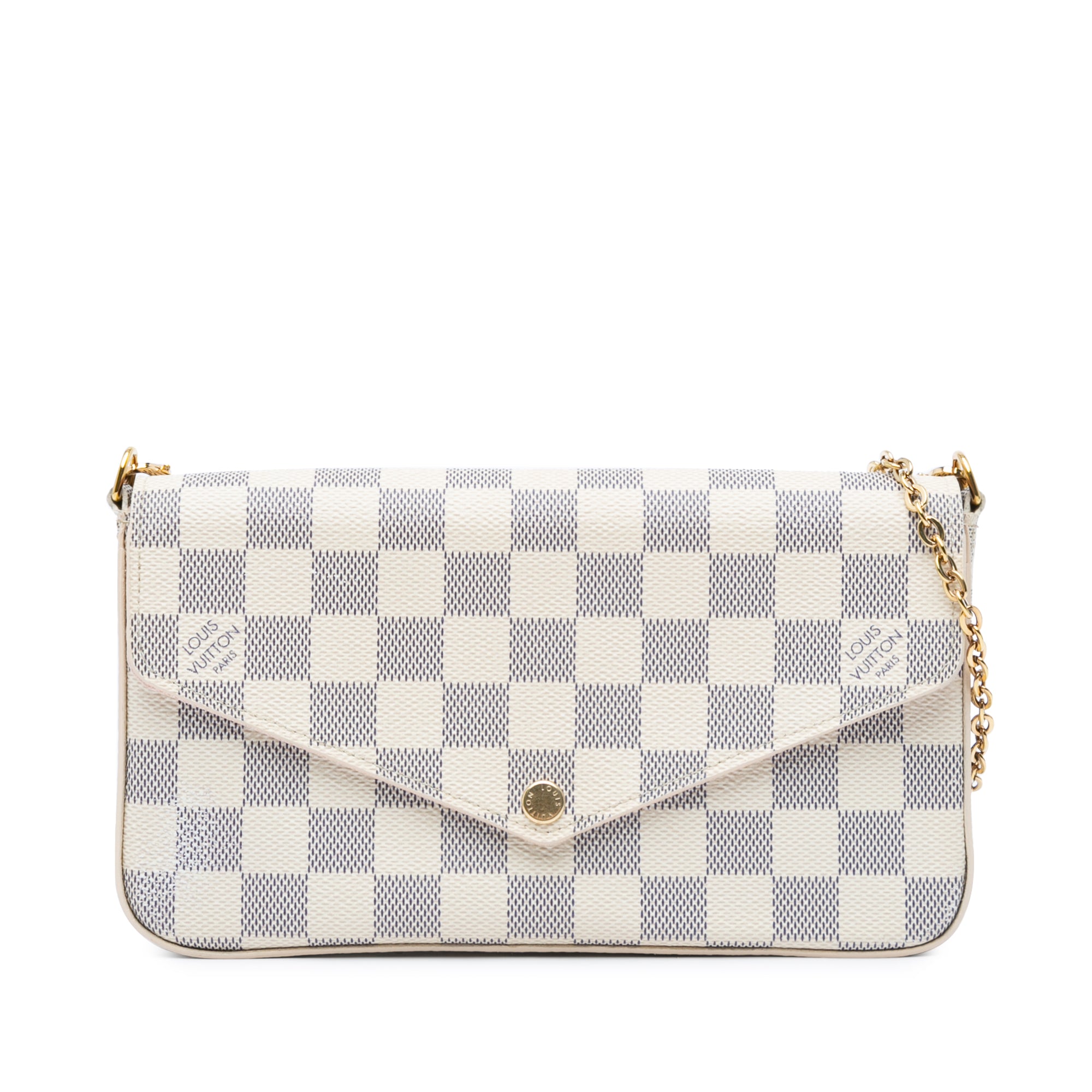 The Pochette Felicie crossbody bag features a damier azur canvas body, a detachable gold-tone chain link shoulder strap, a top flap with snap button closure, and an interior slip pocket. Retail Price: 2145.00