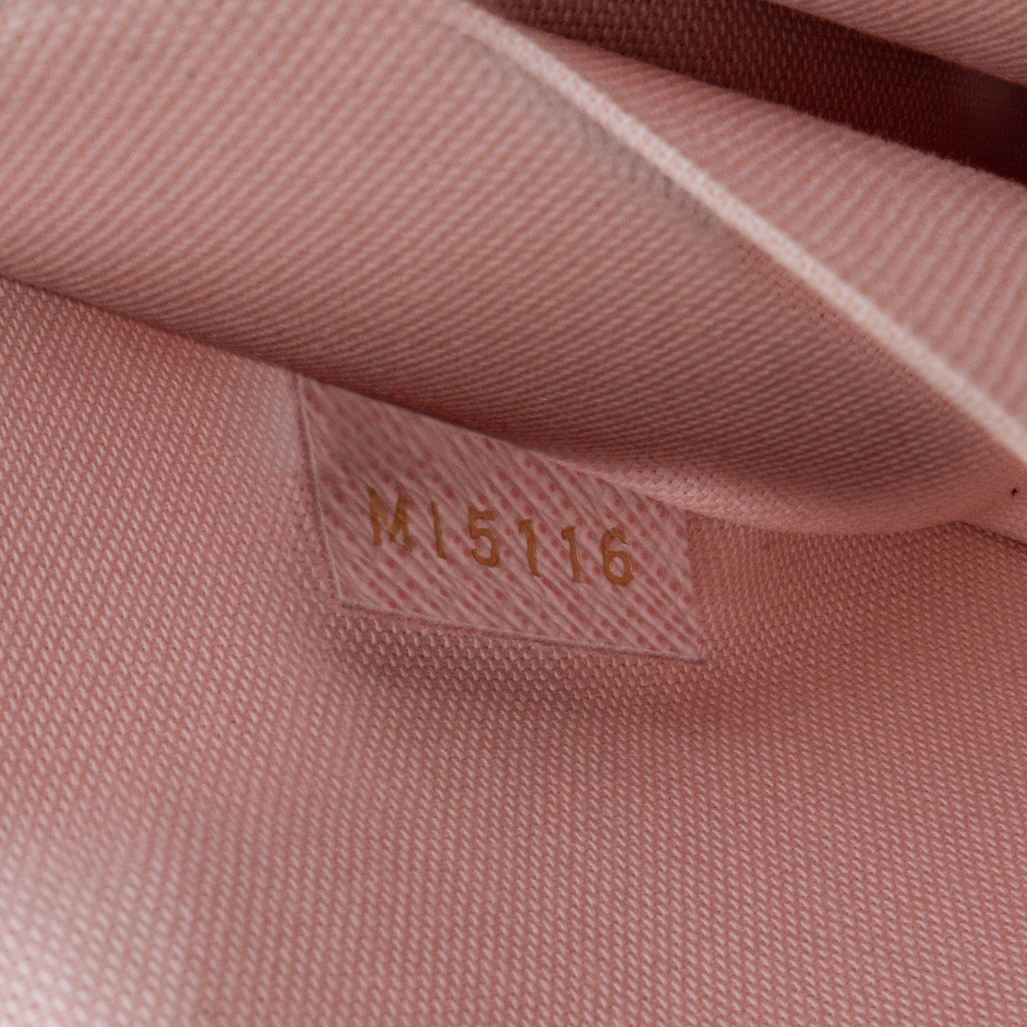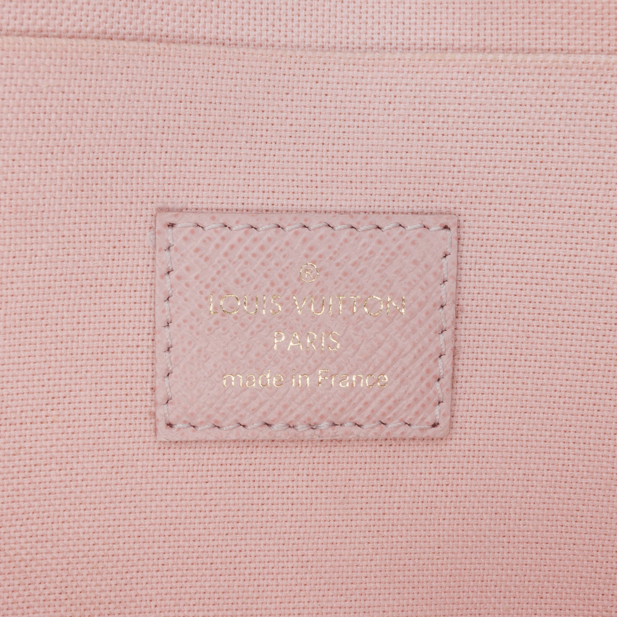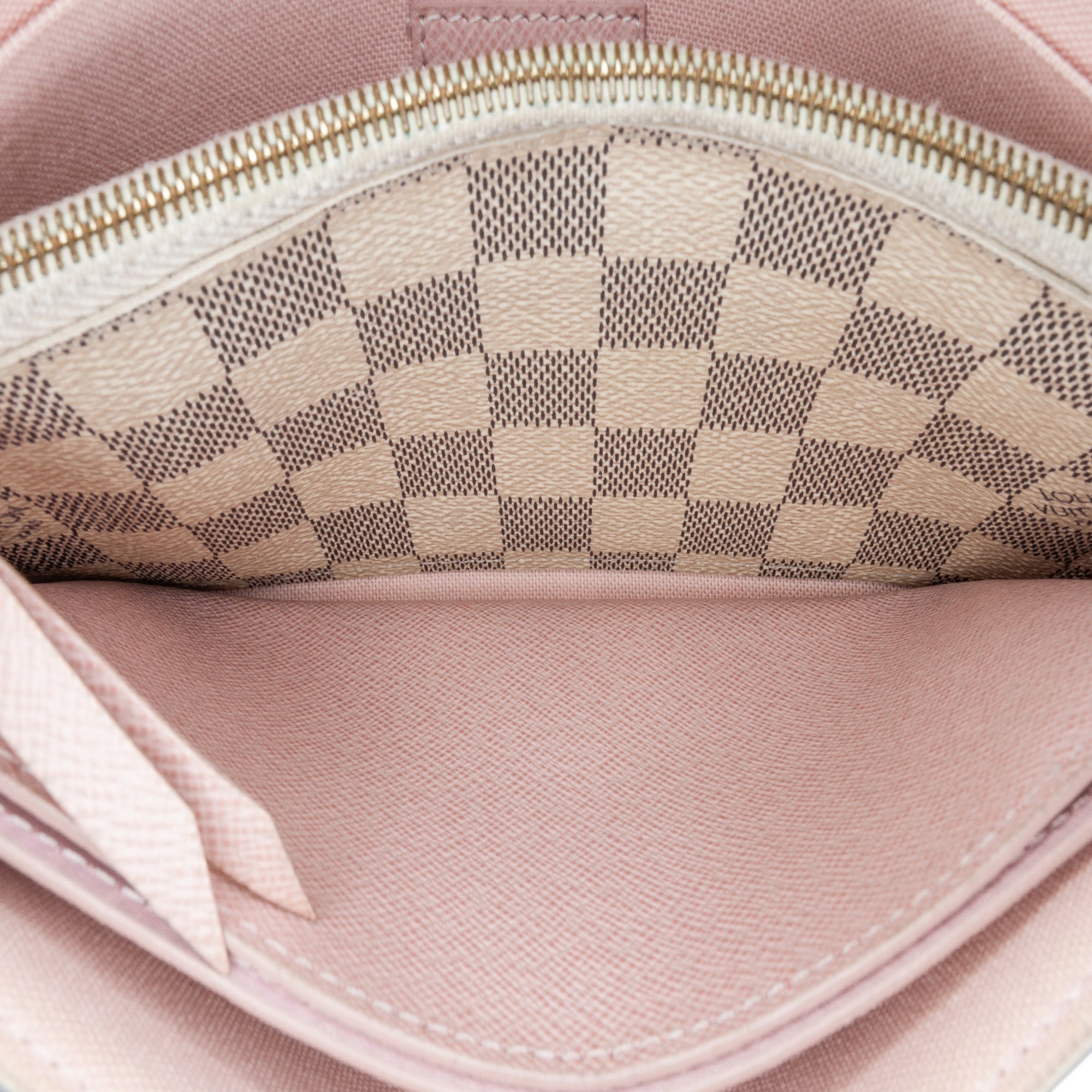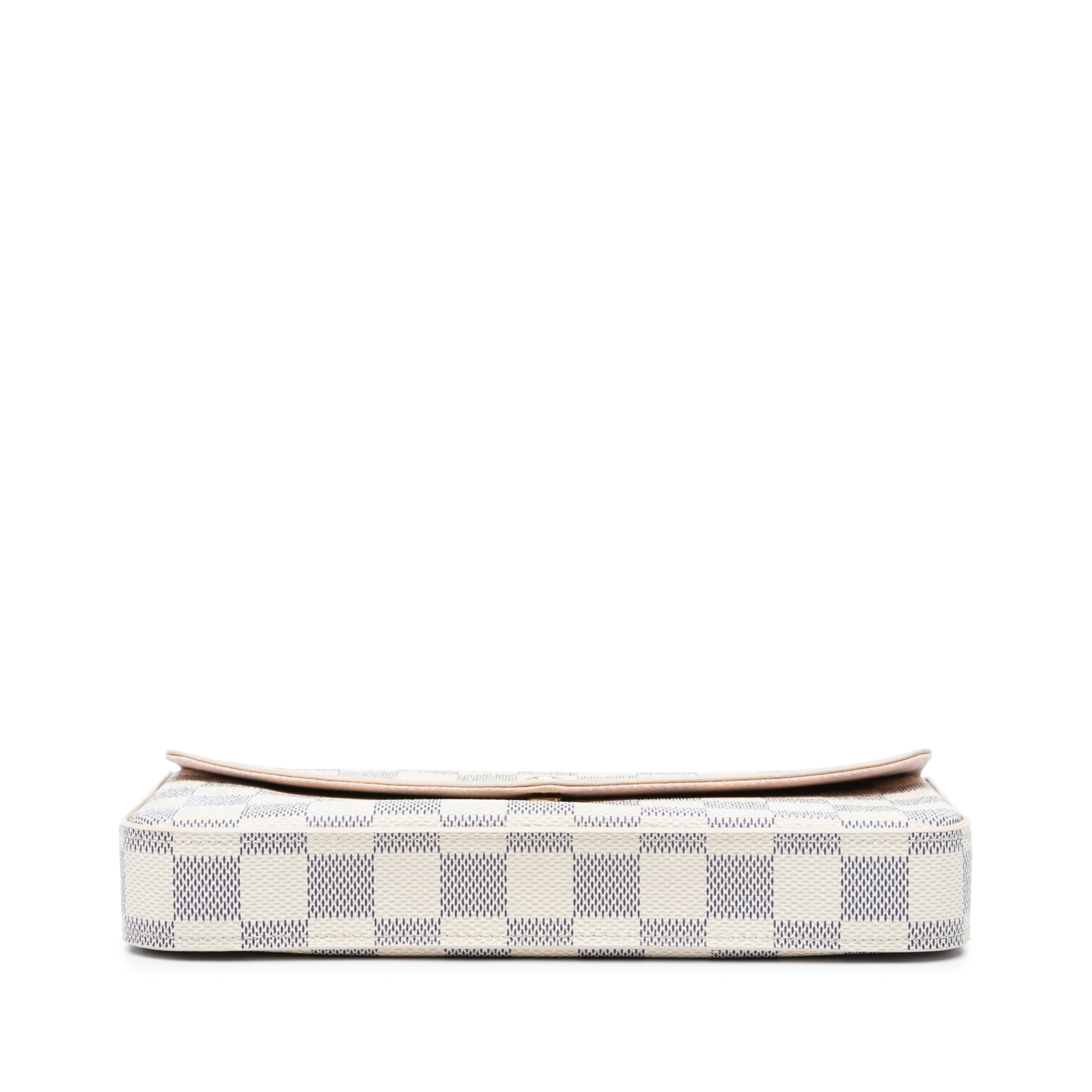 The Pochette Felicie crossbody bag features a damier azur canvas body, a detachable gold-tone chain link shoulder strap, a top flap with snap button closure, and an interior slip pocket. Retail Price: 2145.00