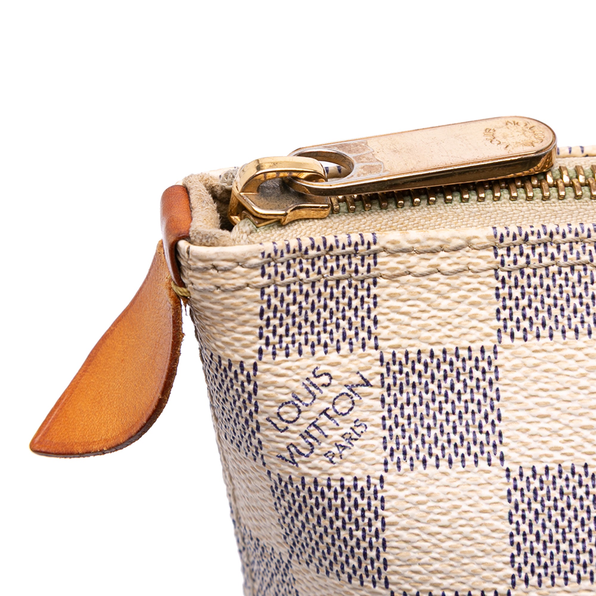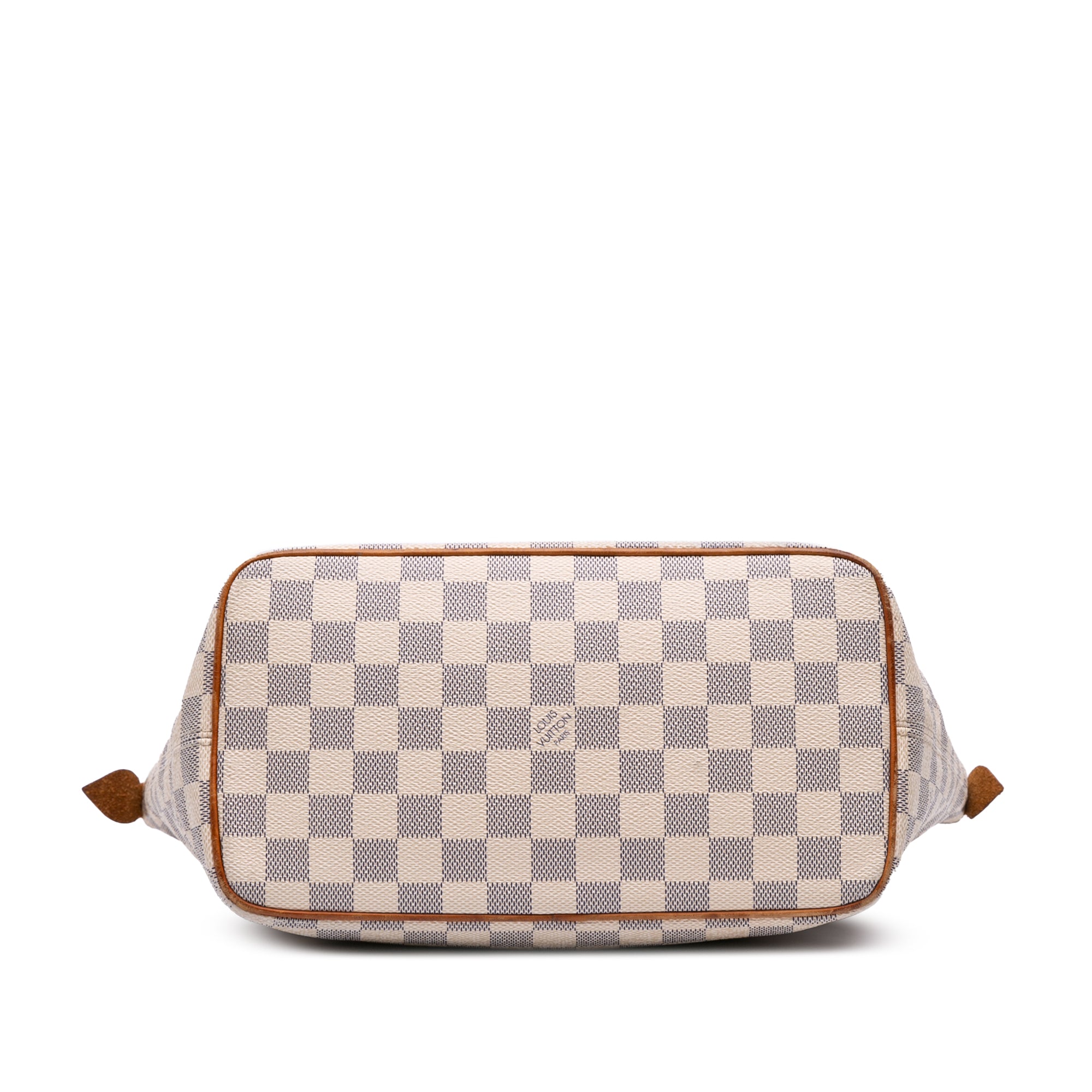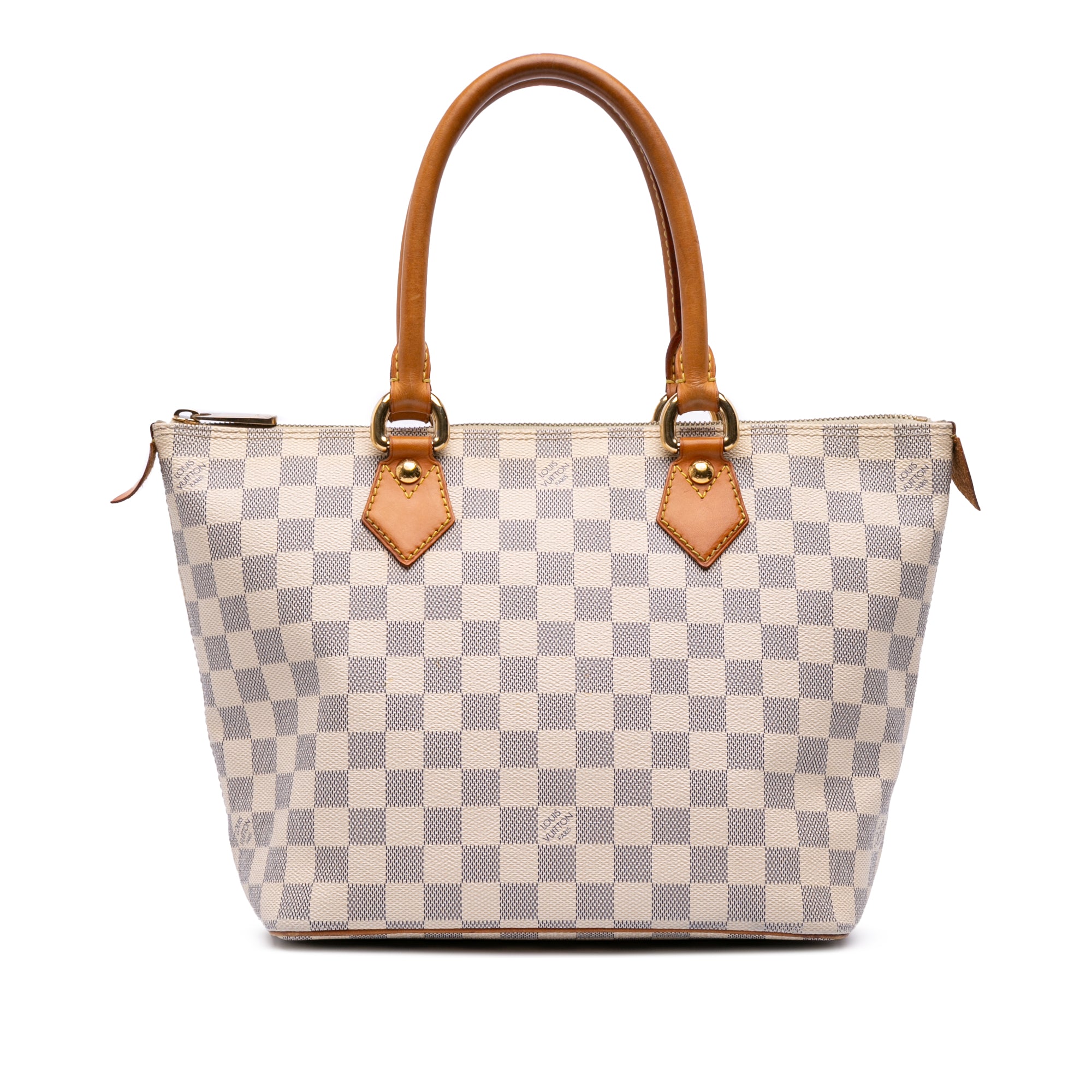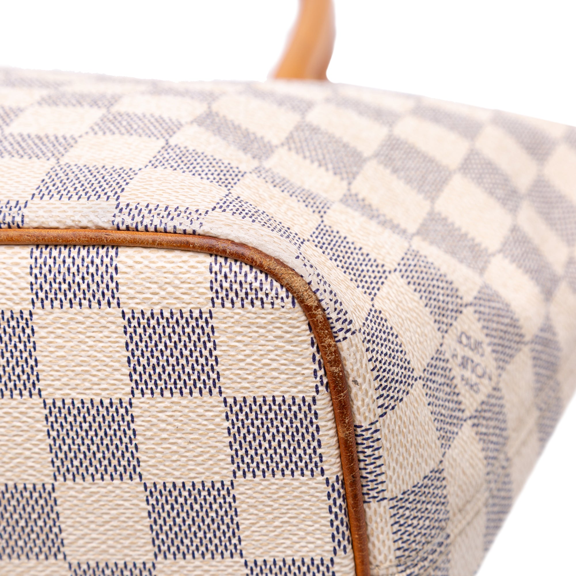 The Saleya PM features a damier azur canvas body, rolled vachetta leather handles, a top zip closure, and interior slip pockets. Retail Price: 1690.00