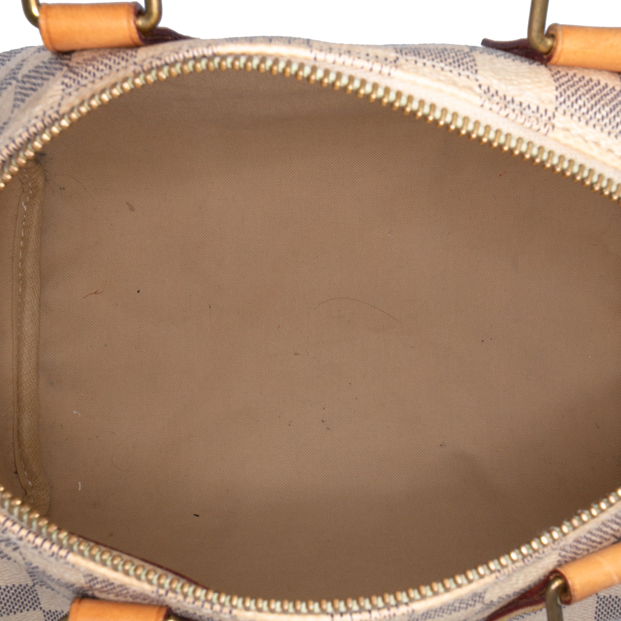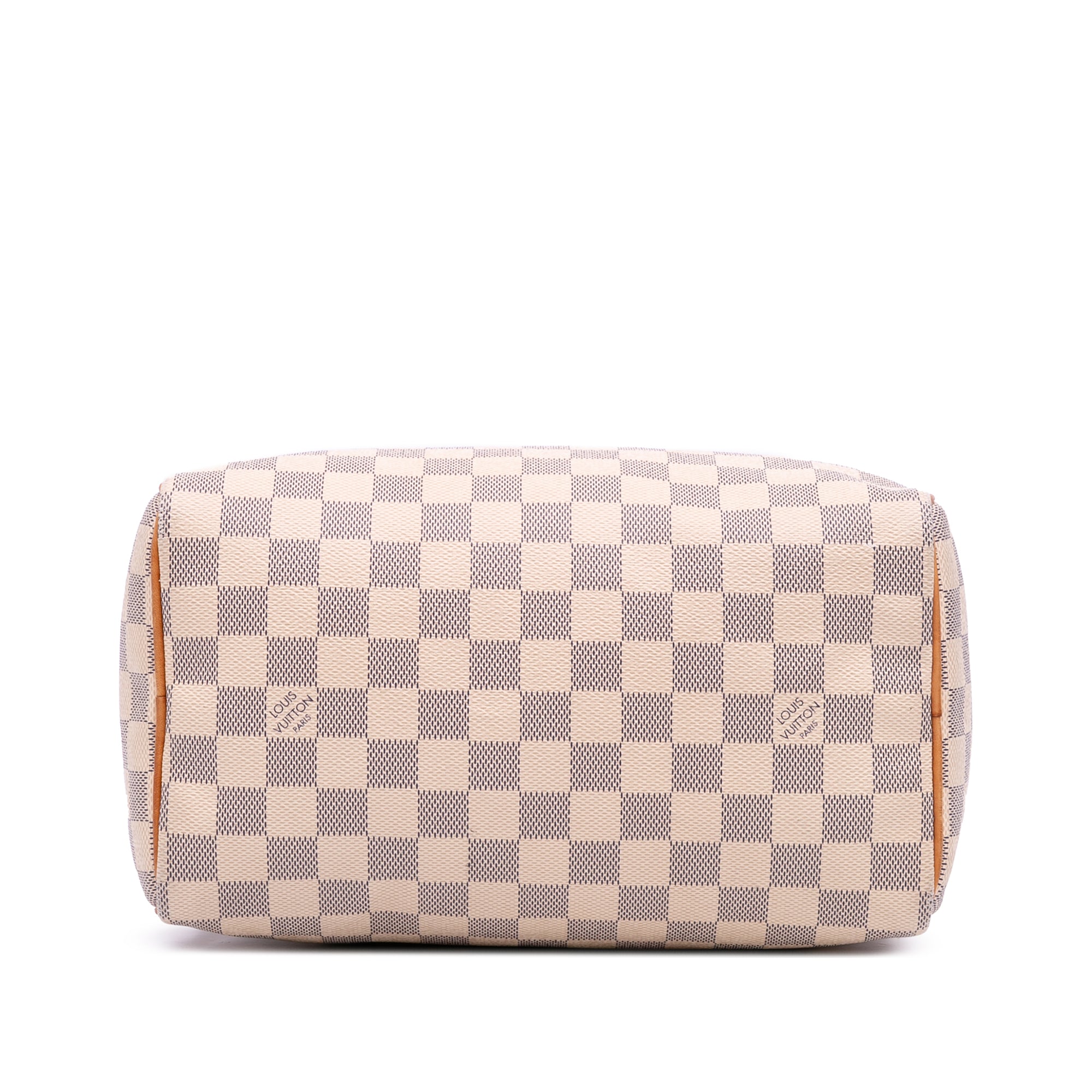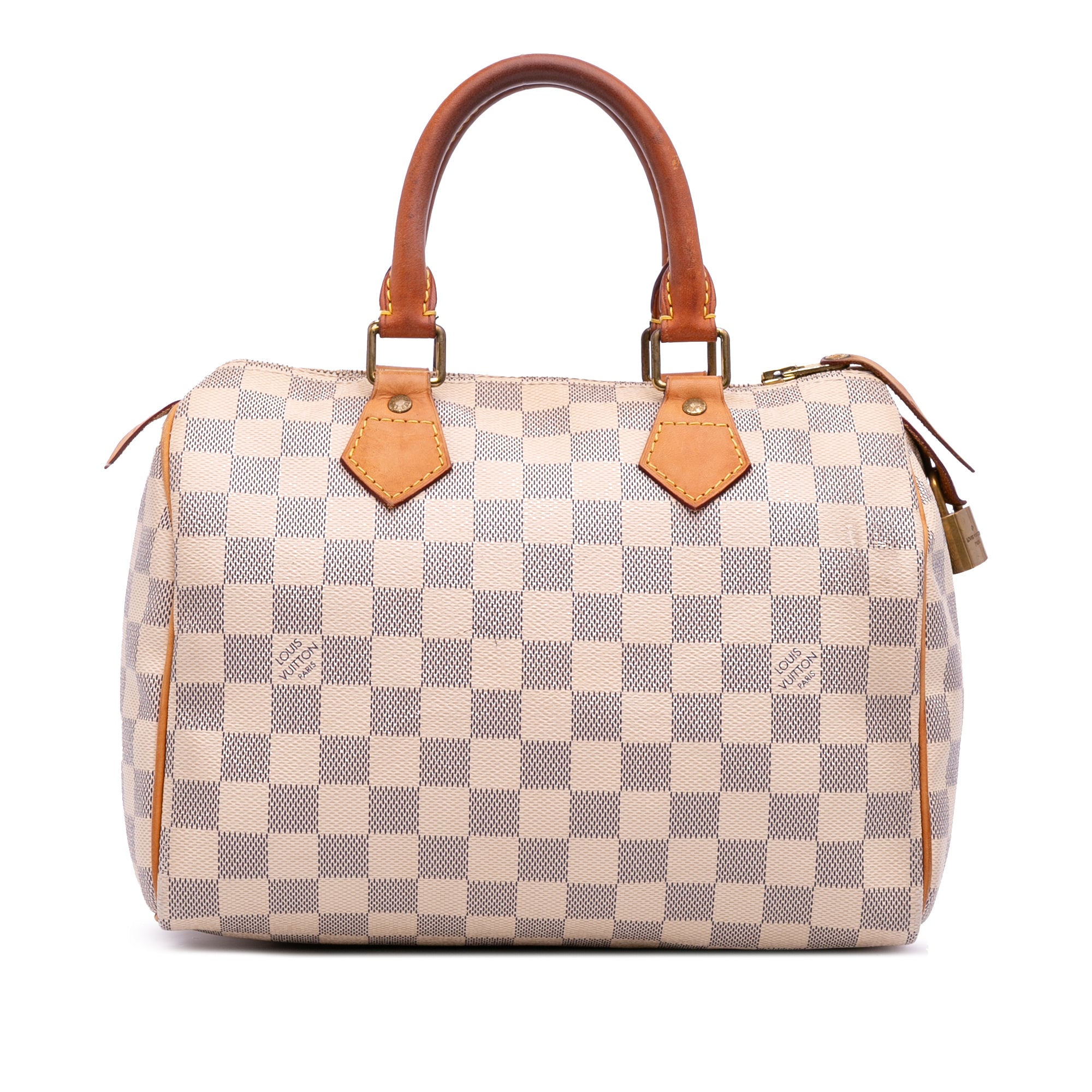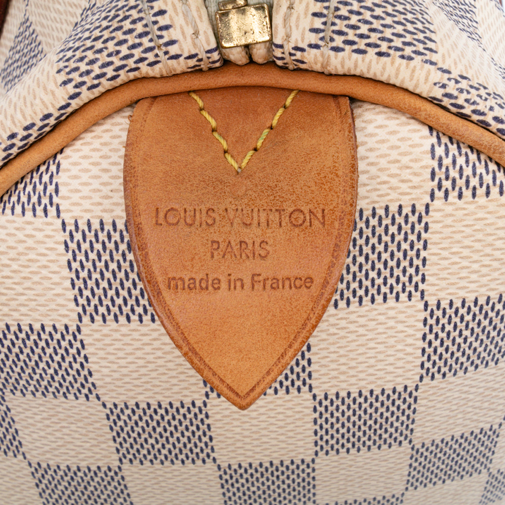 The Speedy features a Damier Azur body, rolled vachetta leather handles, gold-tone hardware, and a top zip closure. Retail Price: 1490.00