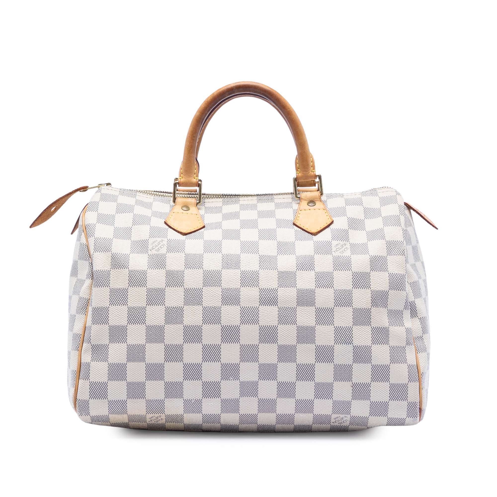 The Speedy 30 features a damier canvas body, rolled leather handles, a top zip closure, and an interior pocket. Retail Price: 1630.00