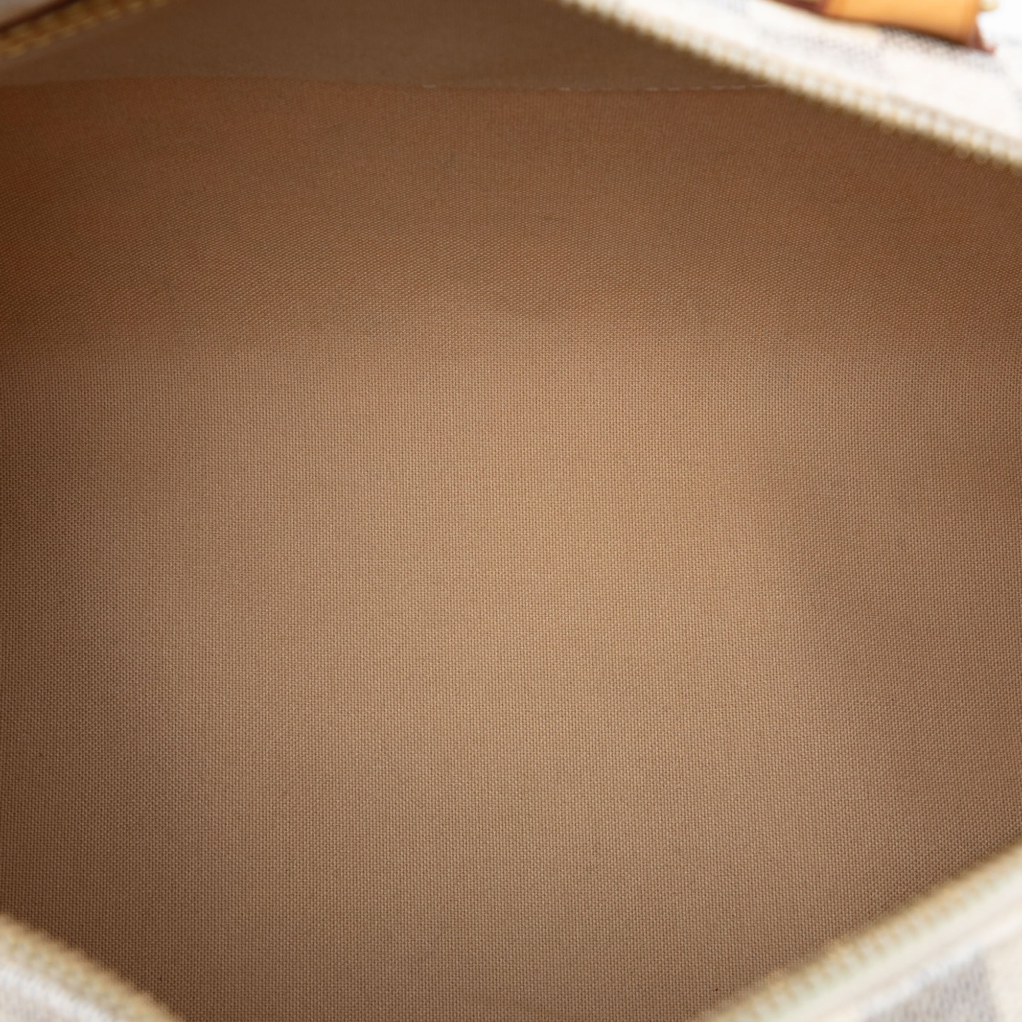 The Speedy 30 features a damier azur canvas body with vachetta leather trim, rolled vachetta leather handles, a top zip closure, and an interior pocket. Retail Price: 1630.00