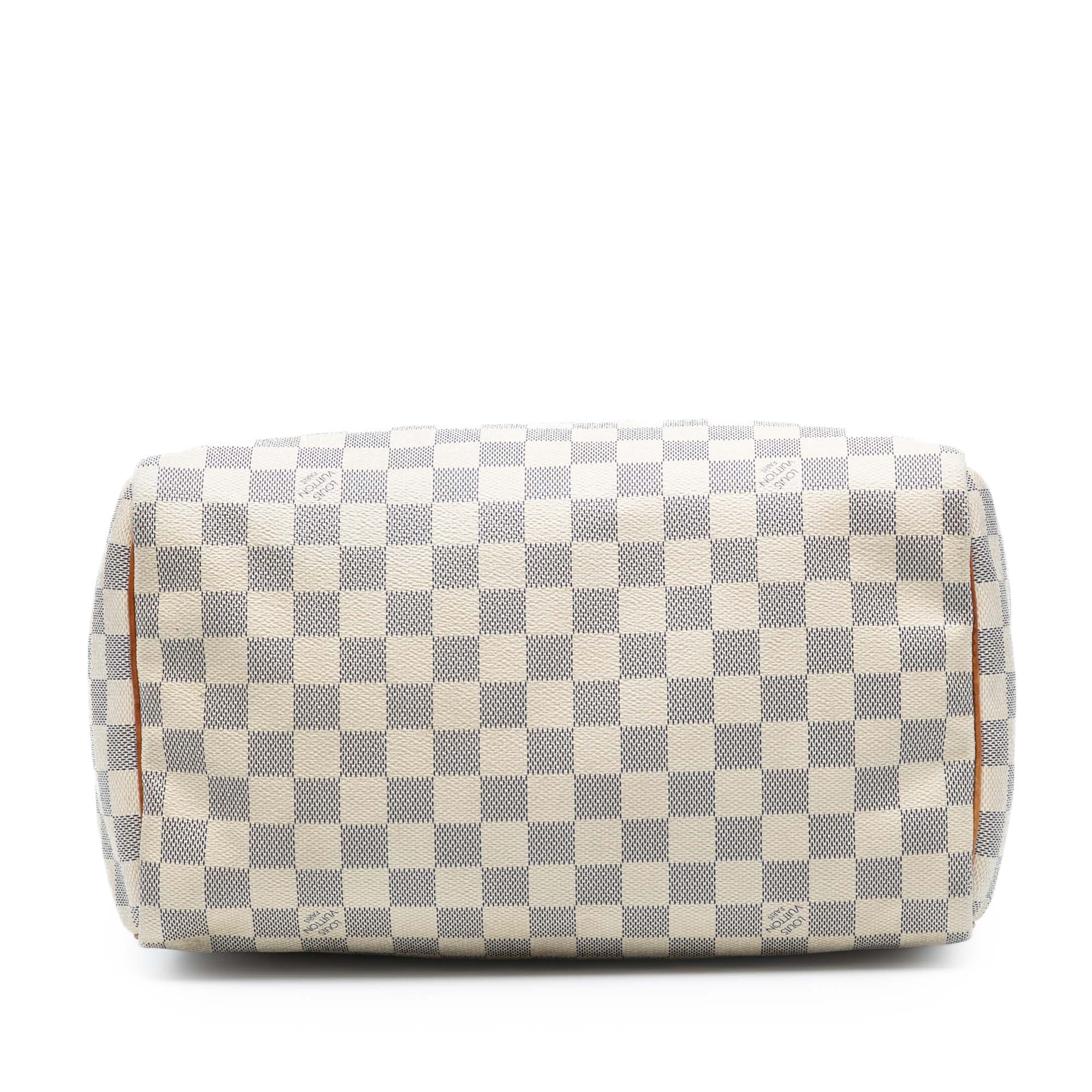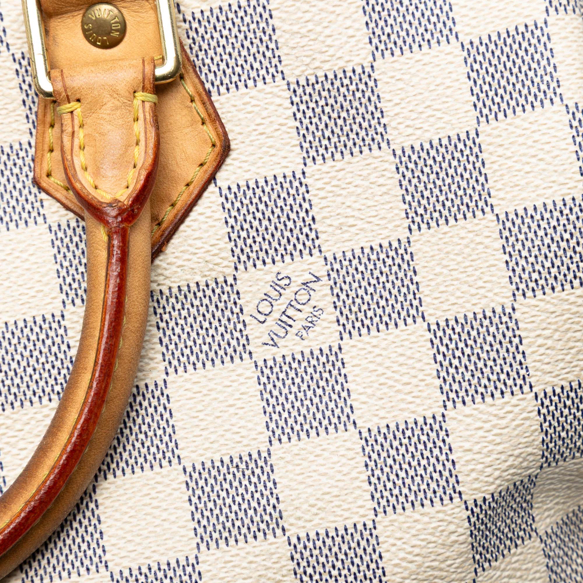 The Speedy 30 features a damier azur canvas body with vachetta leather trim, rolled vachetta leather handles, a top zip closure, and an interior slip pocket. Retail Price: 1590.00