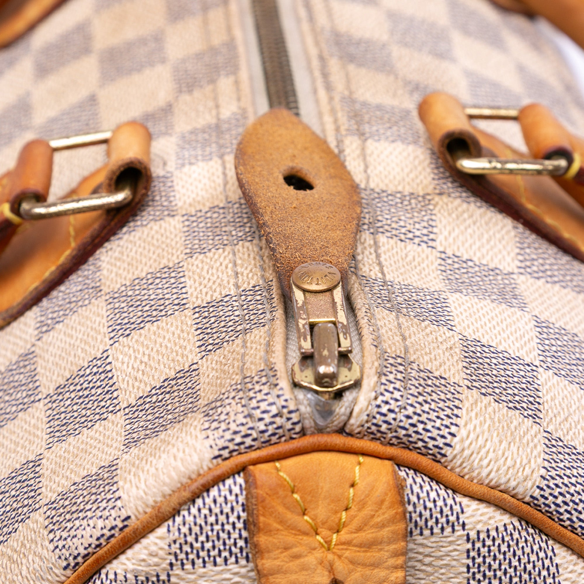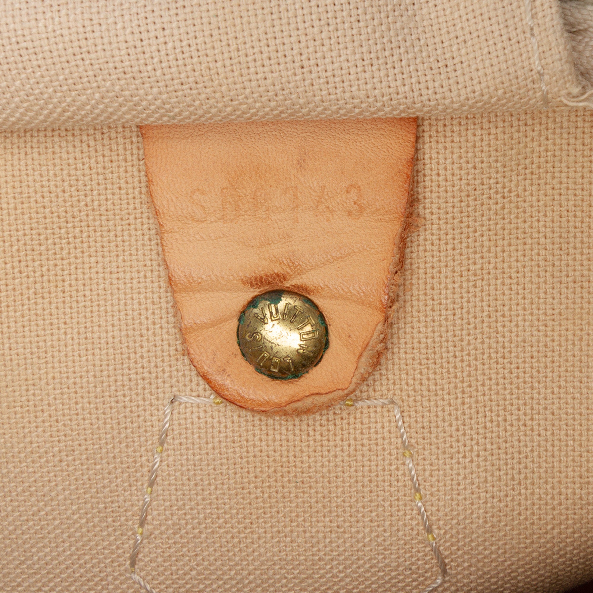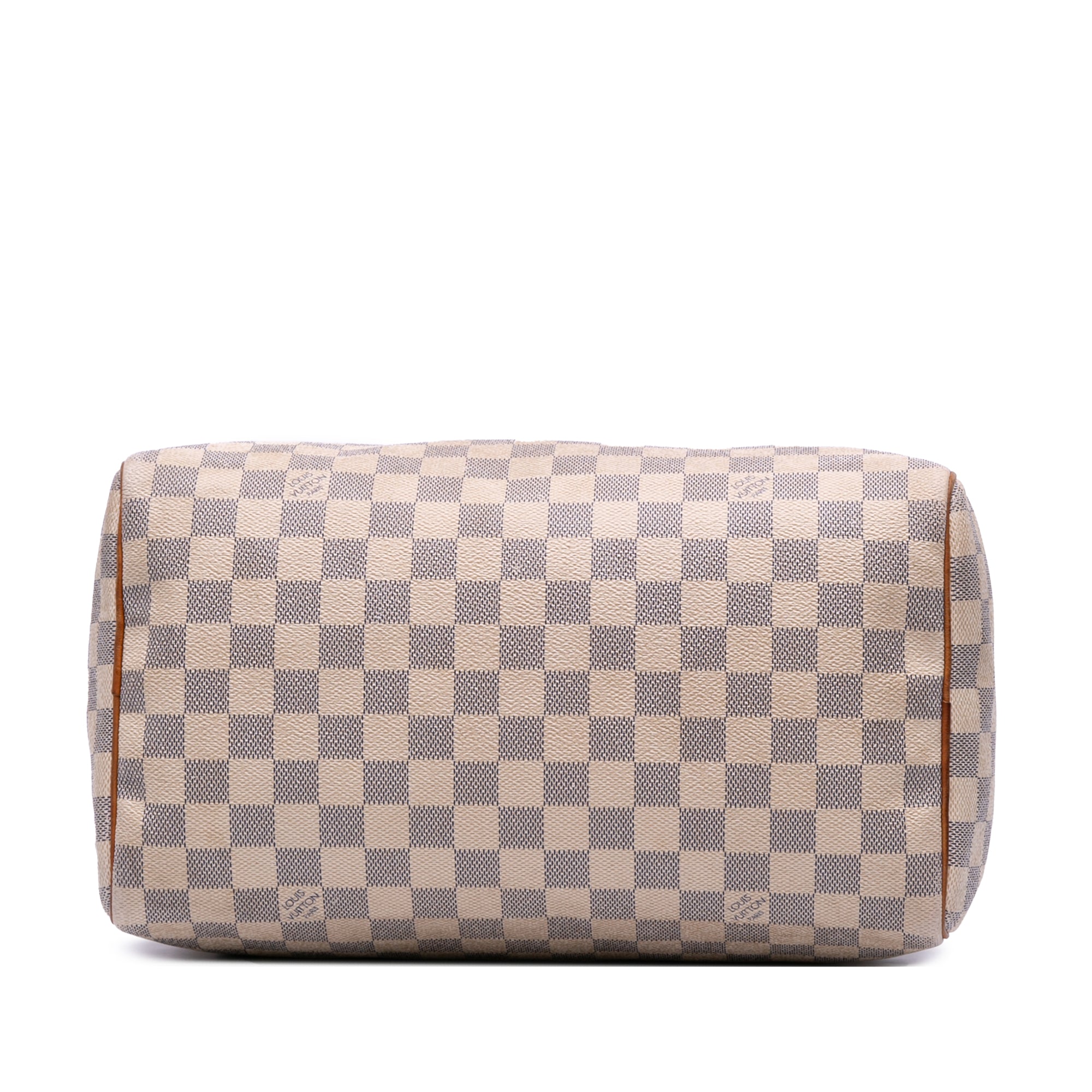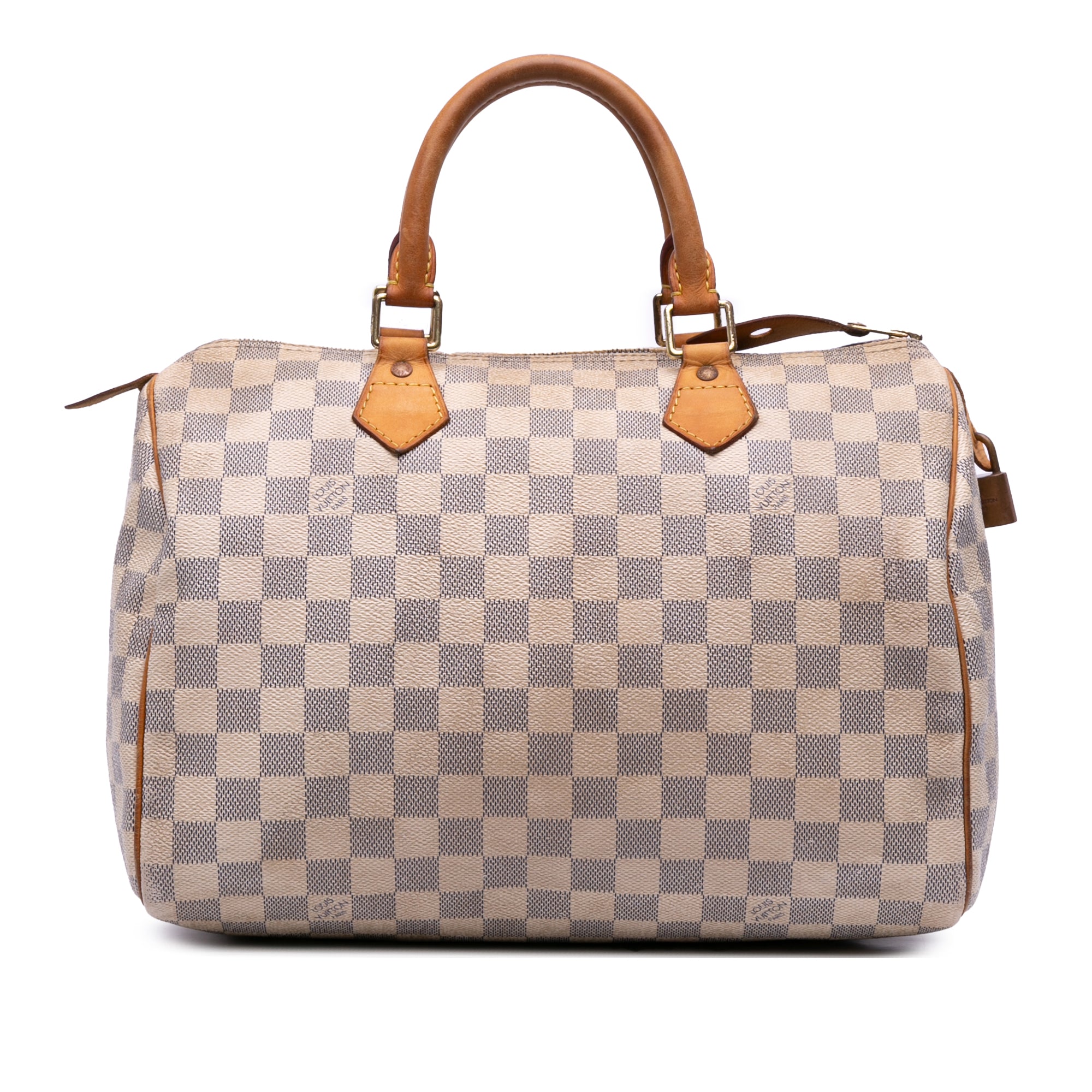The Speedy 30 features a damier azur canvas body with vachetta leather trim, rolled vachetta leather handles, a top zip closure, and an interior pocket. Retail Price: 1550.00