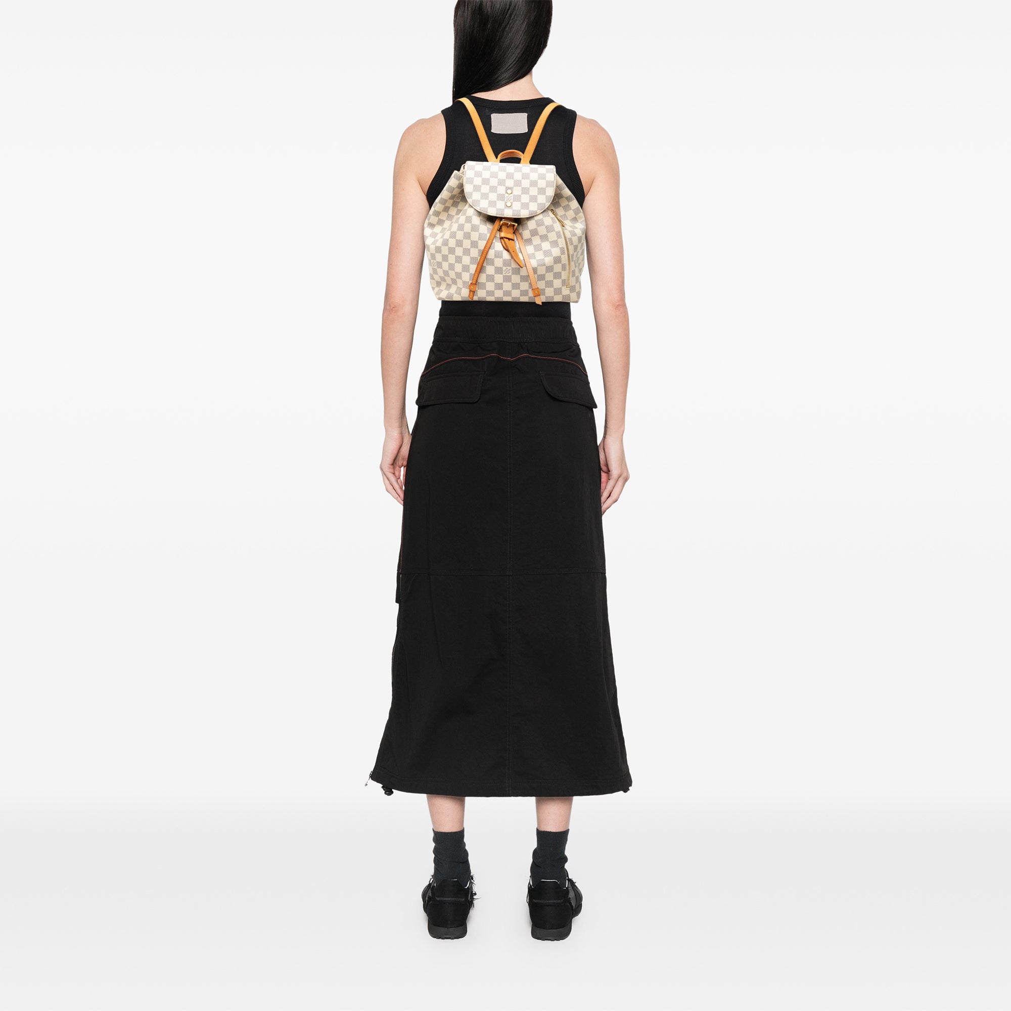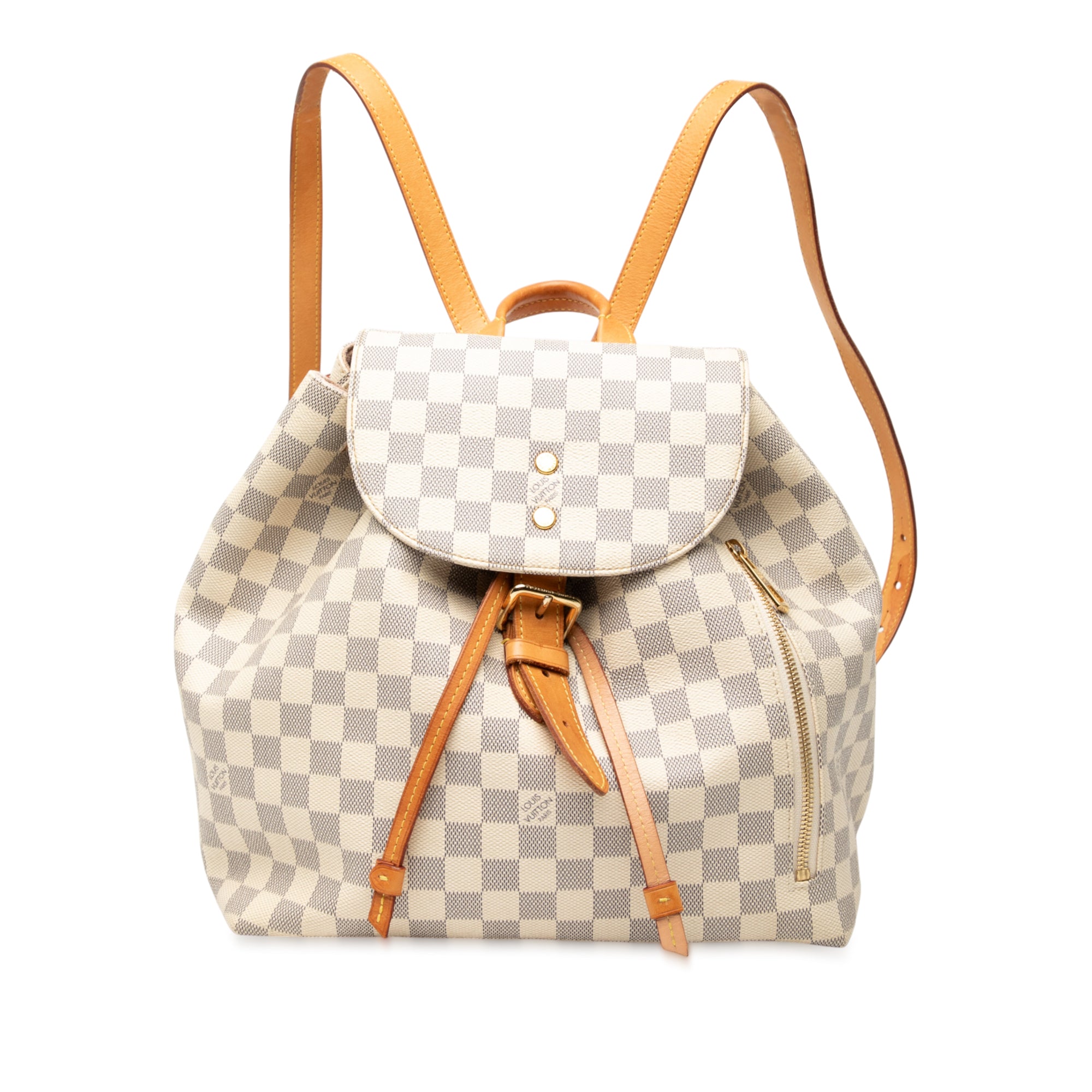 The Sperone features a damier azur canvas body, rolled vachetta leather top handle, adjustable vachetta leather back straps, a top flap with a flat strap and magnetic closure, drawstring closure, an exterior zip pocket, and an interior slip pocket. Retail Price: 2230.00
