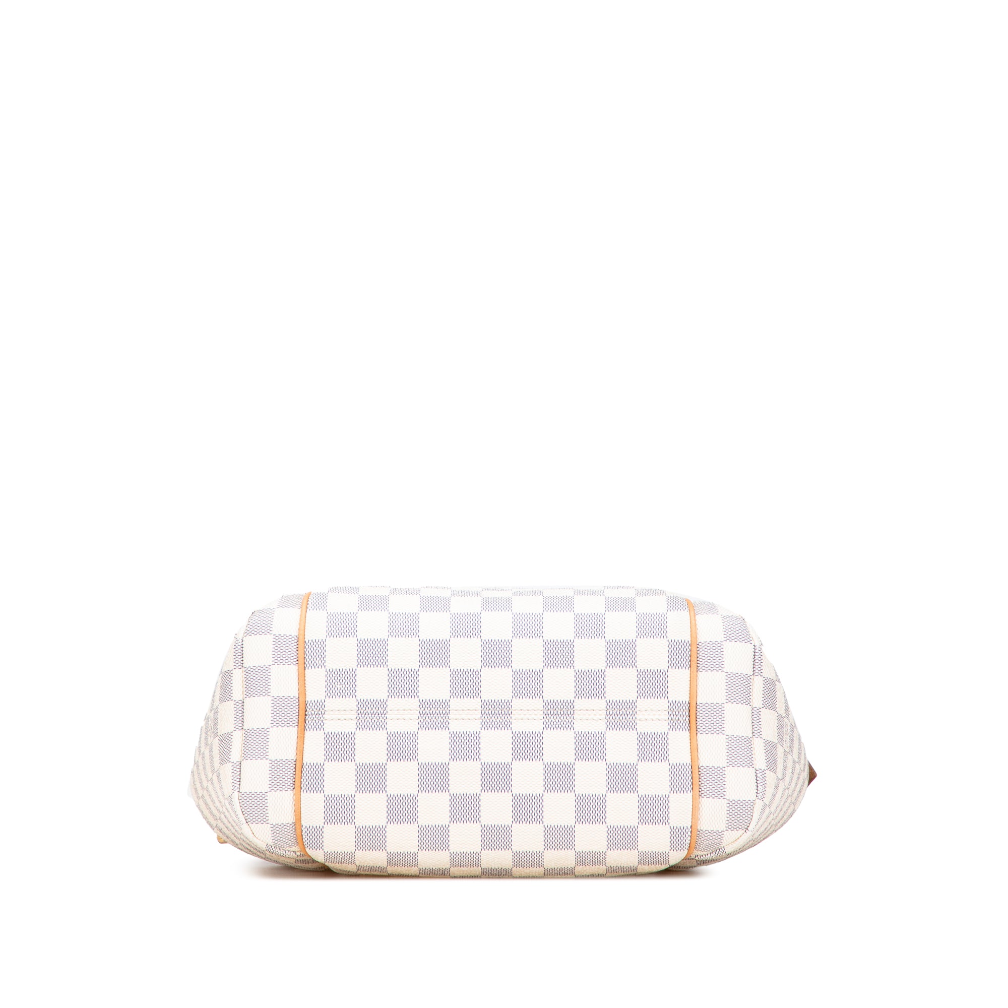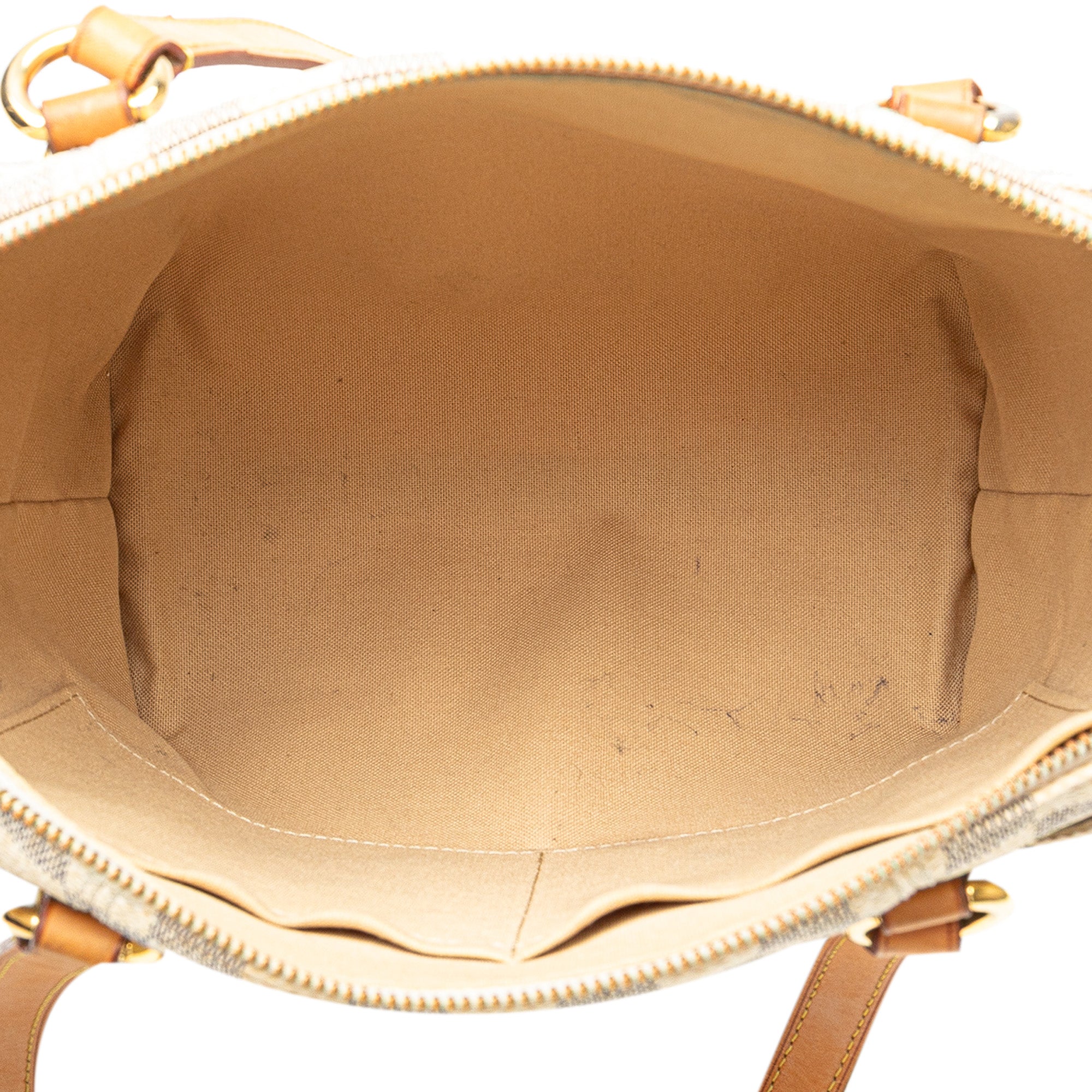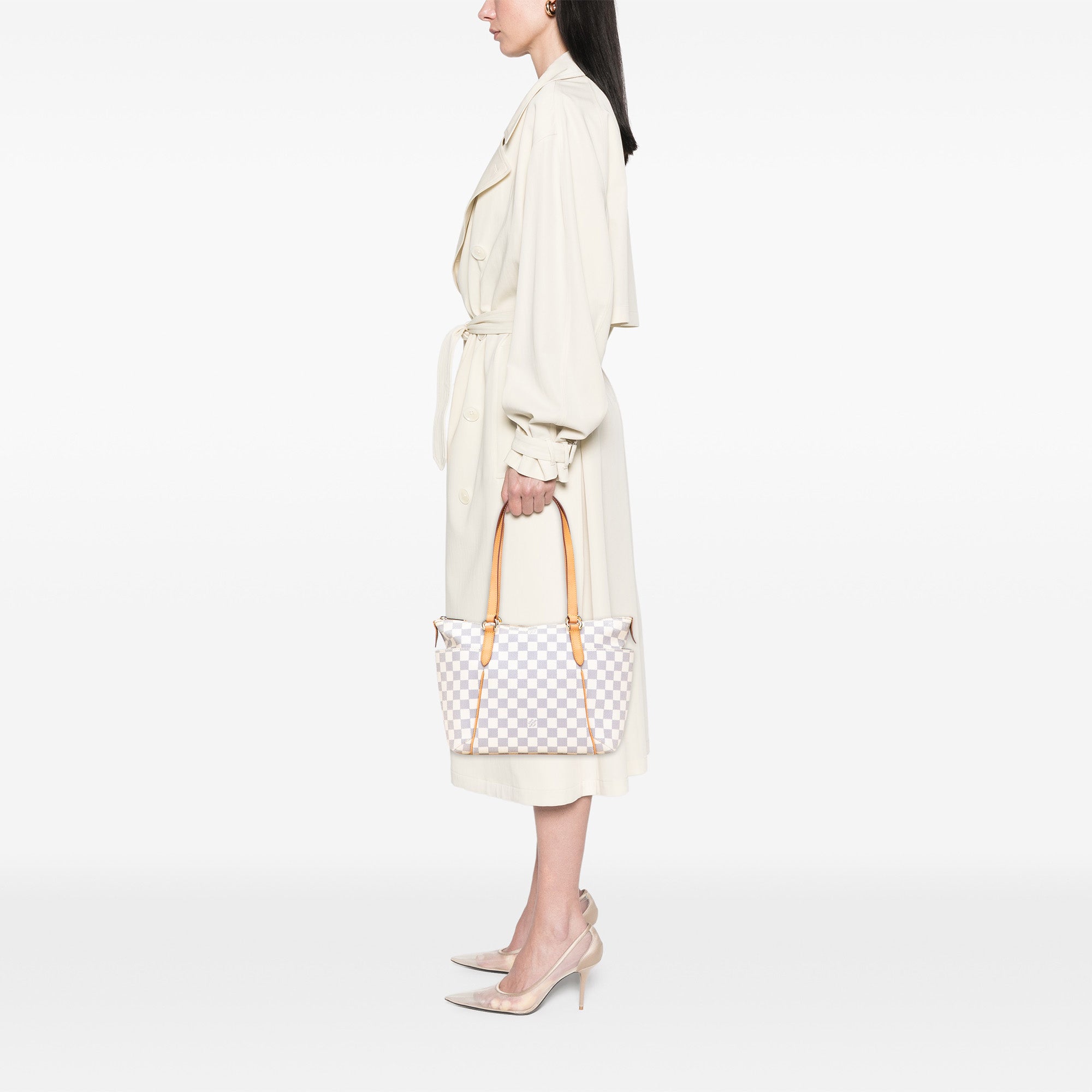 The Totally PM features a damier azur canvas body, flat vachetta leather straps, a top zip closure, exterior side slip pockets, and an interior slip pocket. Retail Price: 1430.00