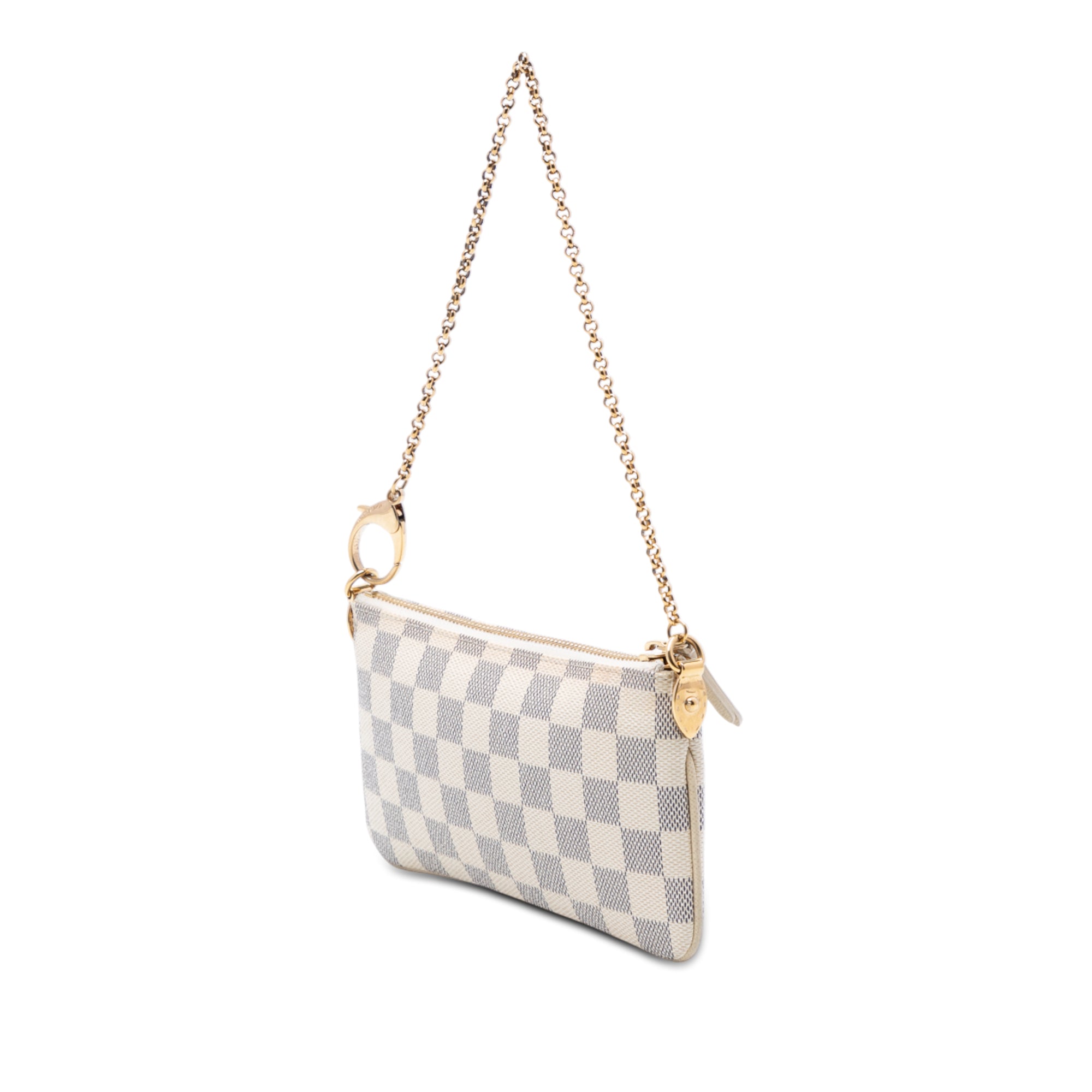 The Pochette Milla MM features a damier azur canvas body, a detachable chain link handle, a top zip closure, and an interior slip pocket. Retail Price: 990.00