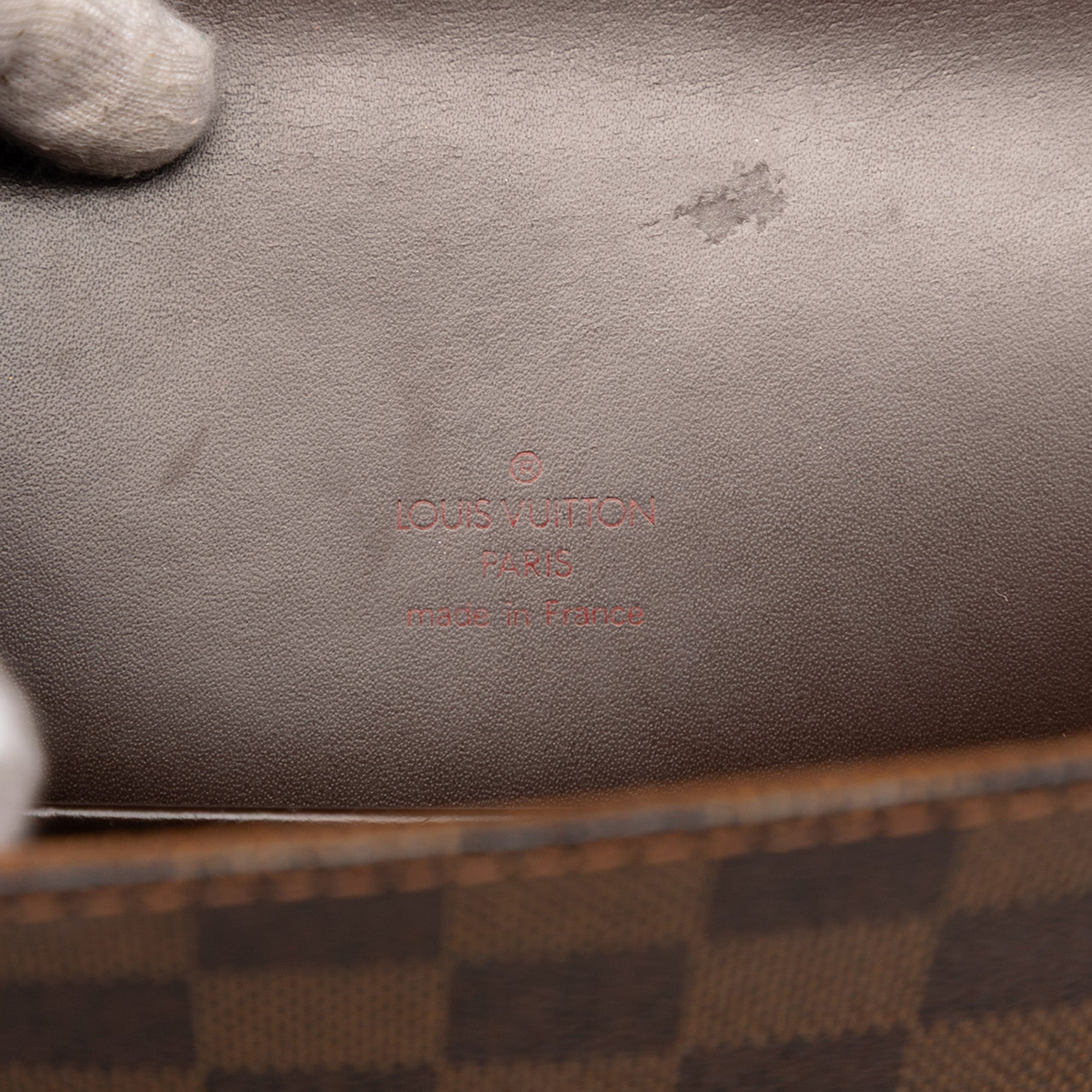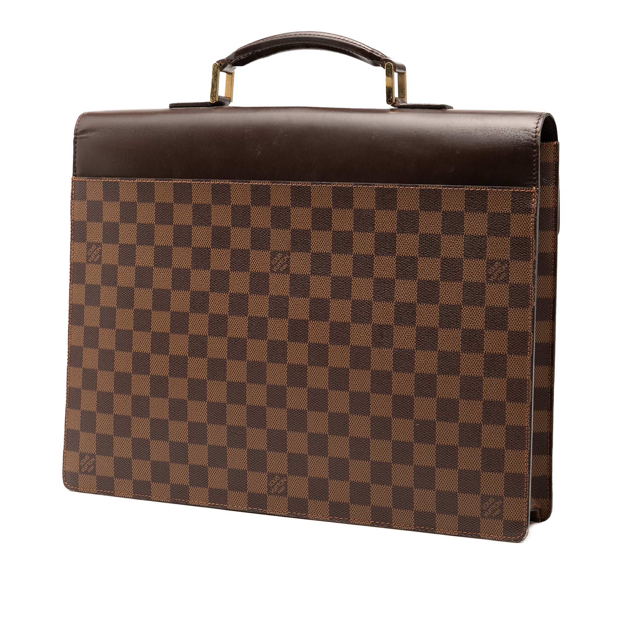 The Altona PM features a damier canvas body with leather trim, flat leather top handle, a front flap with push lock closure, and interior slip pockets. Retail Price: 990.00