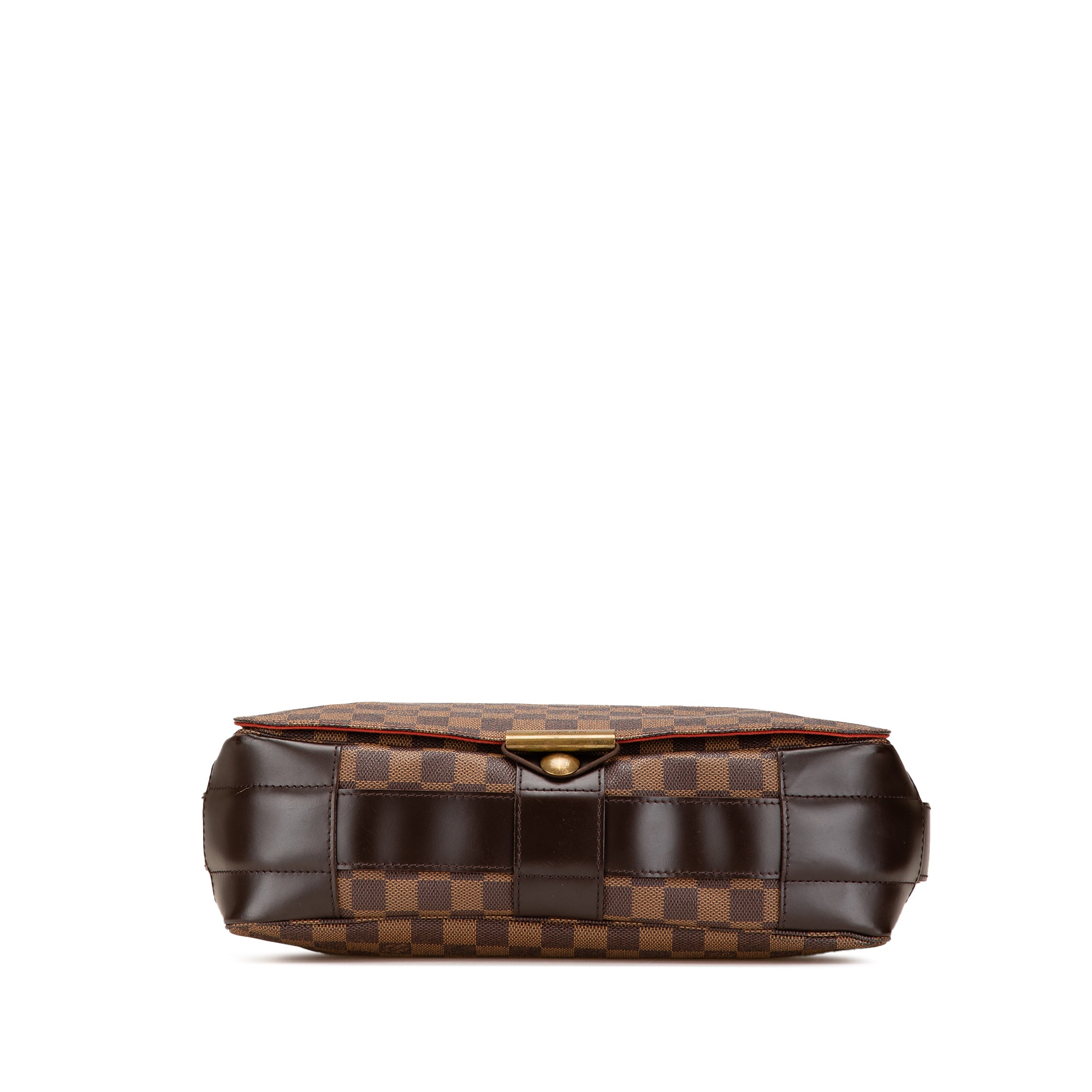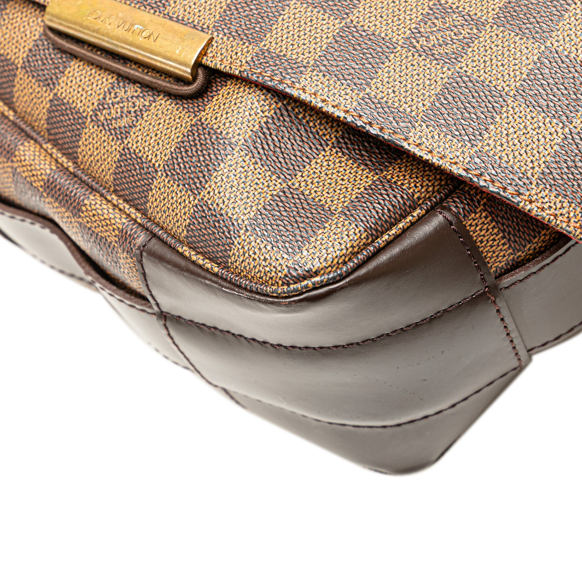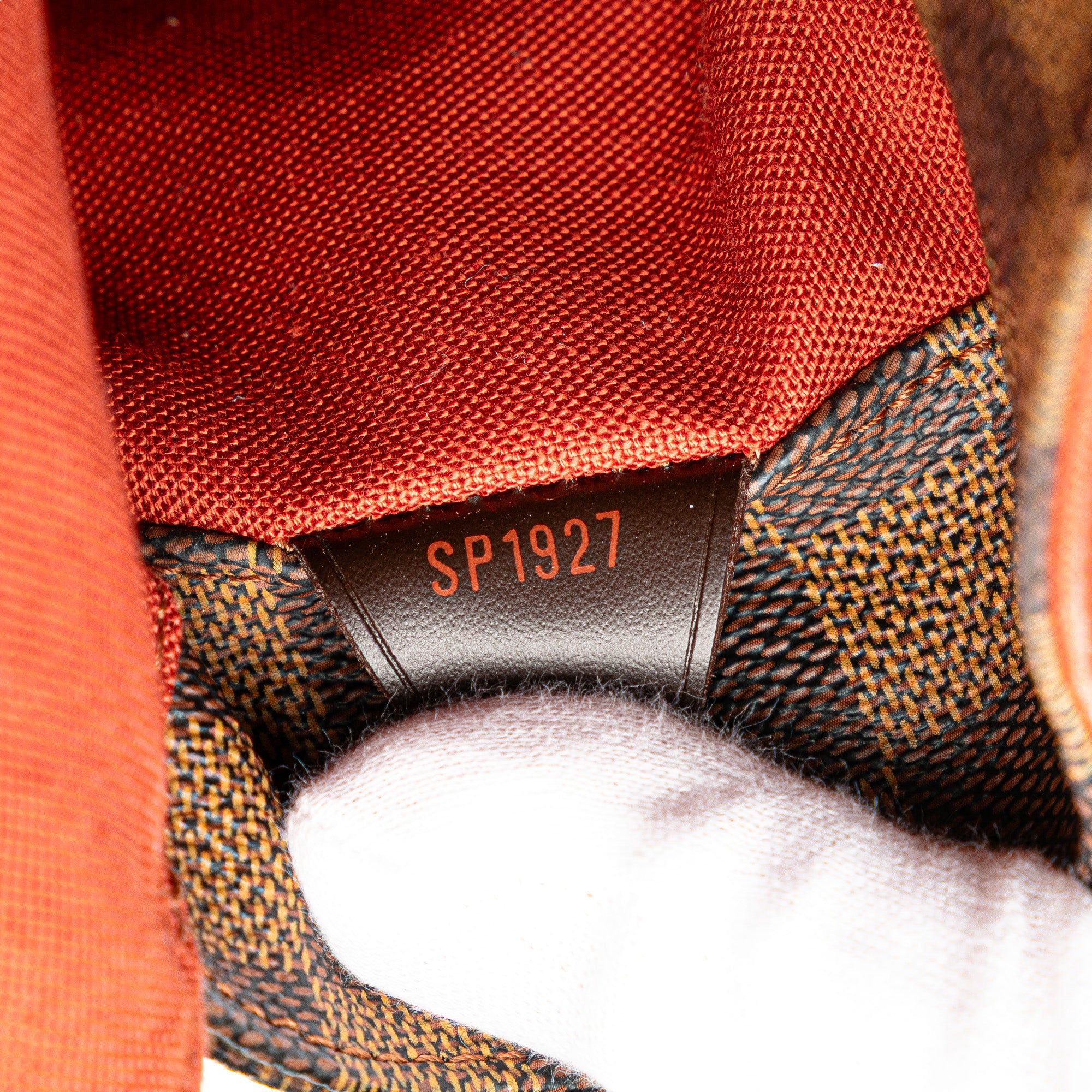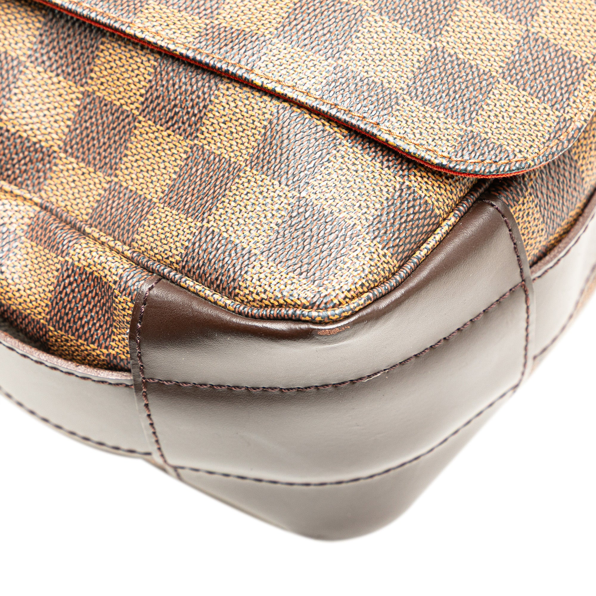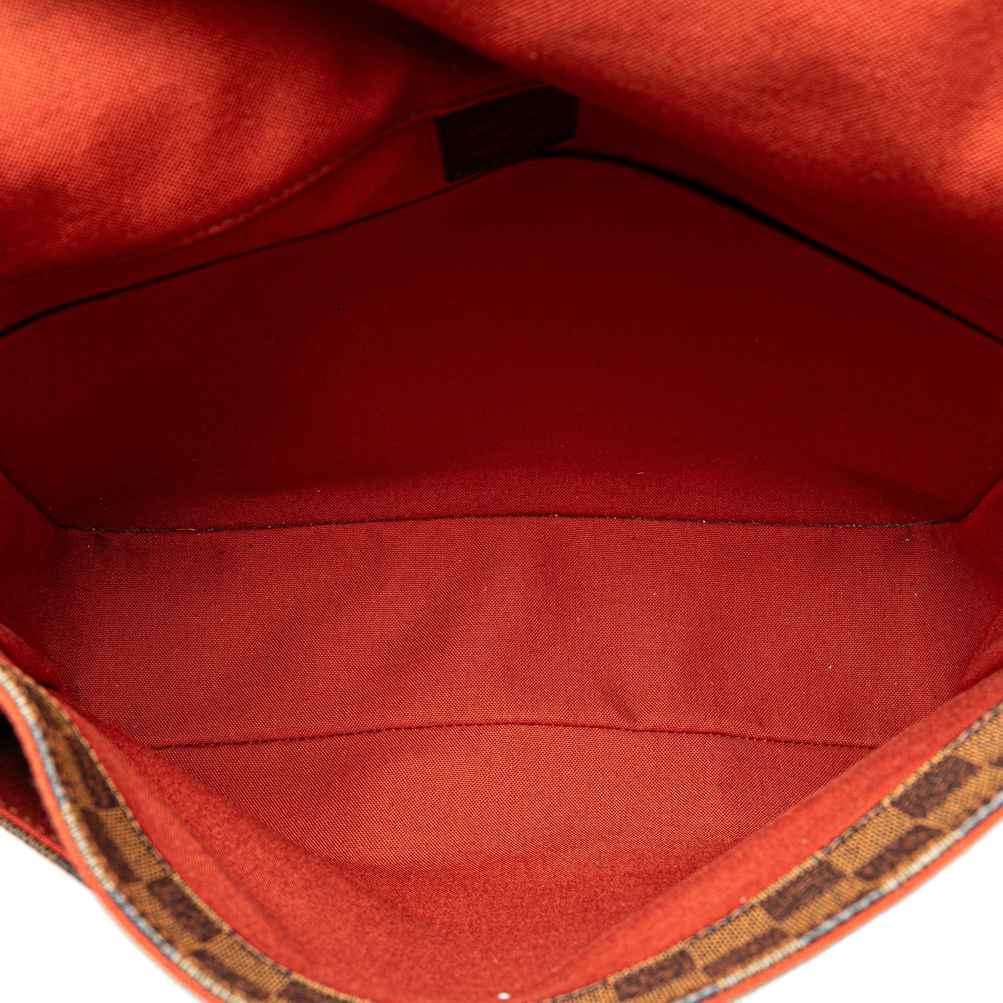 The Bastille features a damier ebene canvas body with leather trim, an adjustable flat leather strap, a front flap with hook closure, an exterior back zip pocket, and interior slip pockets. Retail Price: 1560.00