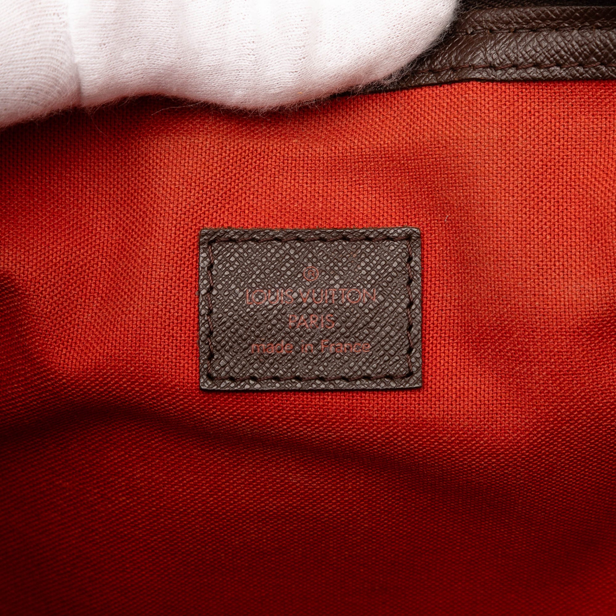 The Belem PM features a damier ebene canvas body with leather trim, flat leather straps, a top zip closure, and exterior slip pockets, Retail Price: 1330.00