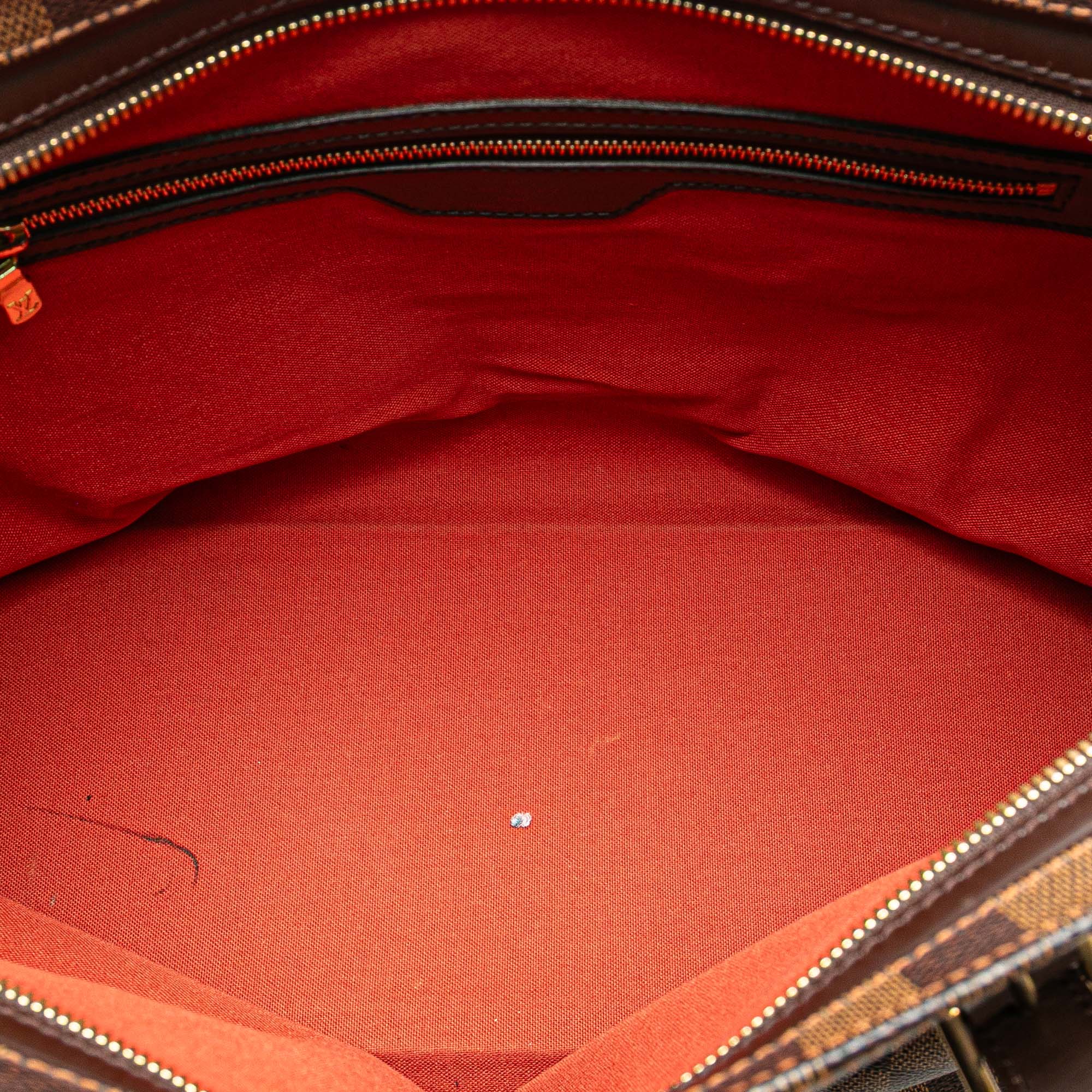 The Chelsea features a damier ebene canvas body with leather trim, adjustable flat leather shoulder straps, a top zip closure, and an interior zip pocket. Retail Price: 1395.00