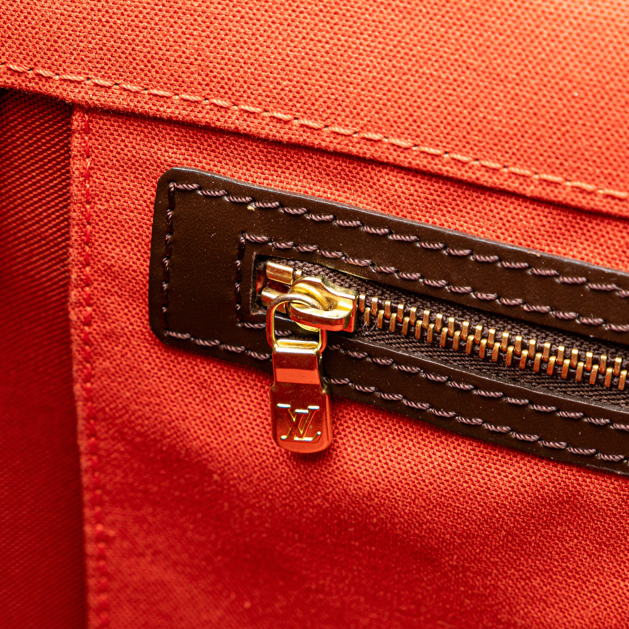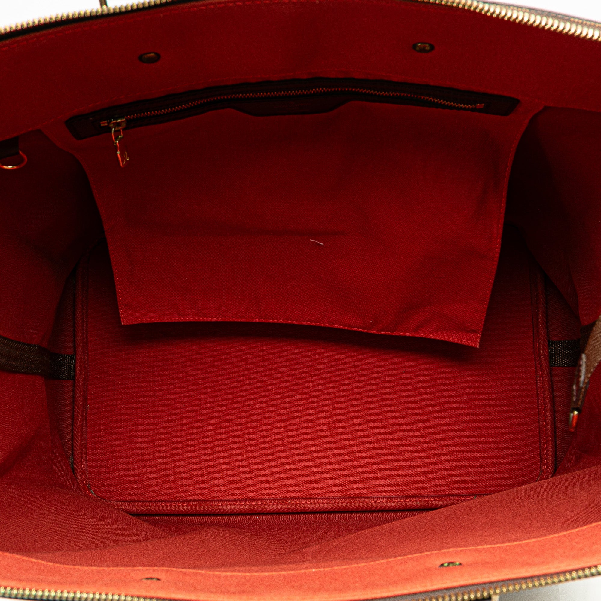 The Greenwich PM features a damier canvas body with leather trim, rolled leather handles, a top zip closure, and an interior zip pocket. Retail Price: 2570.00