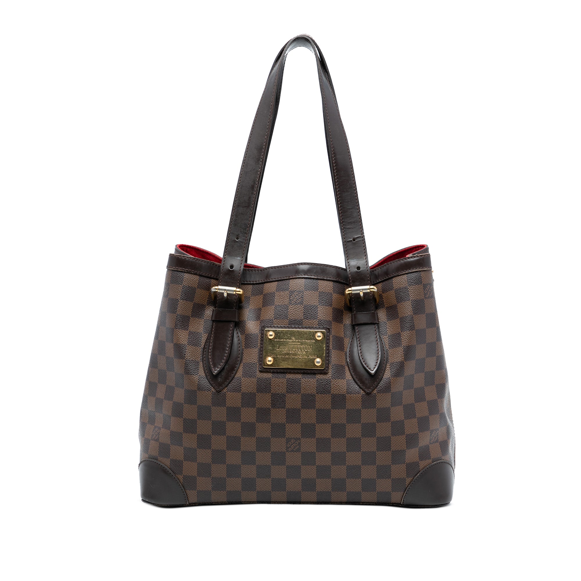 The Hampstead MM features a damier ebene canvas body with leather trim, flat leather handles, an open top with hook closure, and interior zip and slip pockets. Retail Price: 1470.00
