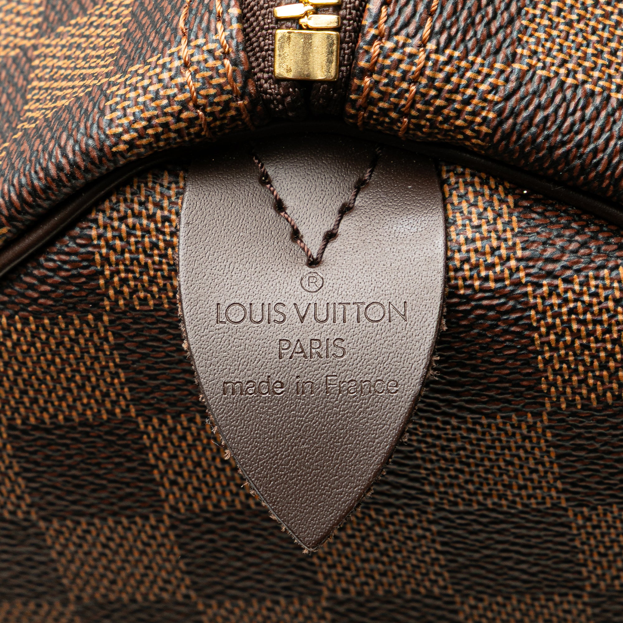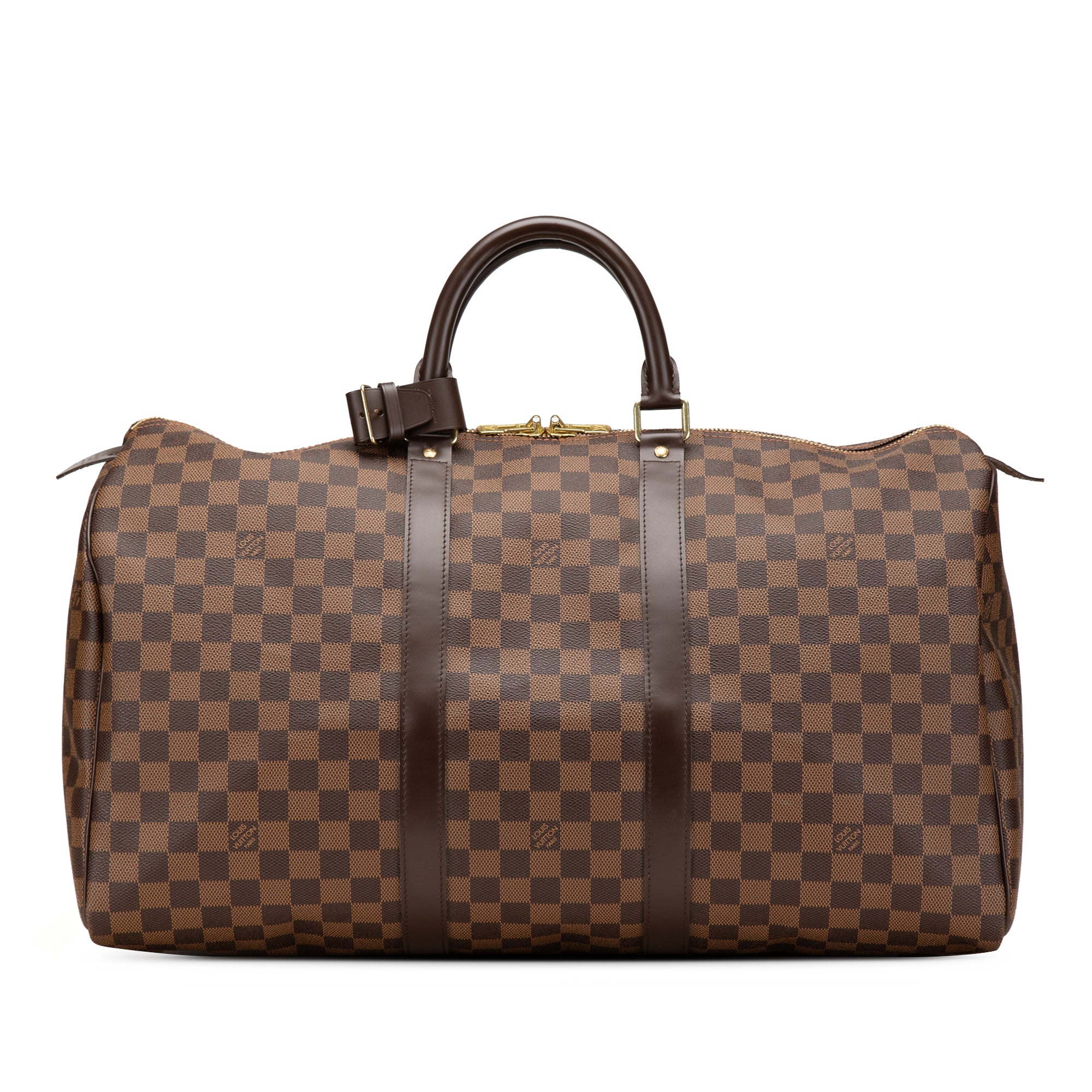 The Keepall features a damier ebene body with leather trim, rolled leather handles, and a top zip closure. Retail Price: 2147.00