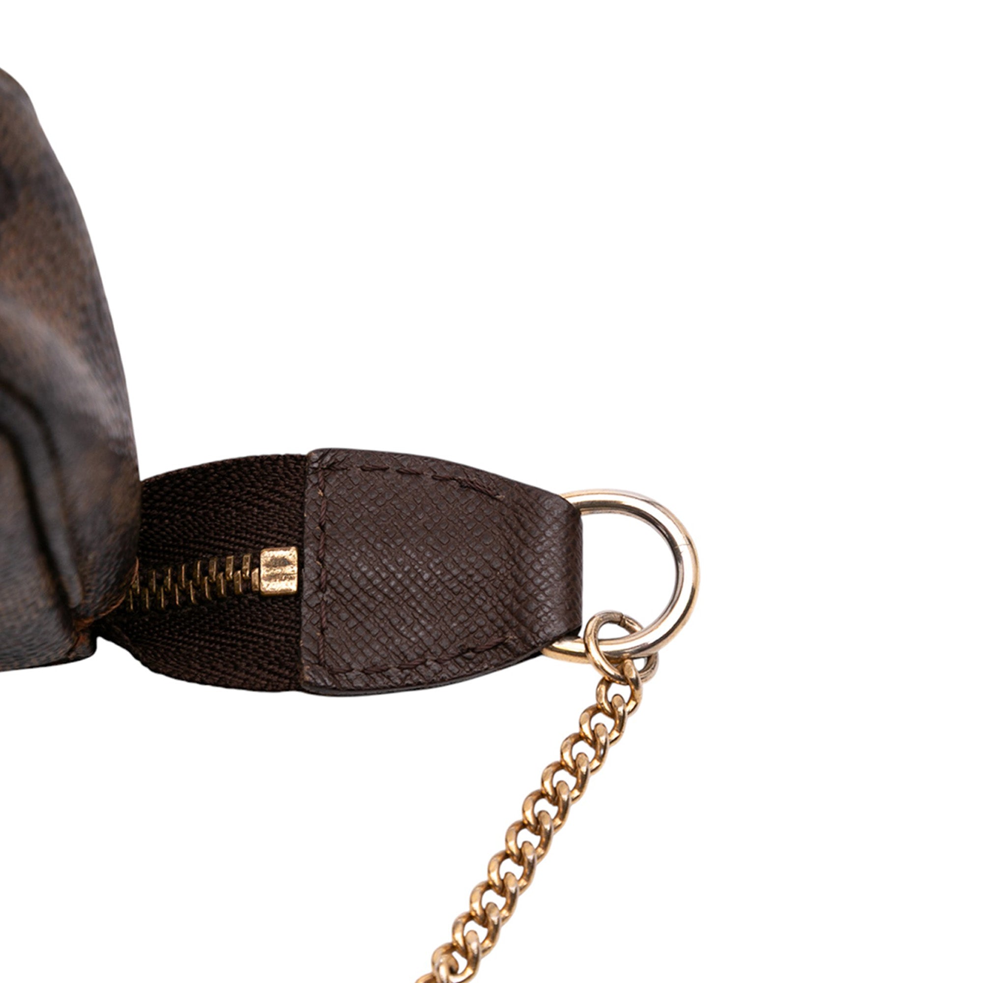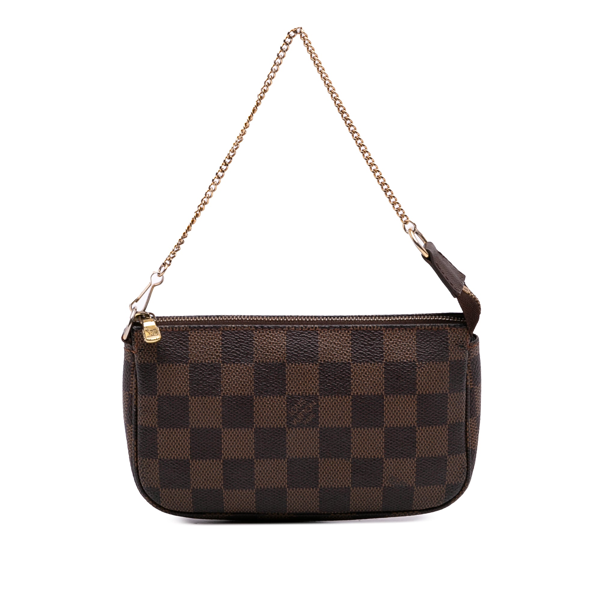 The Mini Pochette Accessoires features a damier ebene canvas body, a gold-tone chain link strap, and a top zip closure. Retail Price: 1035.00