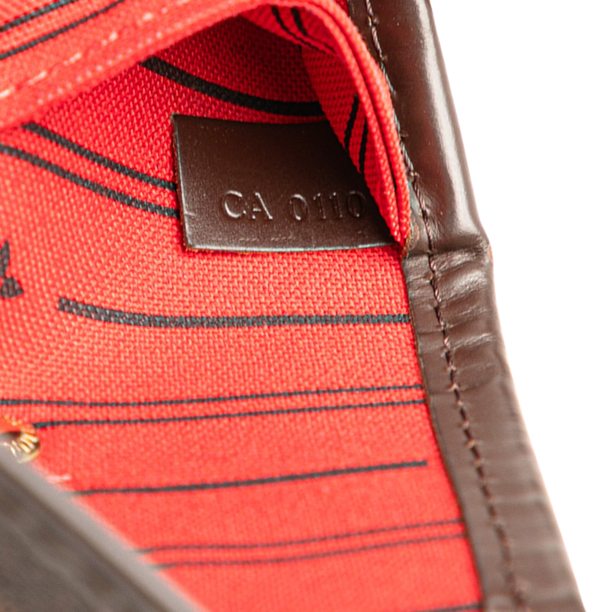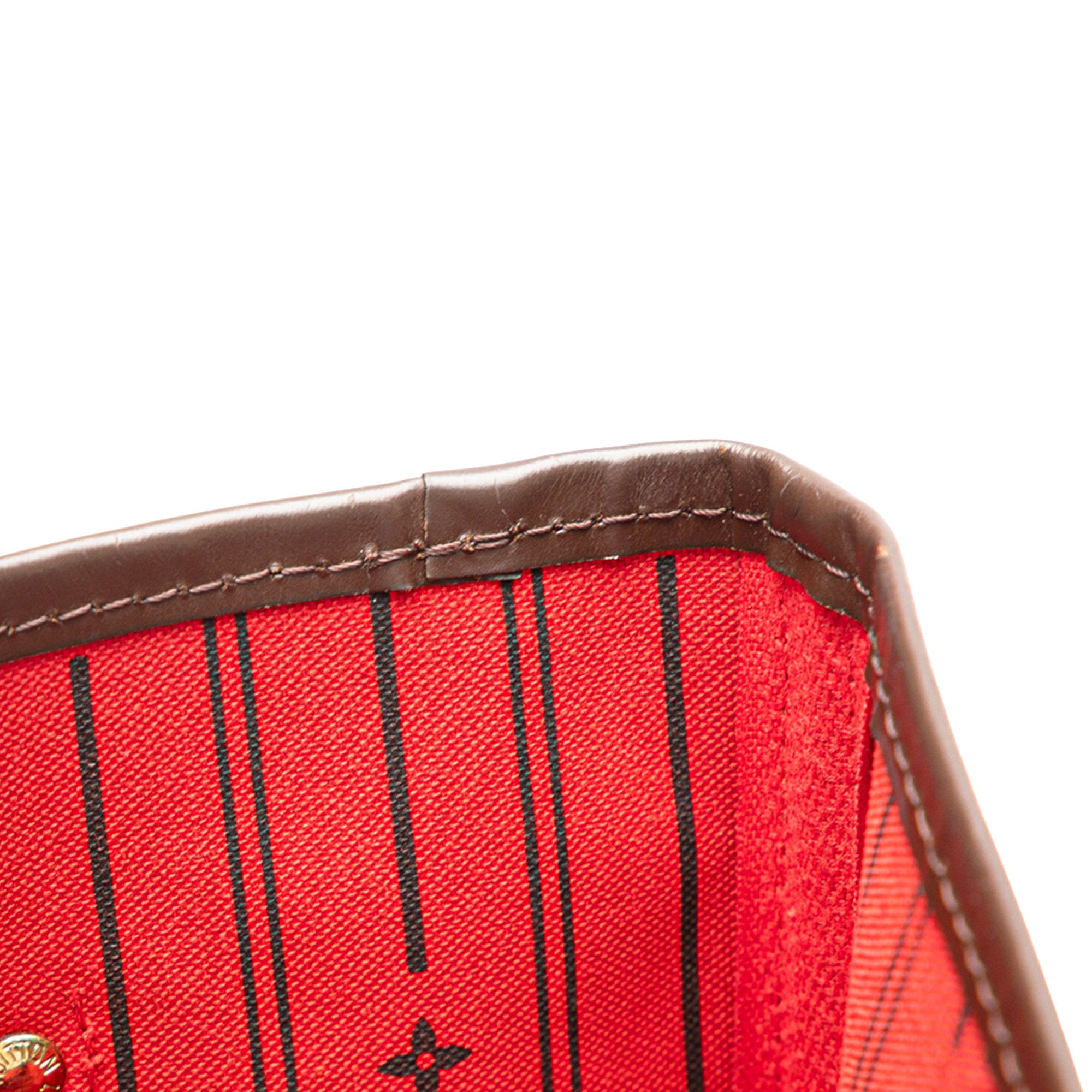 The Neverfull MM features a damier ebene canvas body with leather trim, flat leather shoulder straps, an open top with lobster hook closure, and an interior zip pocket. Retail Price: 1875.00