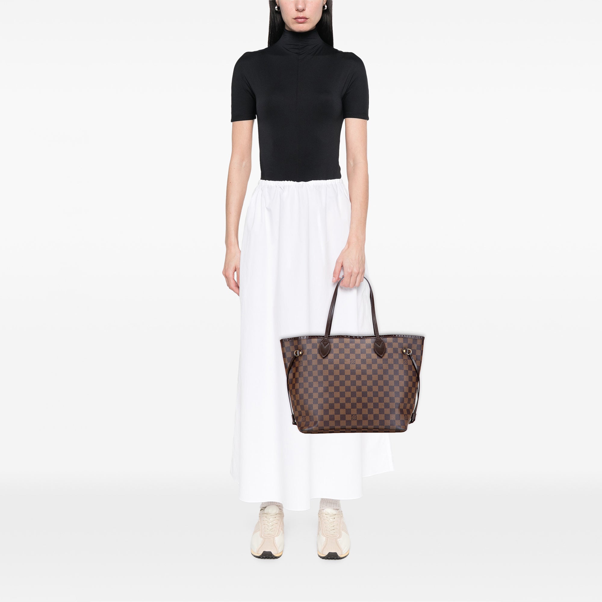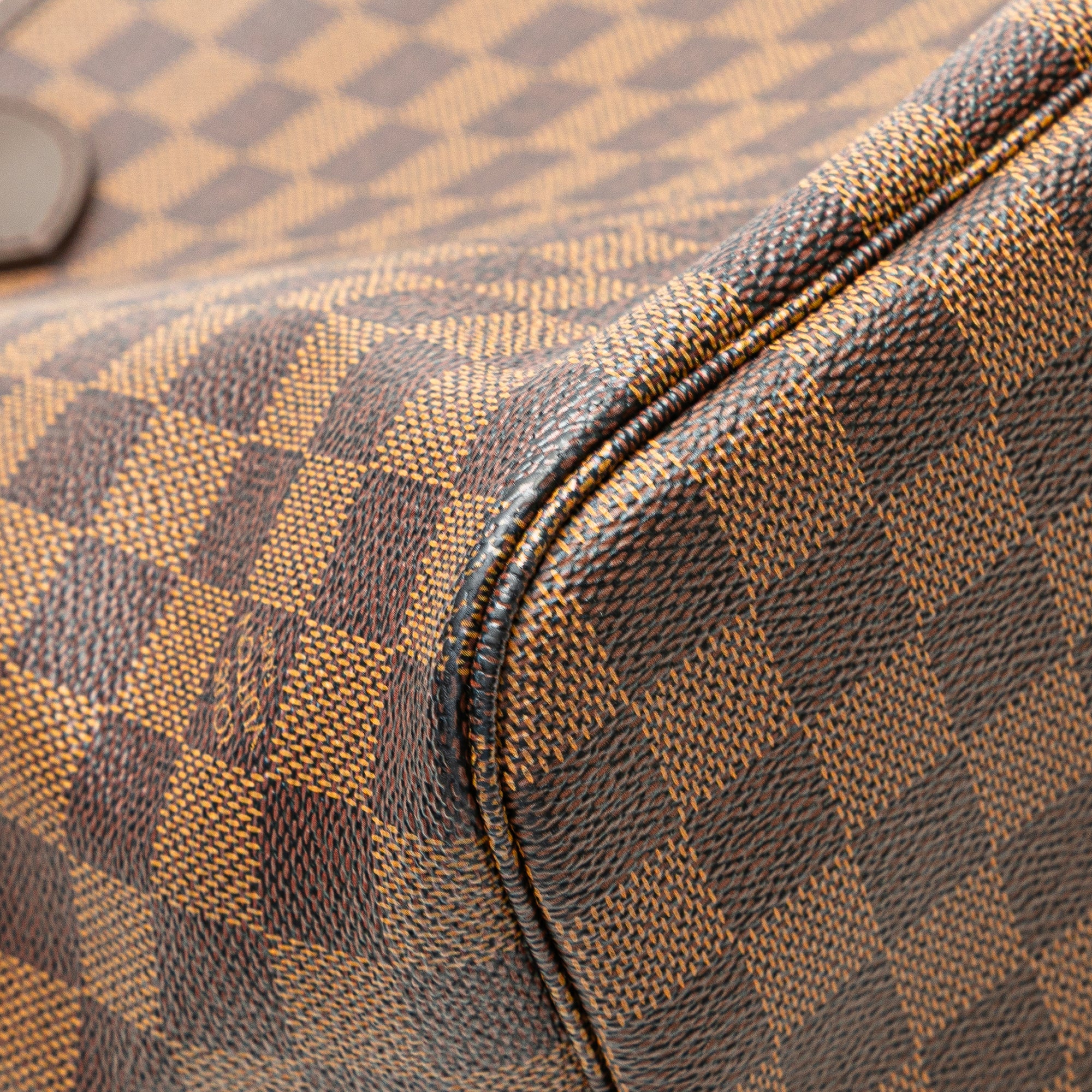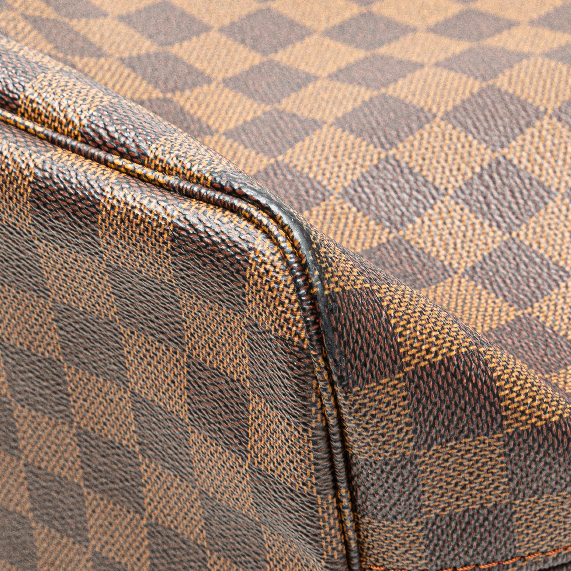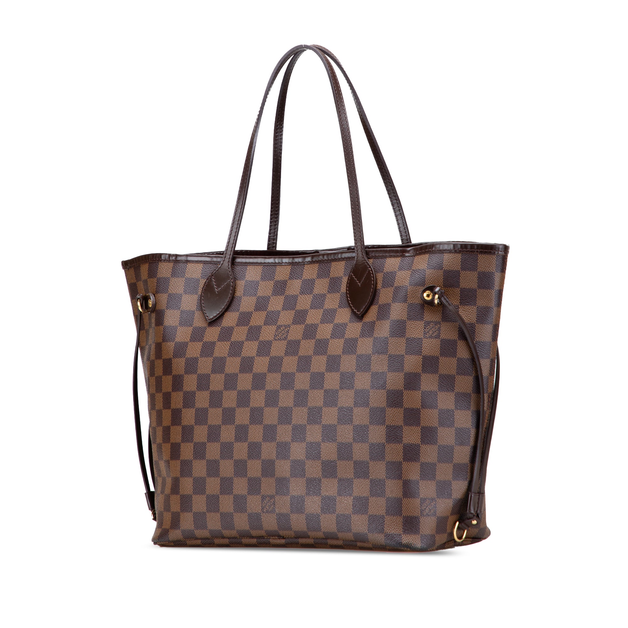 The Neverfull MM features a damier ebene canvas body with leather trim, flat leather shoulder straps, an open top with a lobster clasp closure, and an interior zip pocket. Retail Price: 1790.00