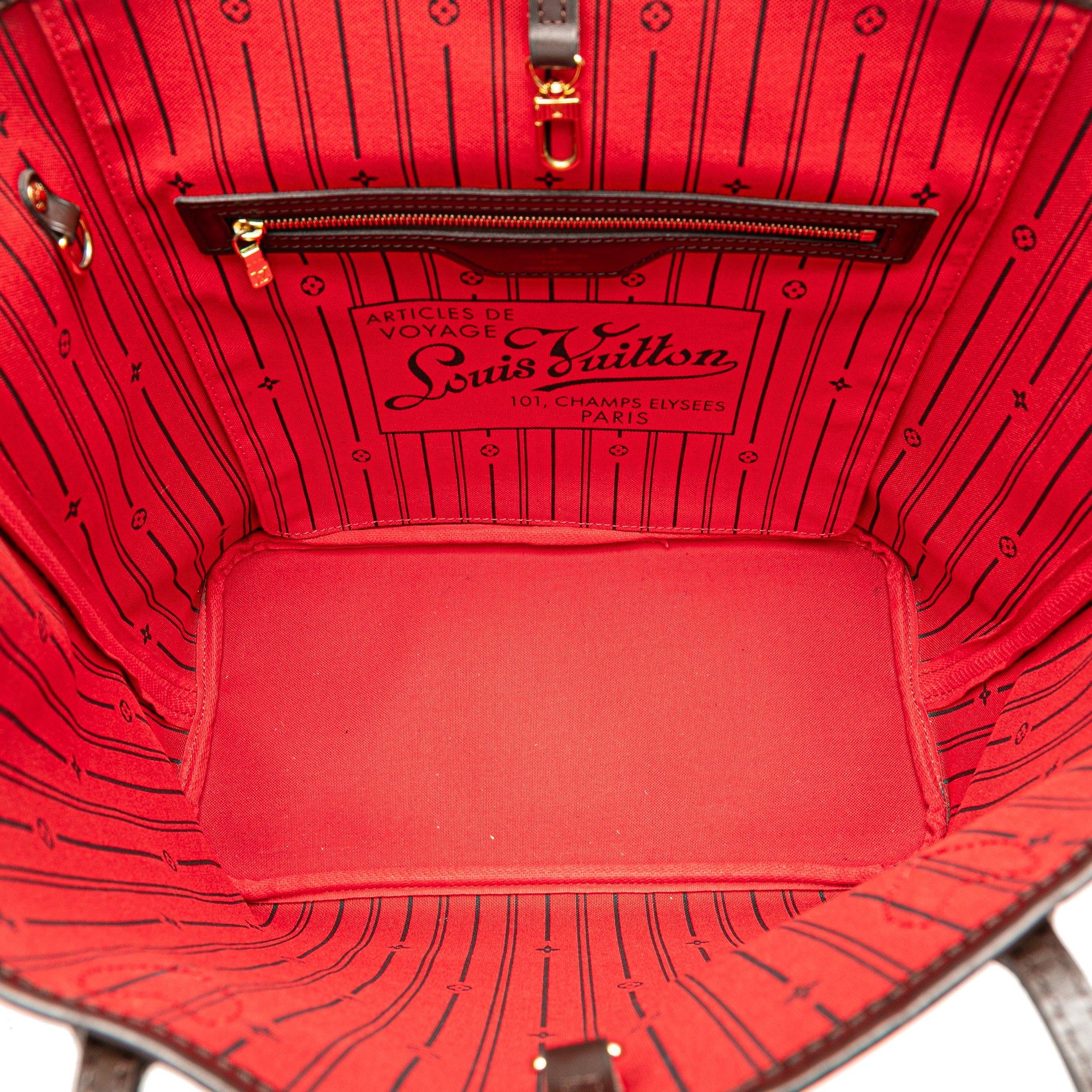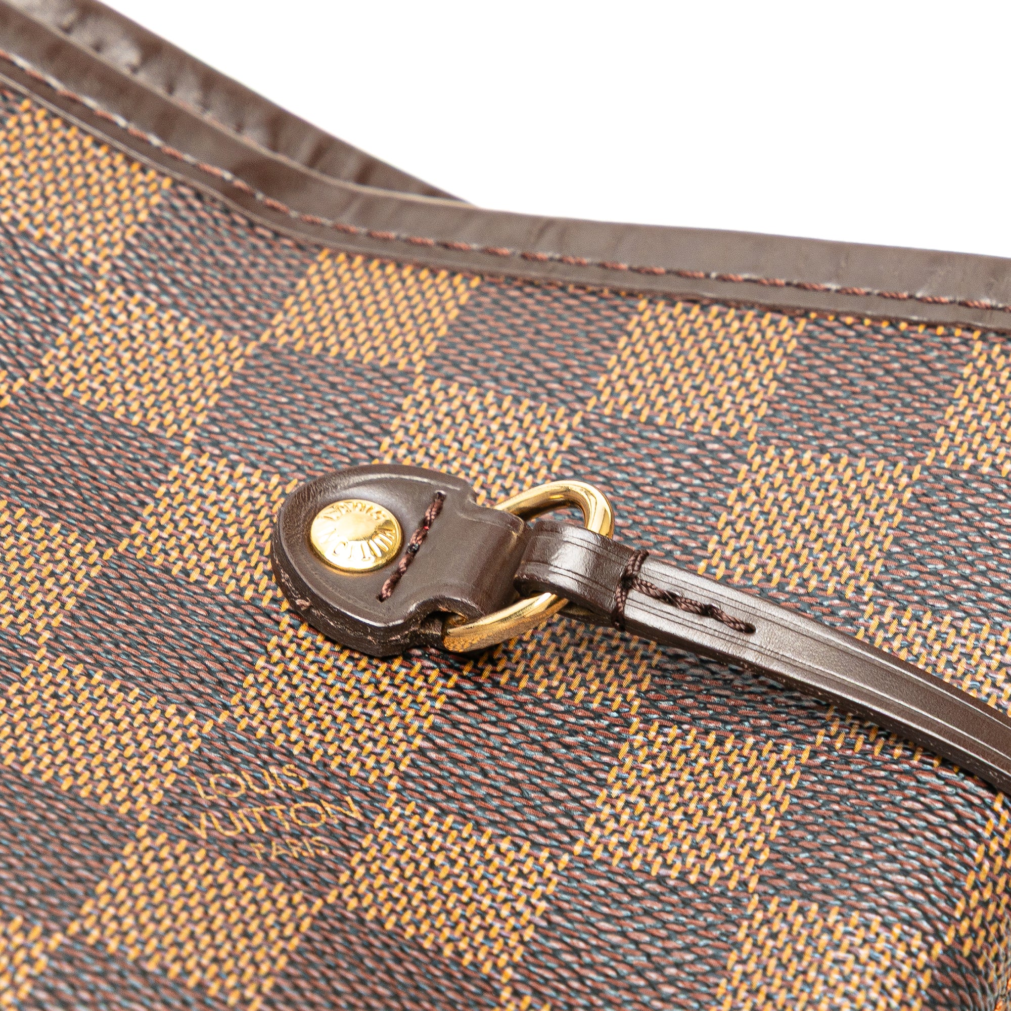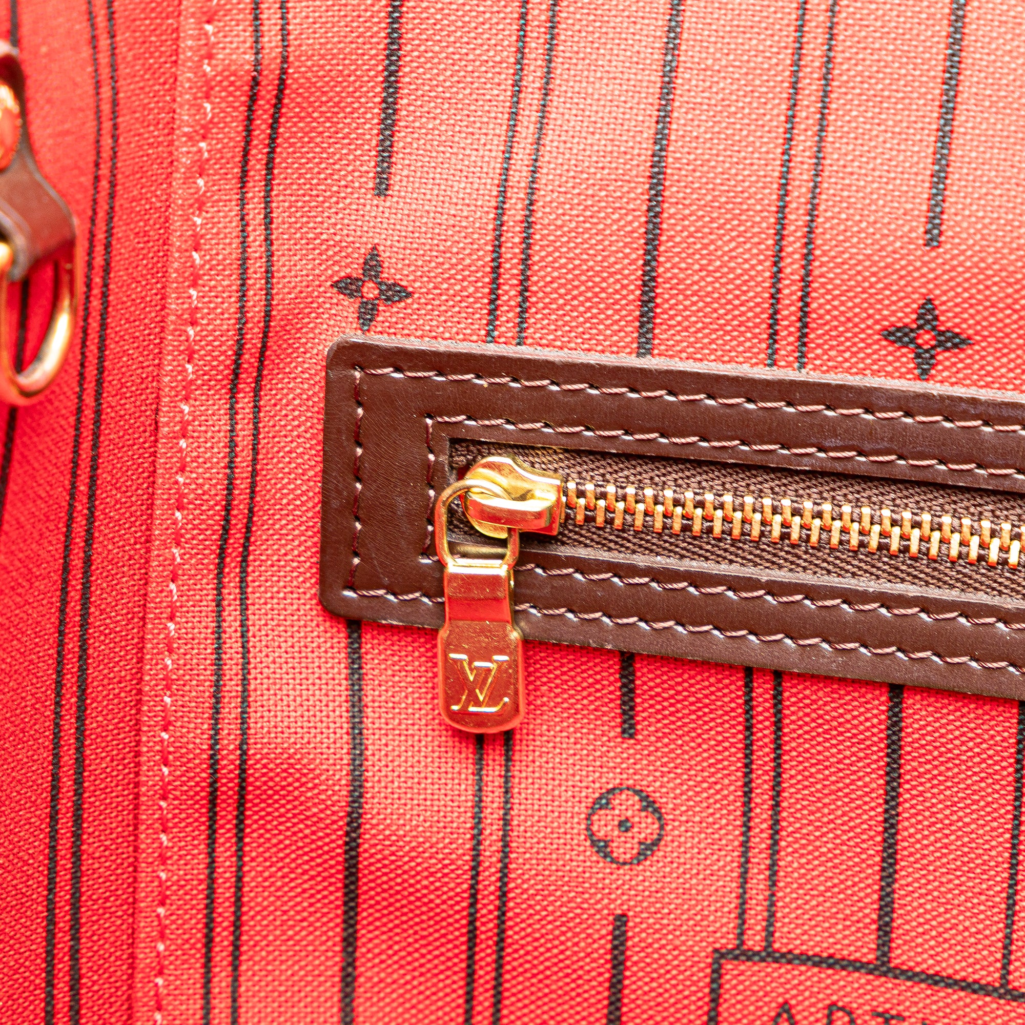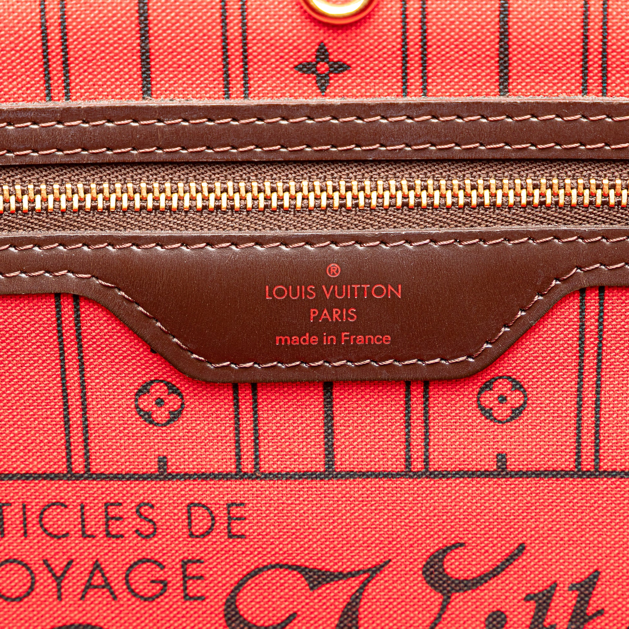 The Neverfull MM features a damier ebene canvas body with leather trim, flat leather shoulder straps, an open top with a lobster clasp closure, and an interior zip pocket. Retail Price: 1790.00