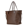 The Neverfull MM features a damier ebene canvas body with leather trim, flat leather shoulder straps, an open top with a lobster claw clasp closure, and an interior zip pocket. Retail Price: 1790.00
