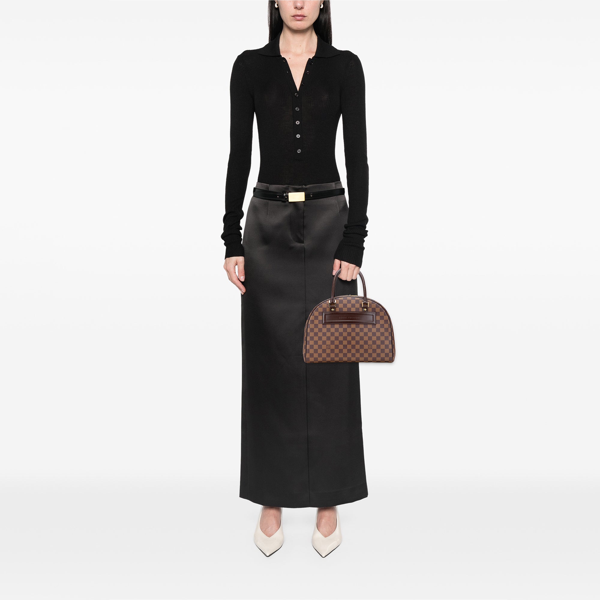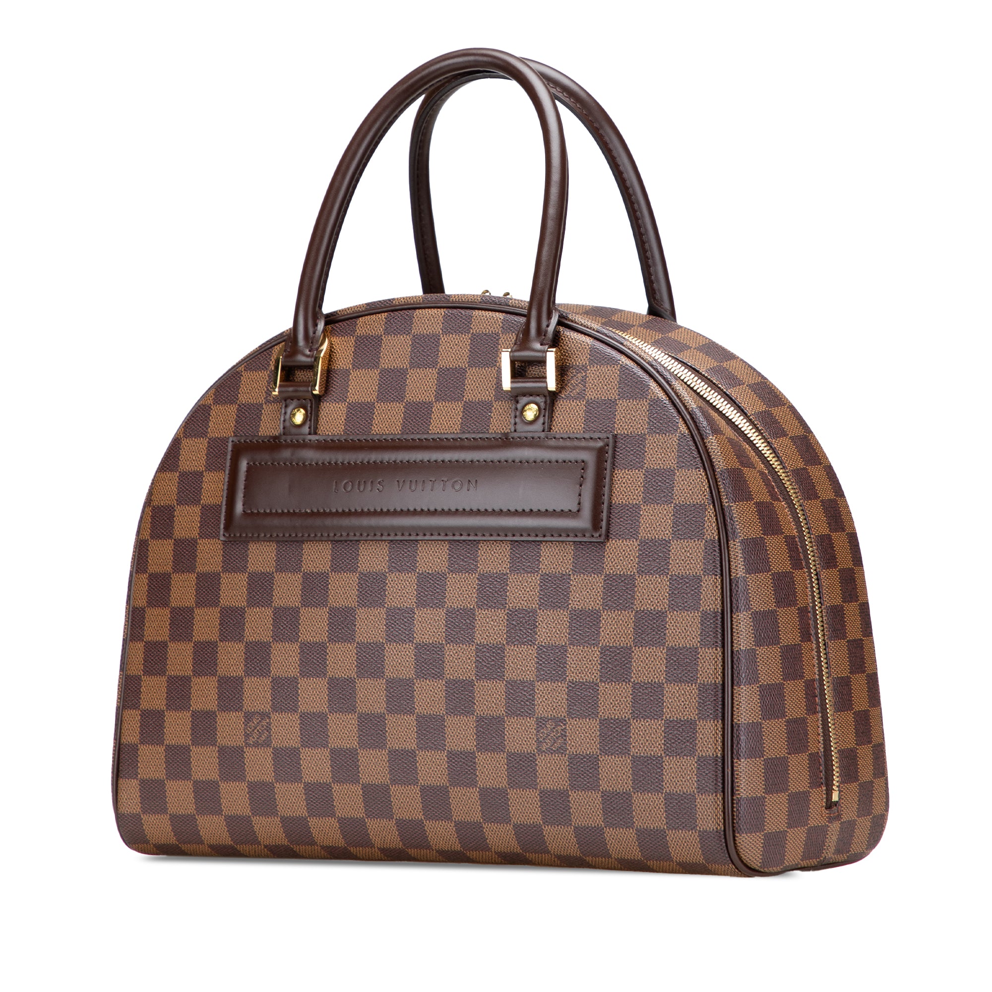 The Nolita 24 Heures features a damier ebene canvas body, rolled leather handles, a top zip closure, and interior zip and slip pockets. Retail Price: 1348.00