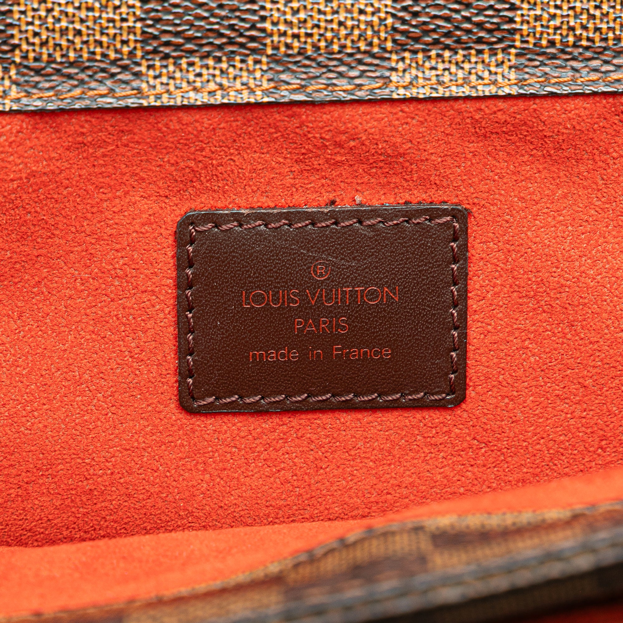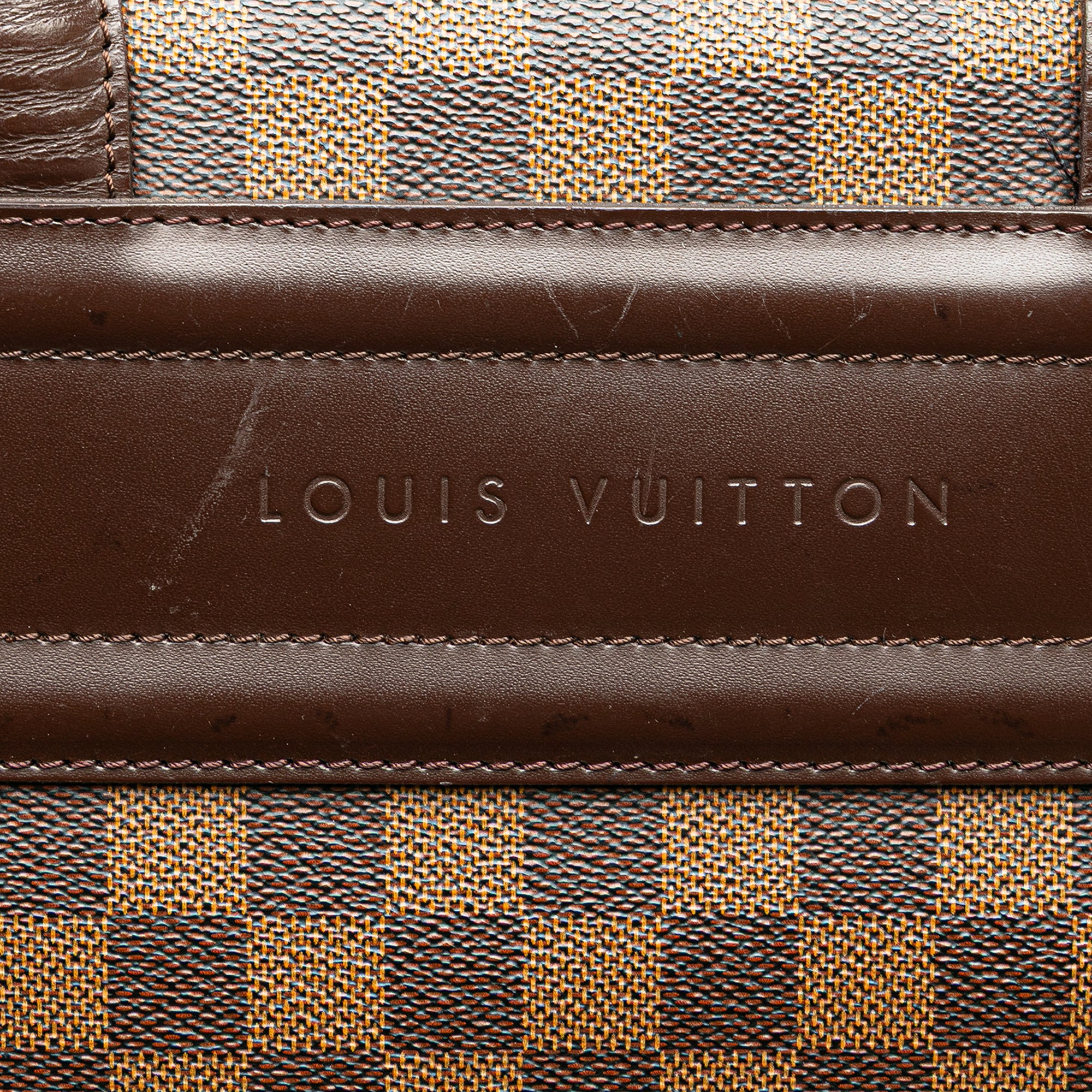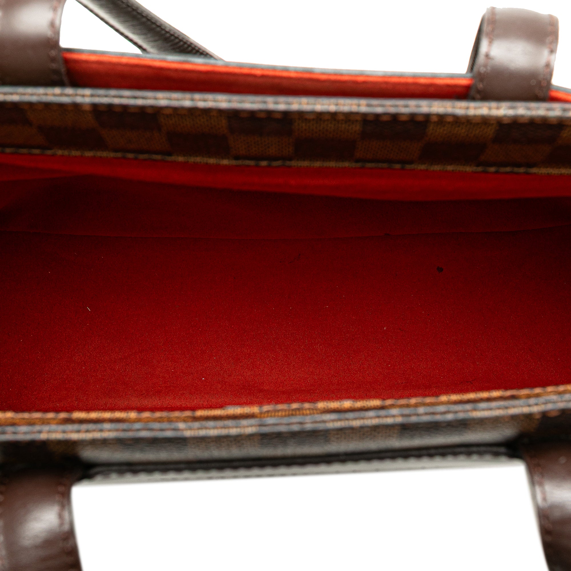 The Parioli PM features a damier ebene canvas body with leather trim, flat leather straps, an open top with magnetic snap closure, and interior slip pockets. Retail Price: 1290.00