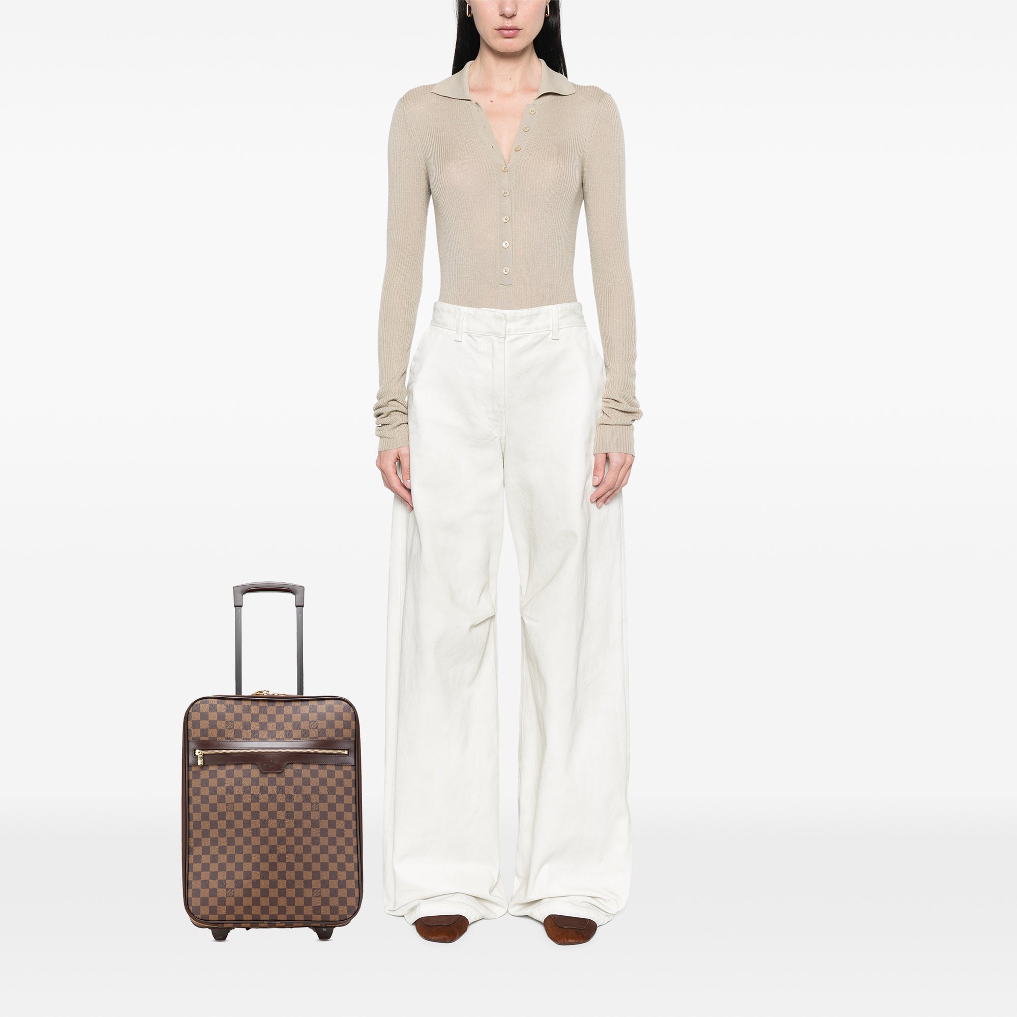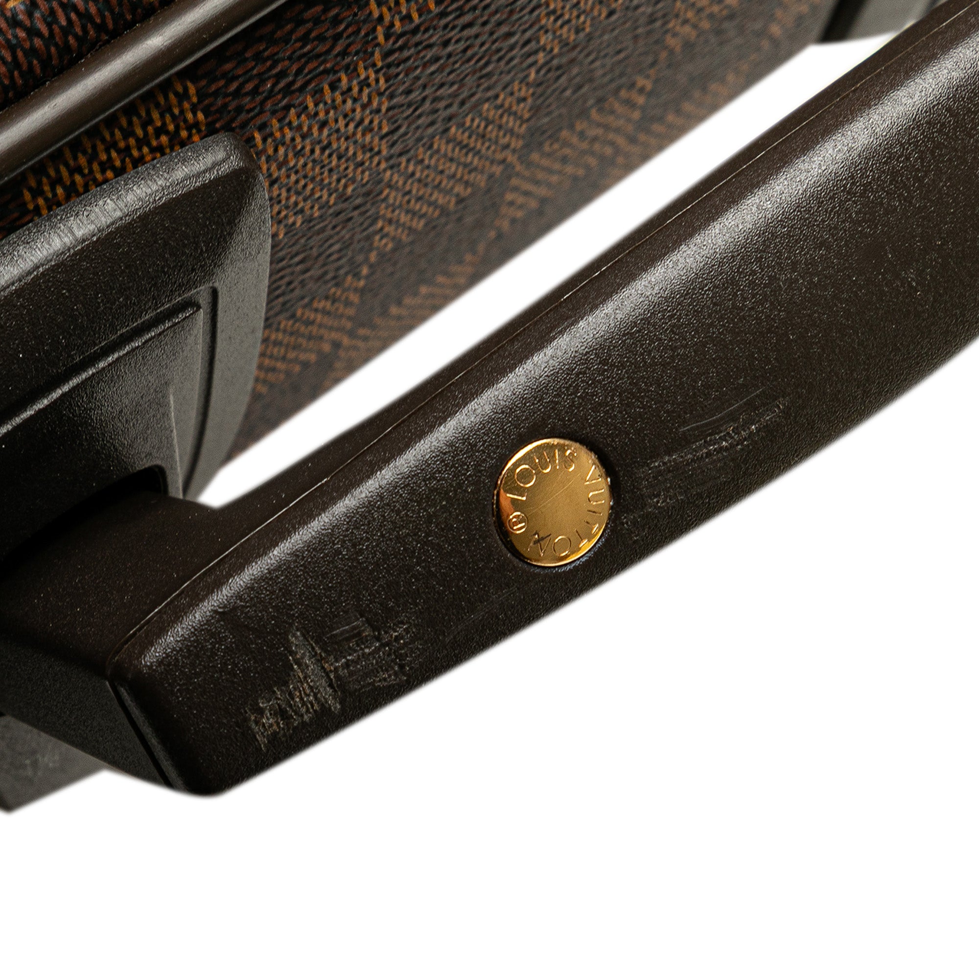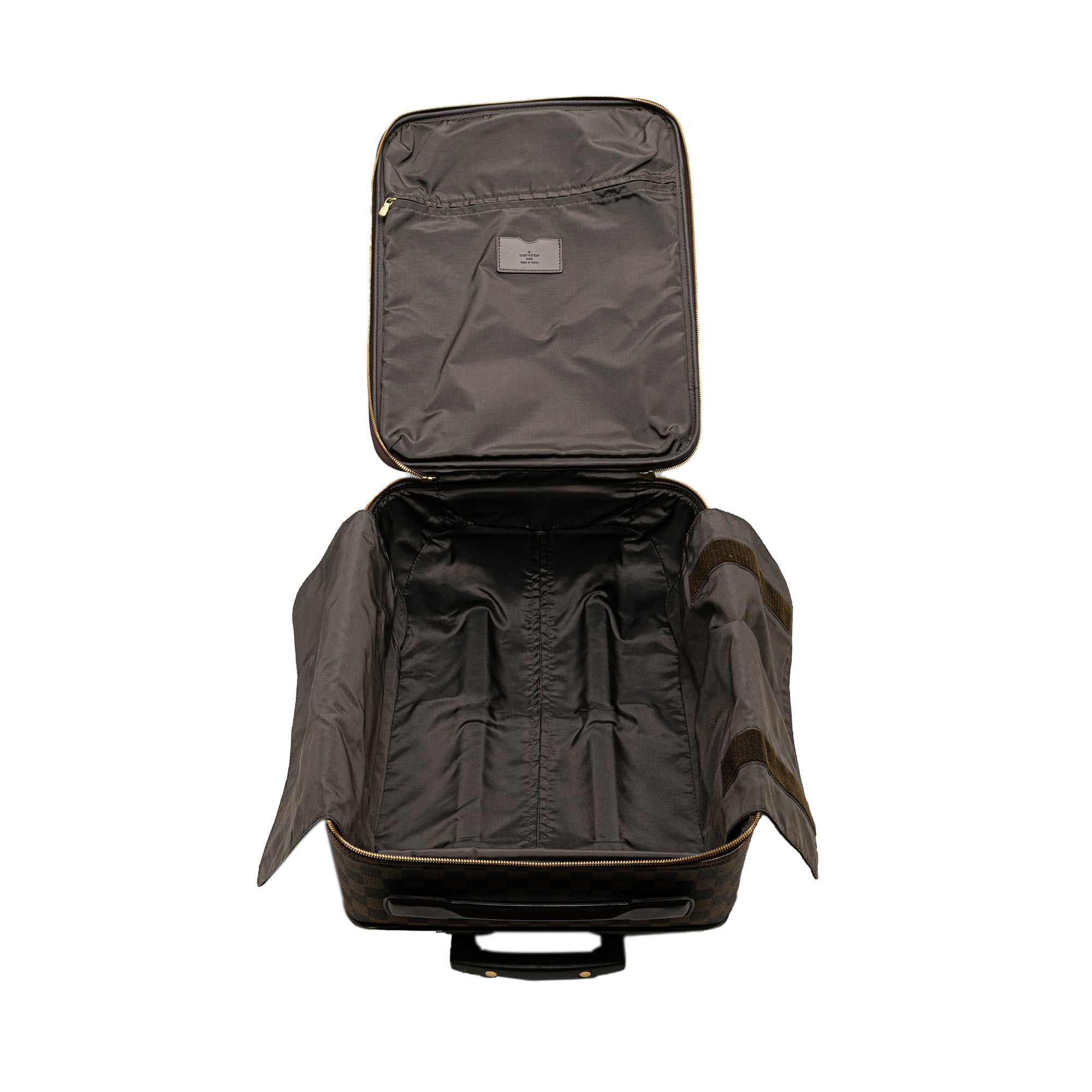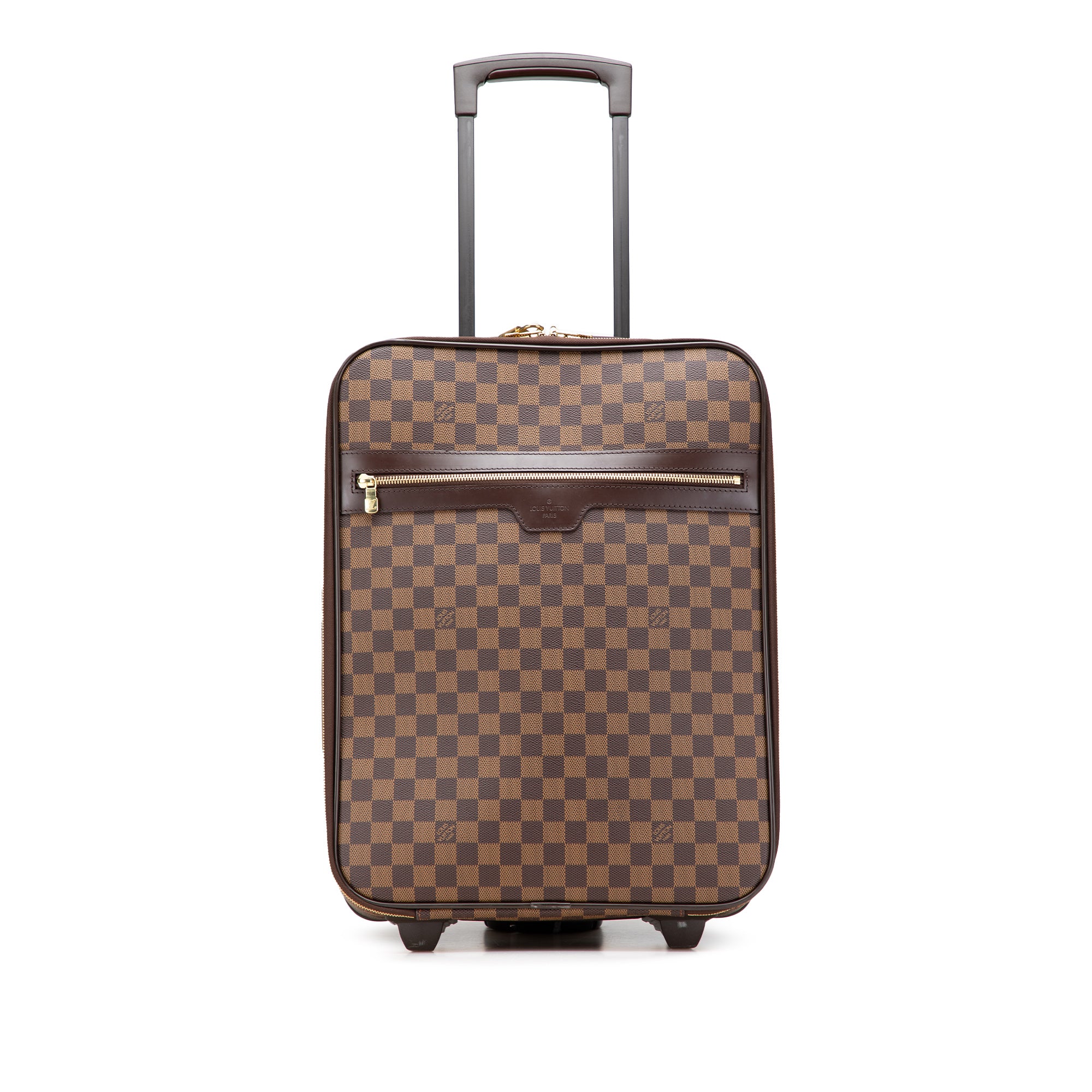 The Pegase 45 features a damier ebene canvas body with leather trim, a flat leather top handle, a retractable top handle, dual wheels, a zip-around closure, an exterior front zip pocket, and an interior zip pocket. Retail Price: 2490.00
