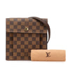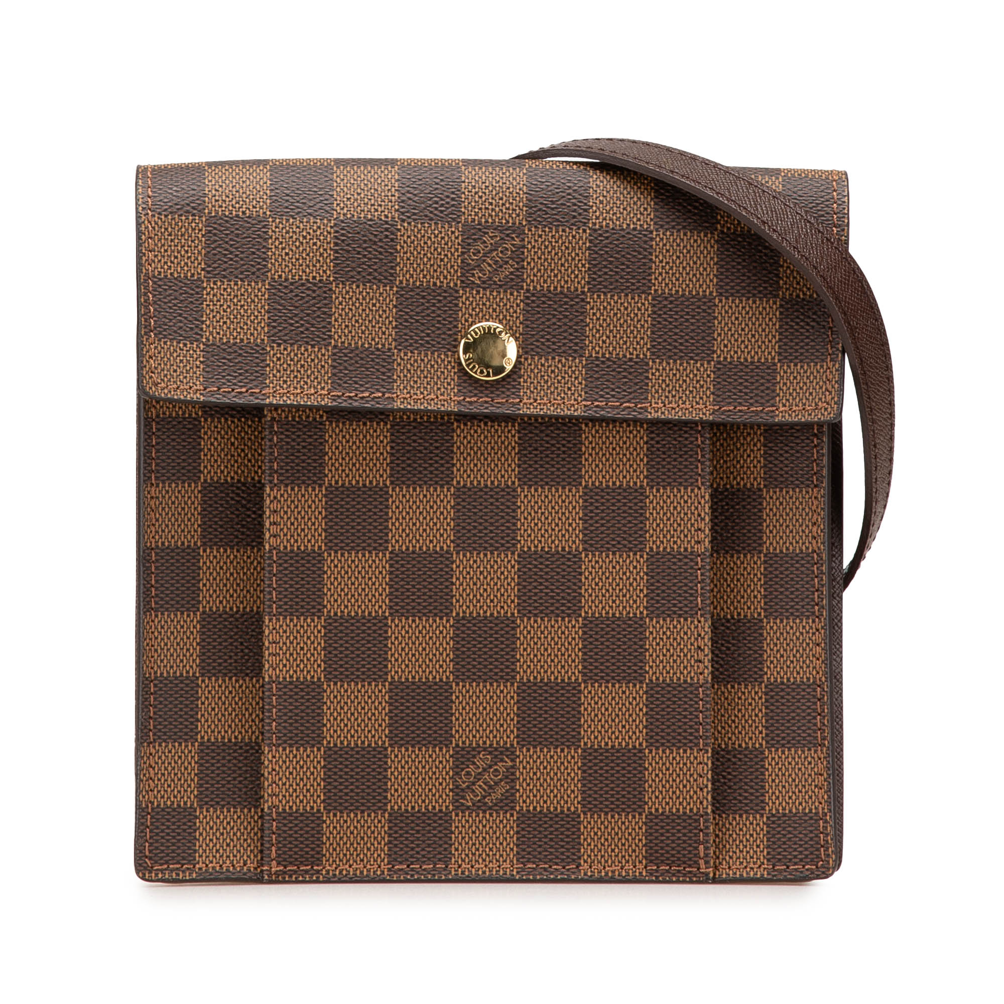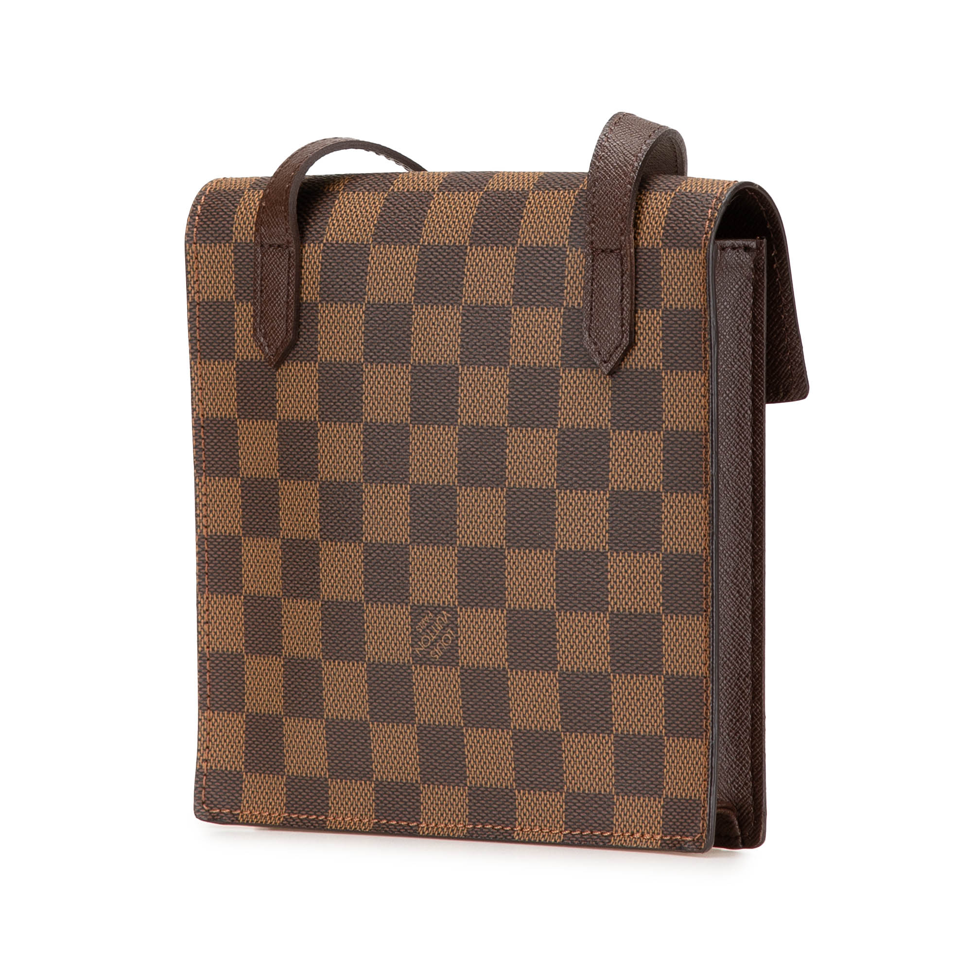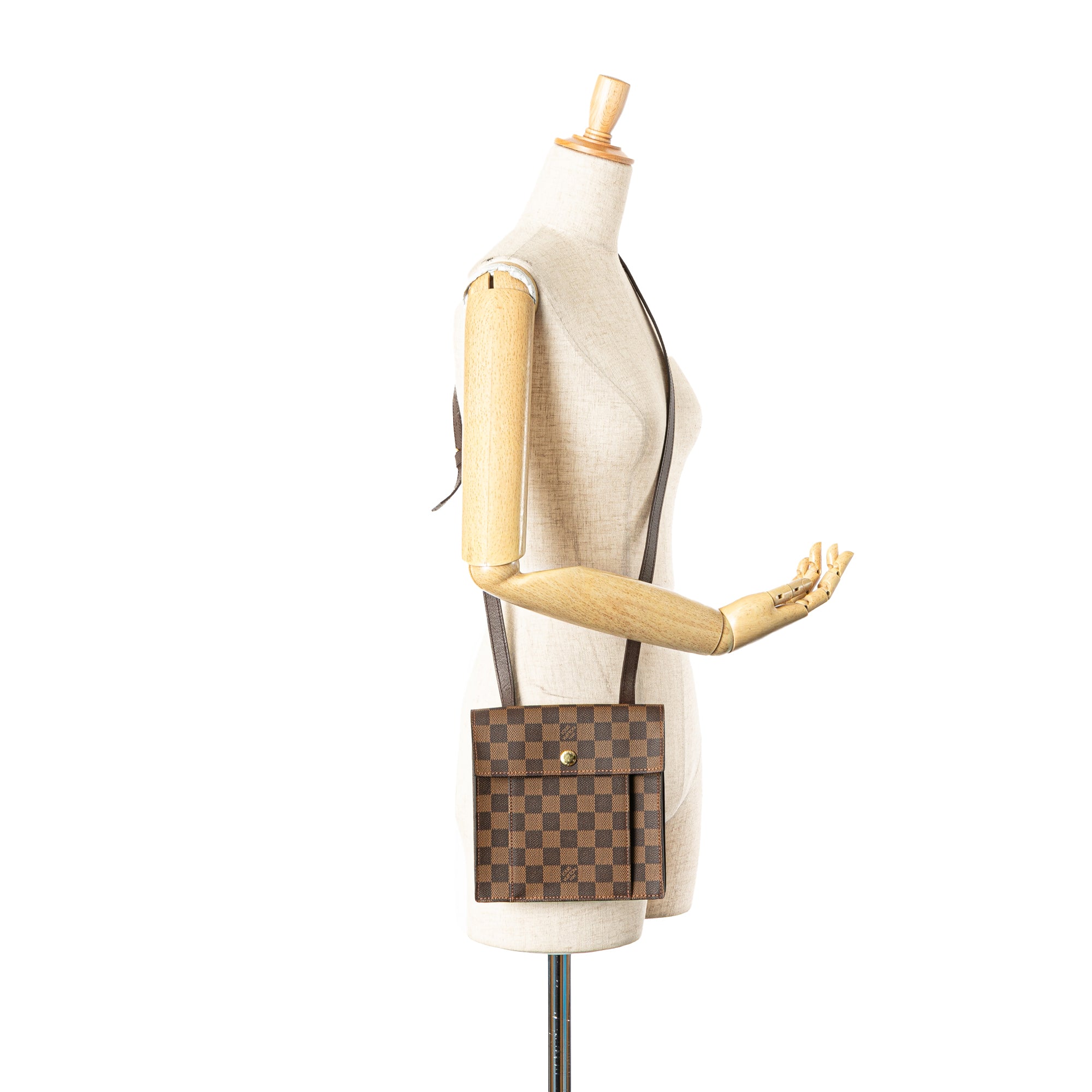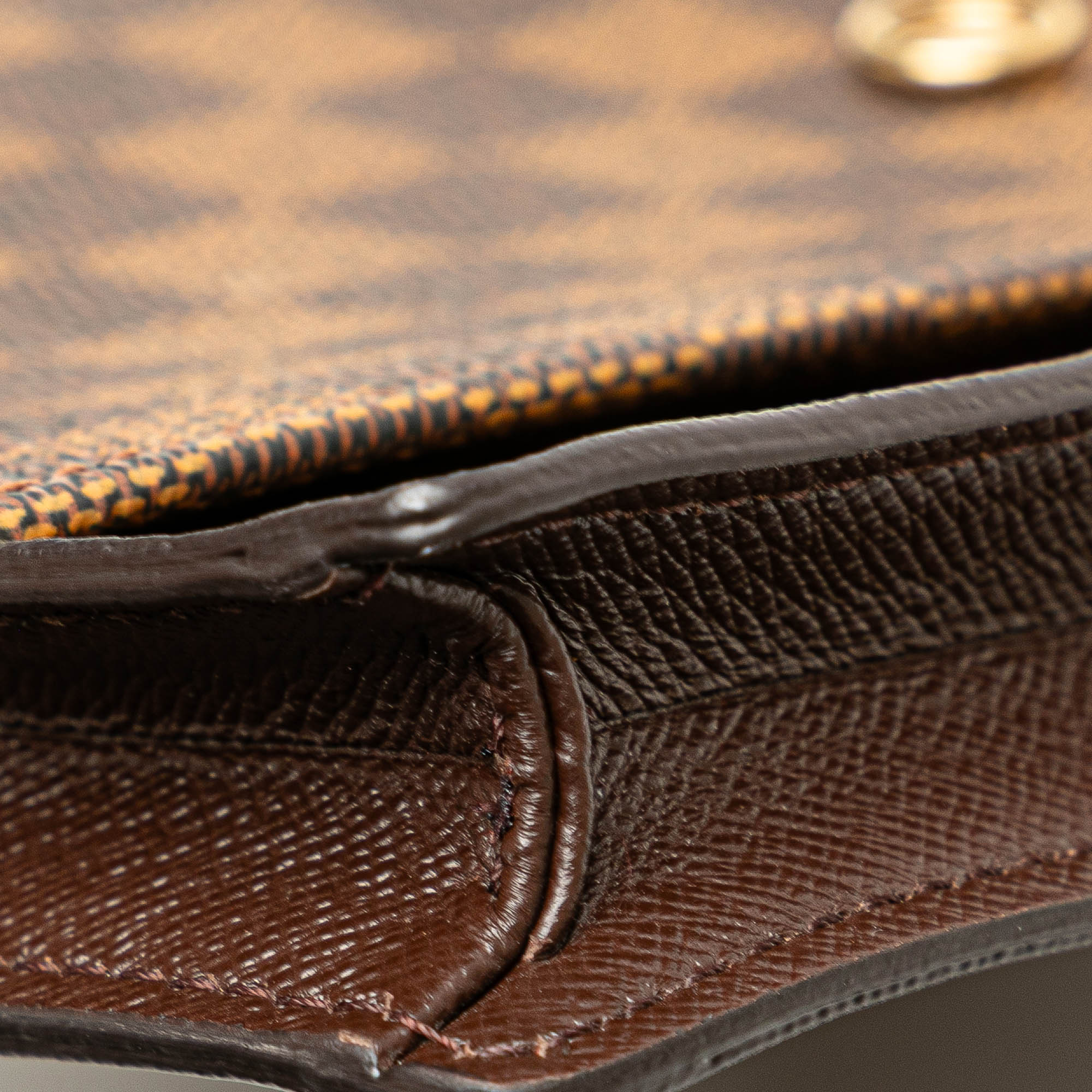 The Pimlico features a damier ebene canvas body with leather trim, an adjustable leather strap, and a front flap with a snap button closure. Inclusion: Dust bag. Retail Price: 985.00