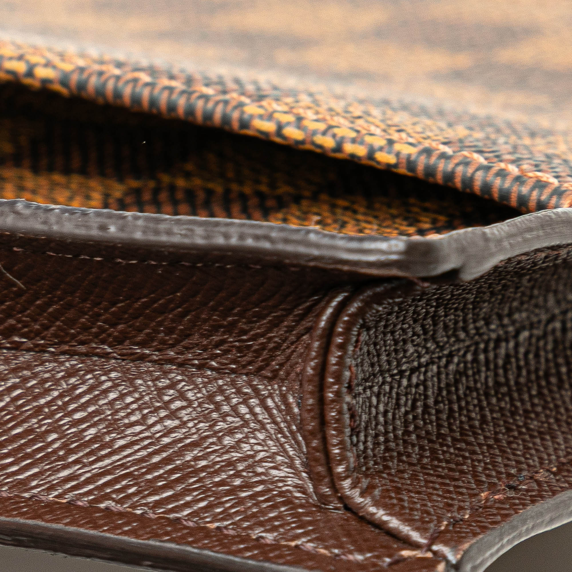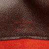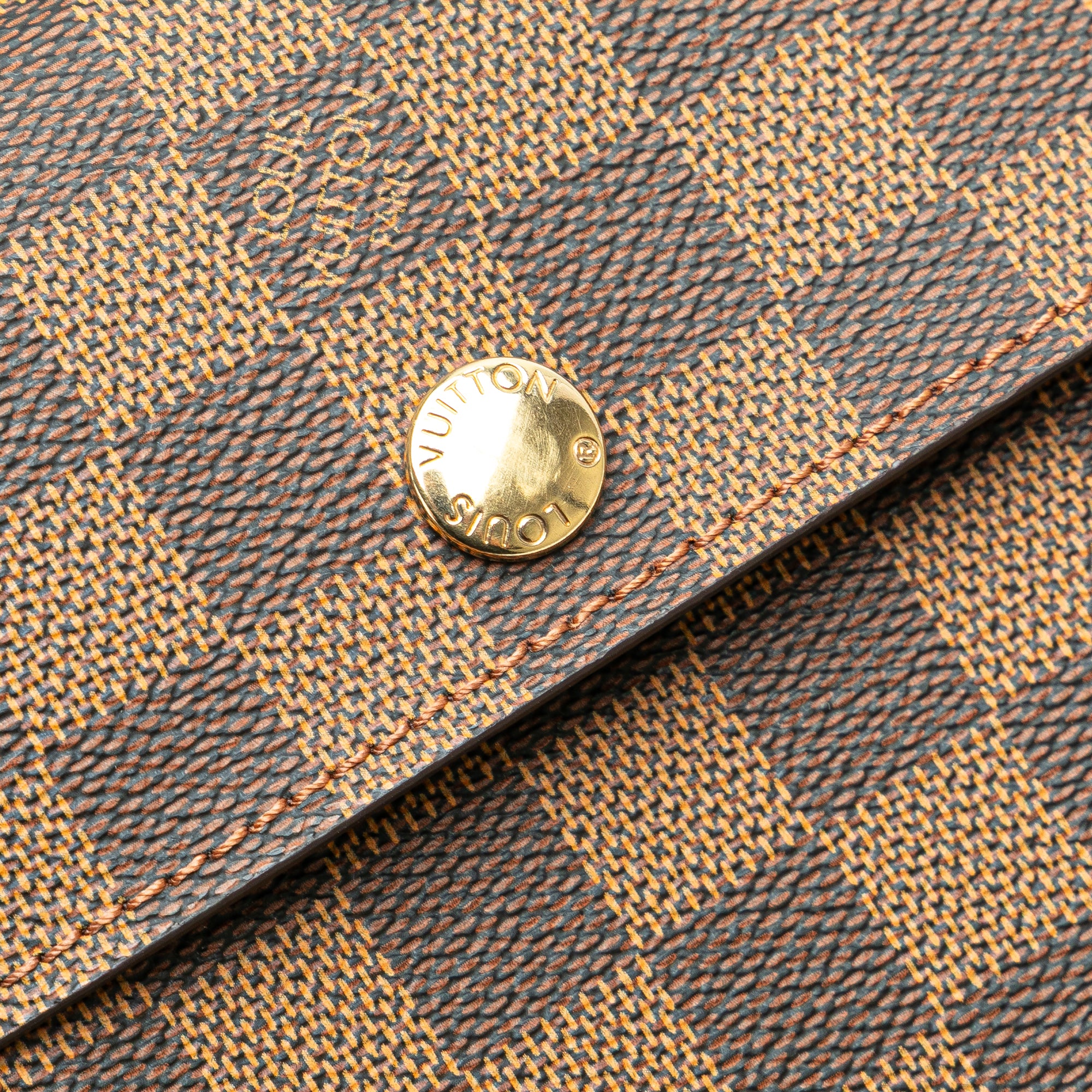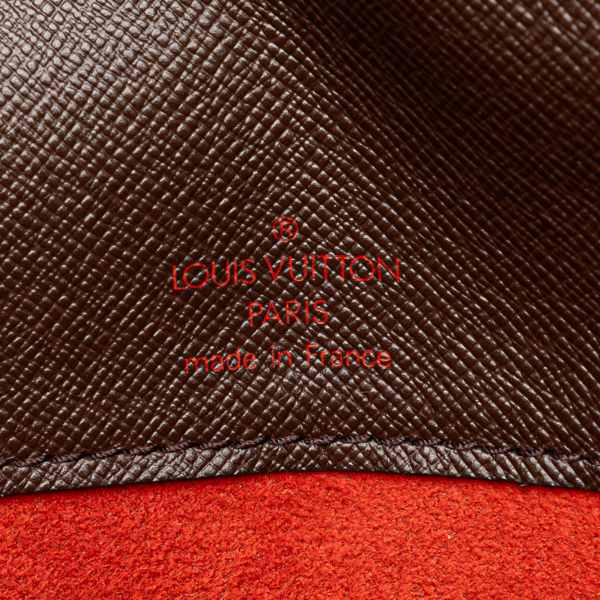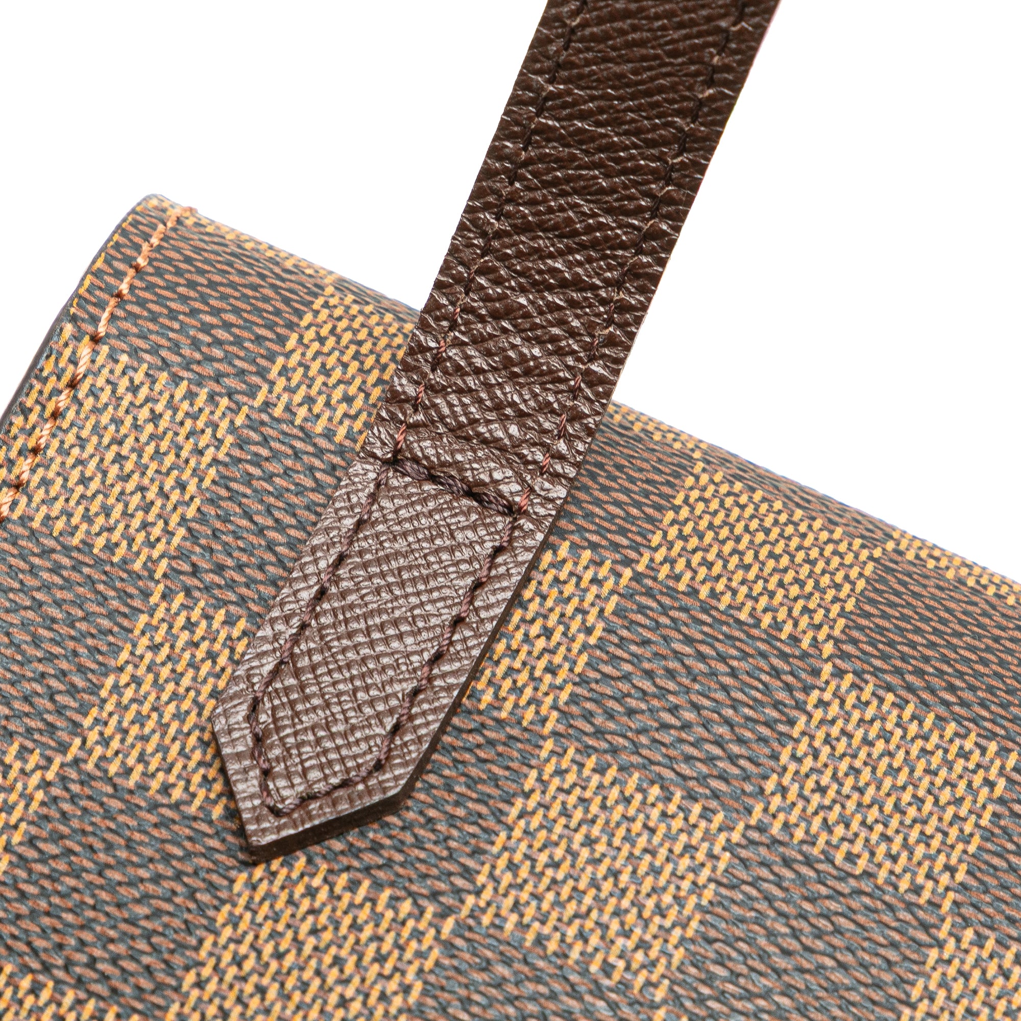 The Pimlico features a damier ebene canvas body with leather trim, an adjustable leather strap, and a front flap with a snap button closure. Inclusion: Dust bag. Retail Price: 985.00
