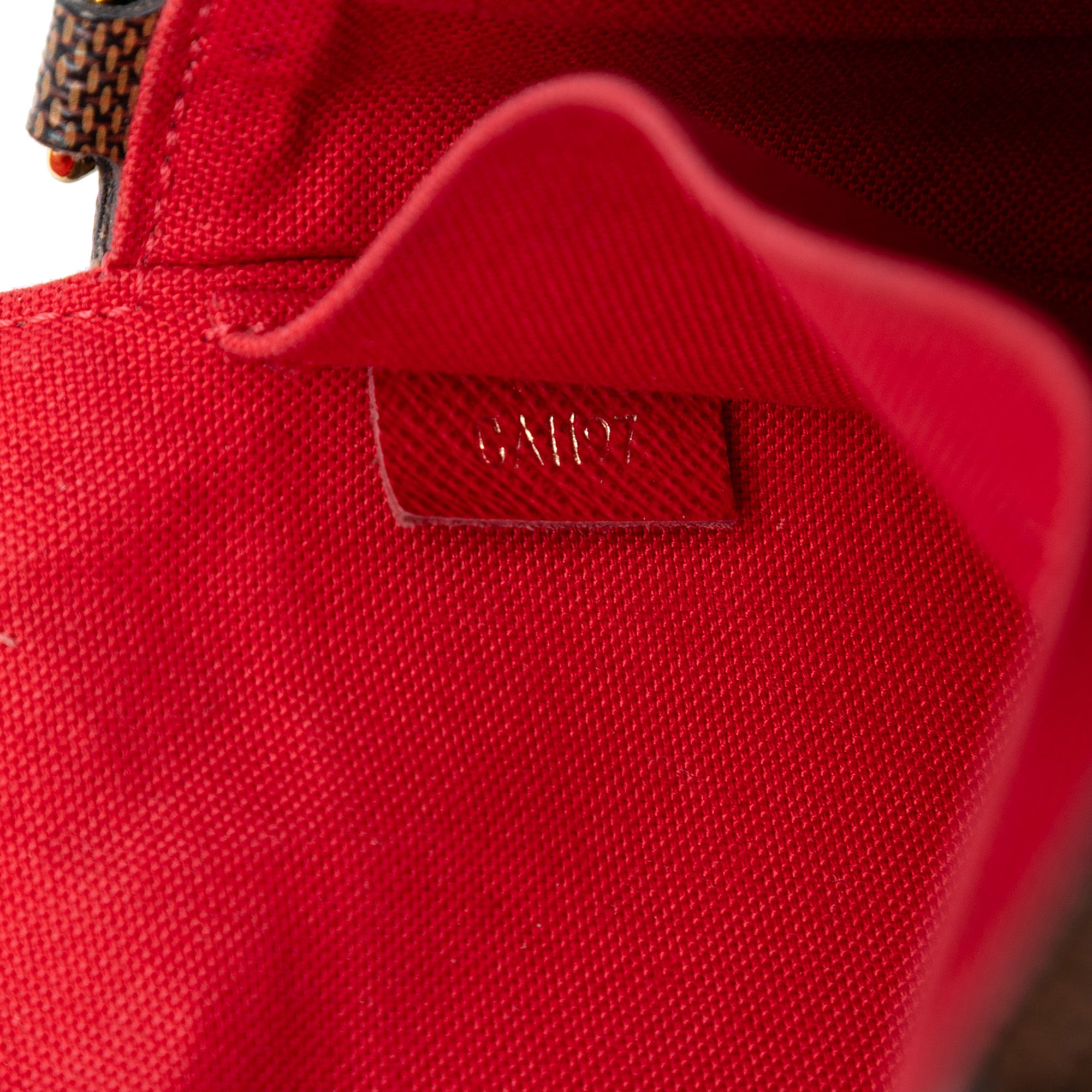 The Pochette Felicie crossbody bag features a damier ebene canvas body, a detachable gold-tone chain link shoulder strap, a top flap with snap closure, an interior slip pocket, and a detachable pouch inclusion. Retail Price: 1790.00