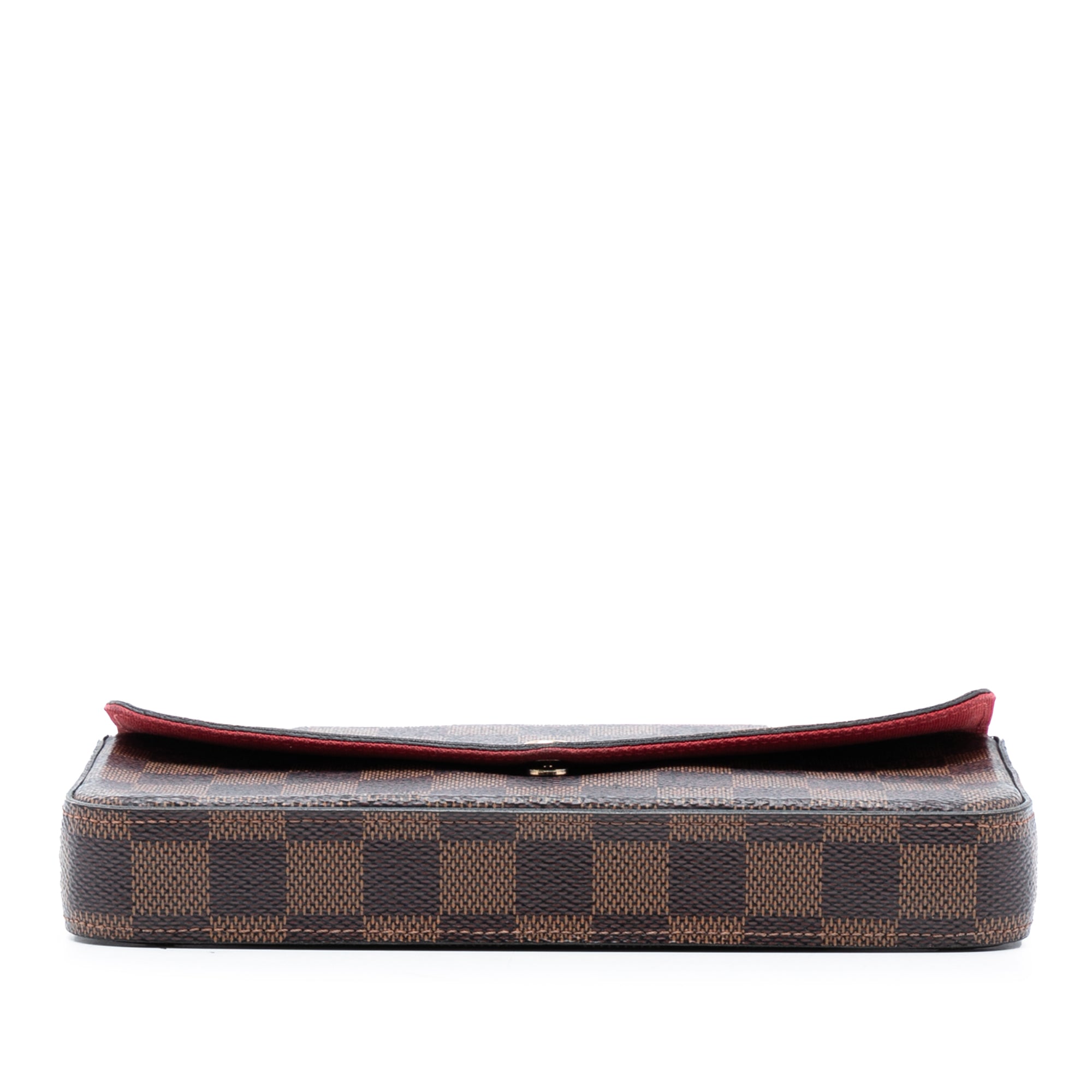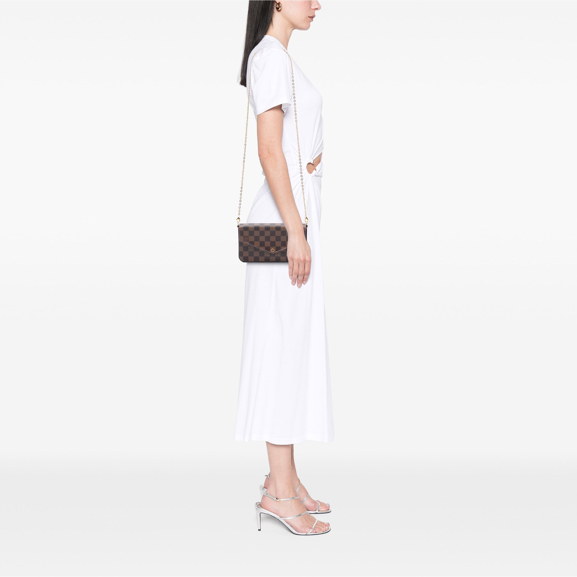 The Pochette Felicie crossbody bag features a damier ebene canvas body, a detachable gold-tone chain link shoulder strap, a top flap with snap closure, and an interior slip pocket. Retail Price: 1790.00