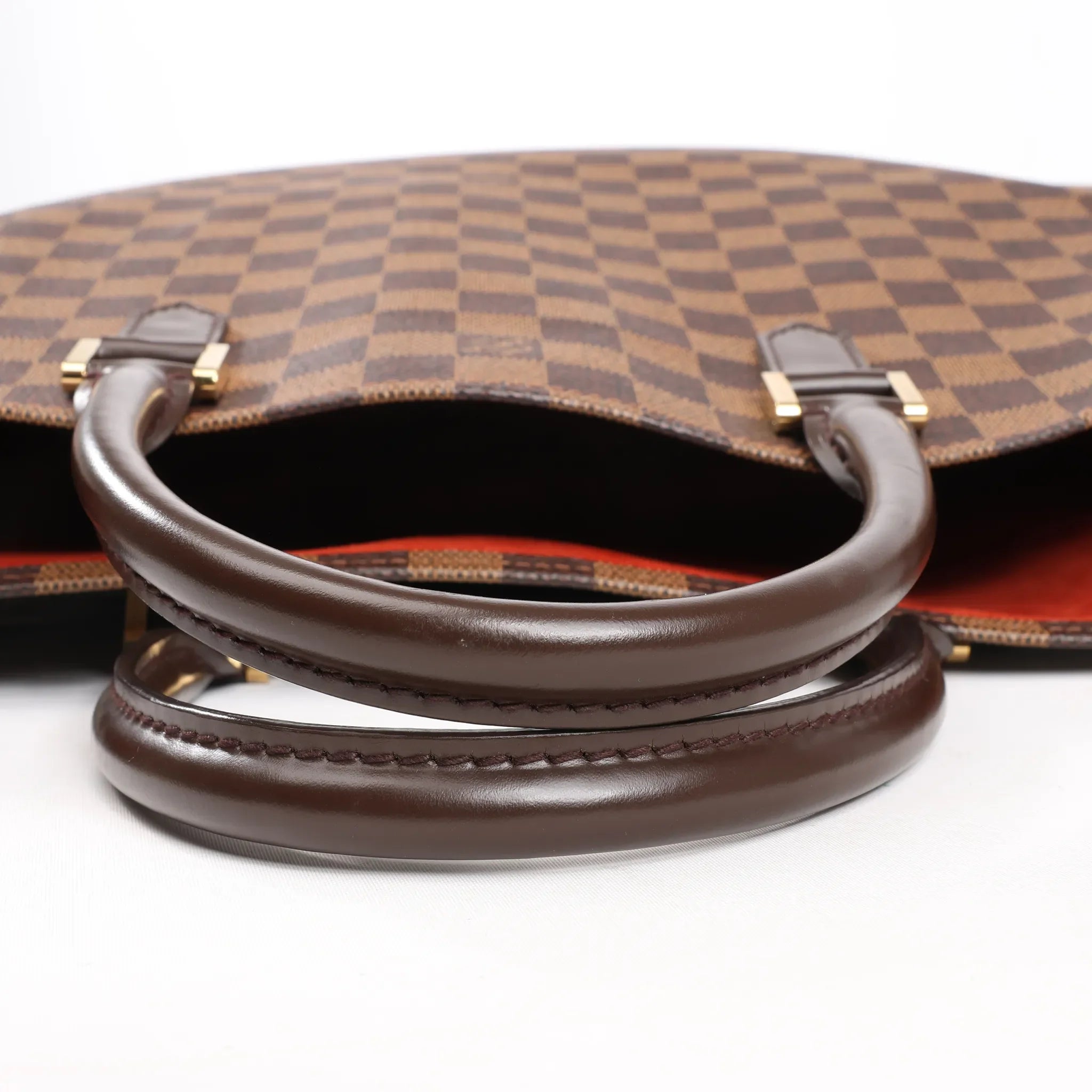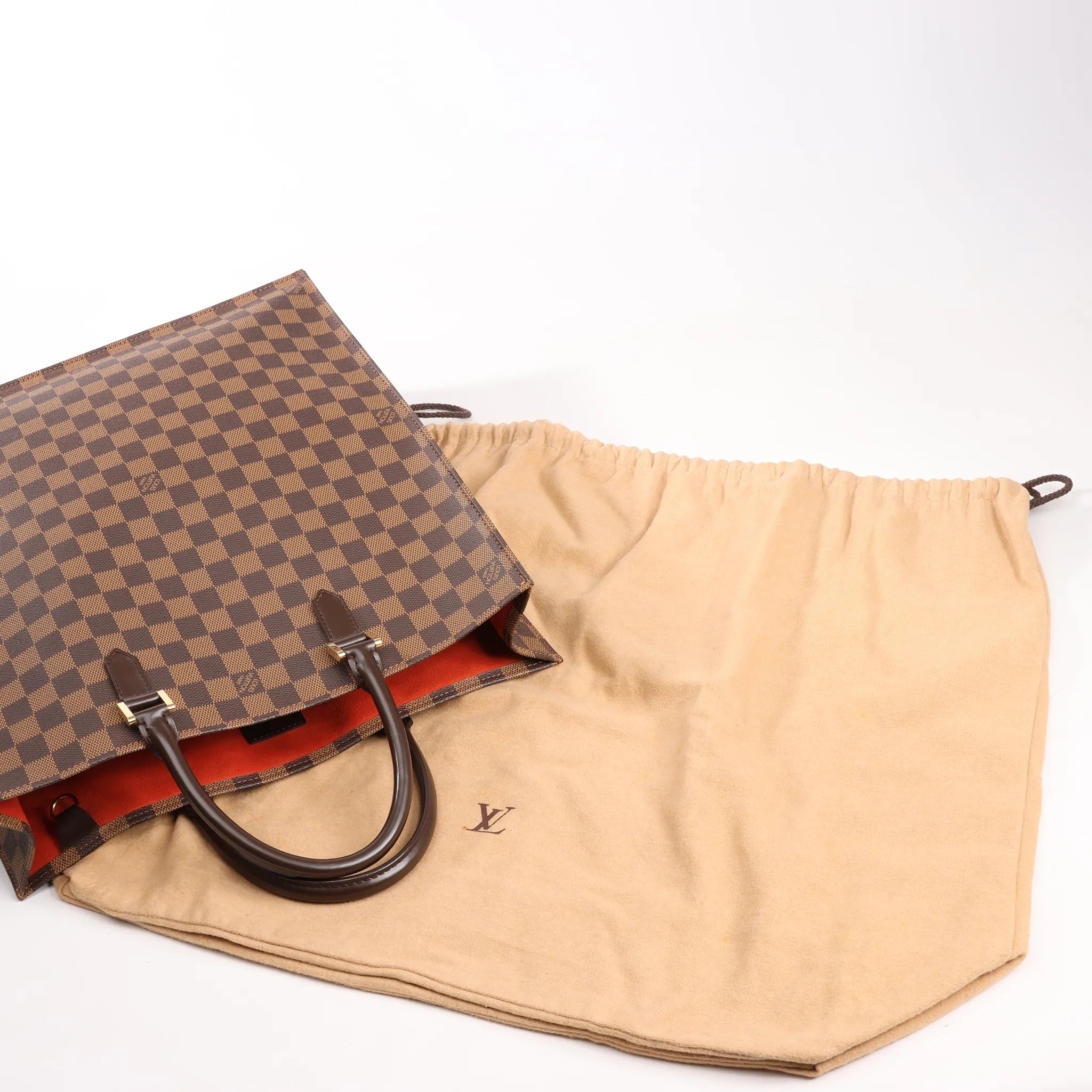 Brand: Louis Vuitton Model: Sac PlatSize: PMWidth: 35 cm Height: 37.5 cmExterior Condition: Excellent Interior Condition: ExcellentCondition Details: The outside canvas is clean and beautiful, in excellent condition with light rubbings on the corners. The leather handles are in great condition. The suede interior is clean and in very good condition. Date code: MI1003Colour: BrownInterior Colour: RedHardware Colour: GoldMaterial: Leather, CanvasComes With: Dustbag