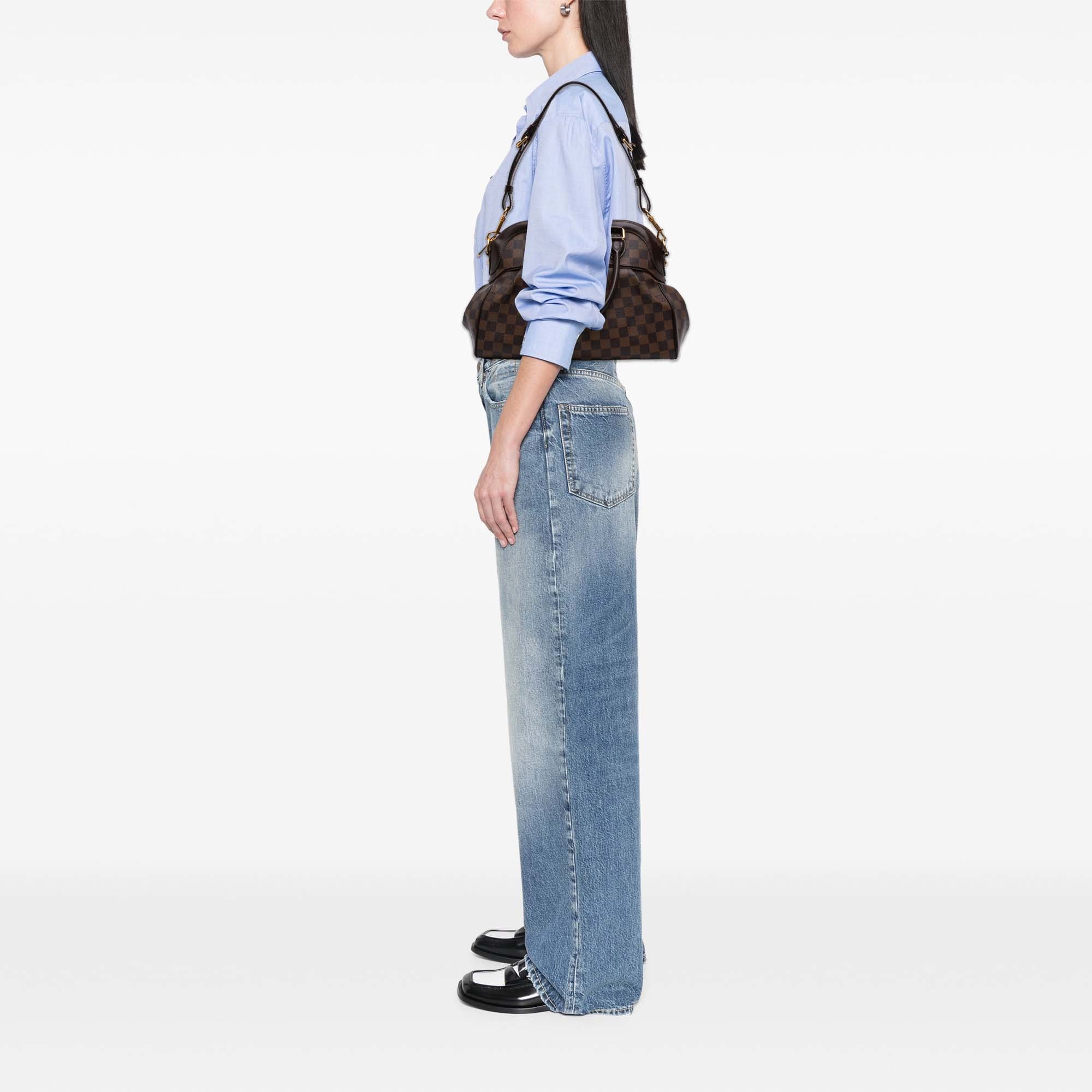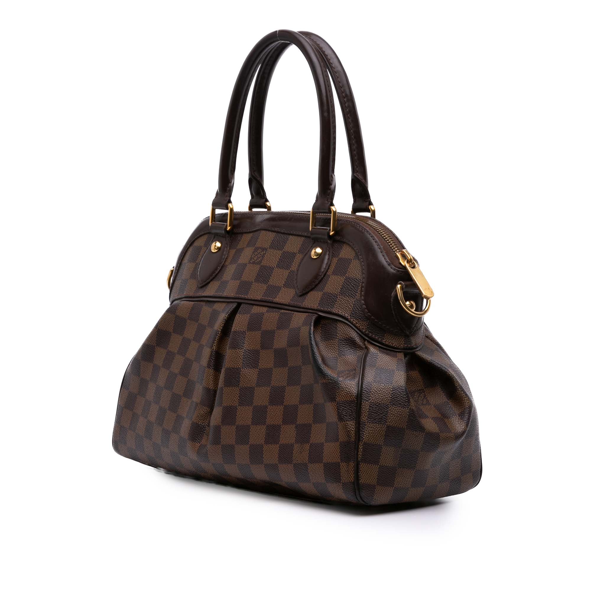The Trevi features a damier ebene canvas body with leather trim, rolled leather handles, a top zip closure, and interior slip pockets. Retail Price: 2410.00