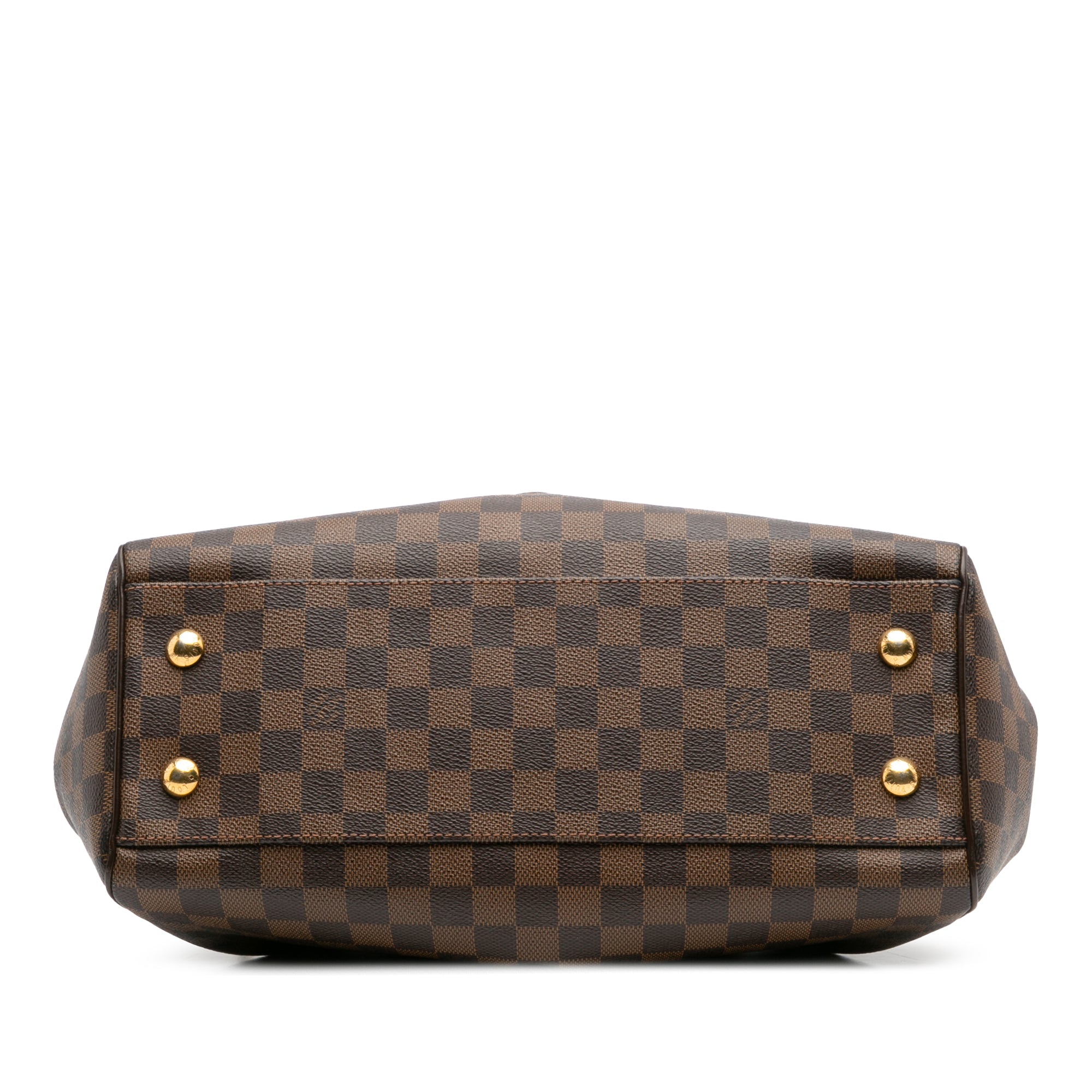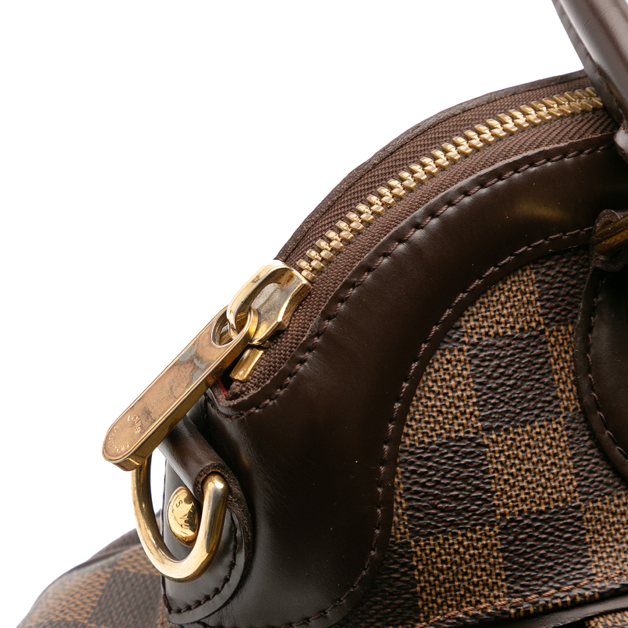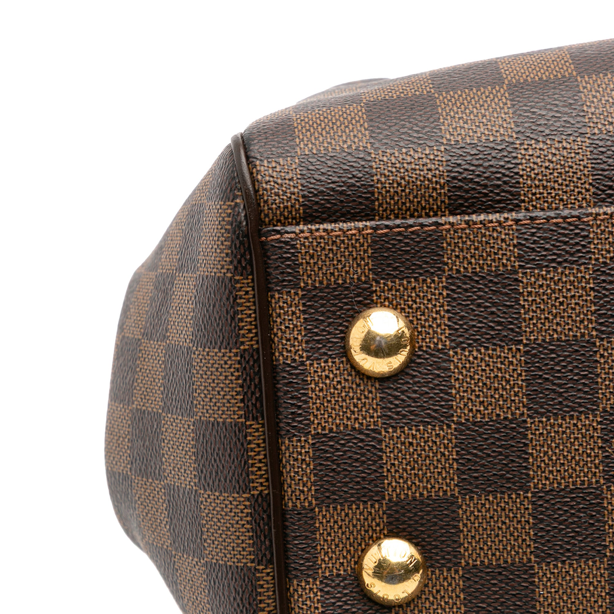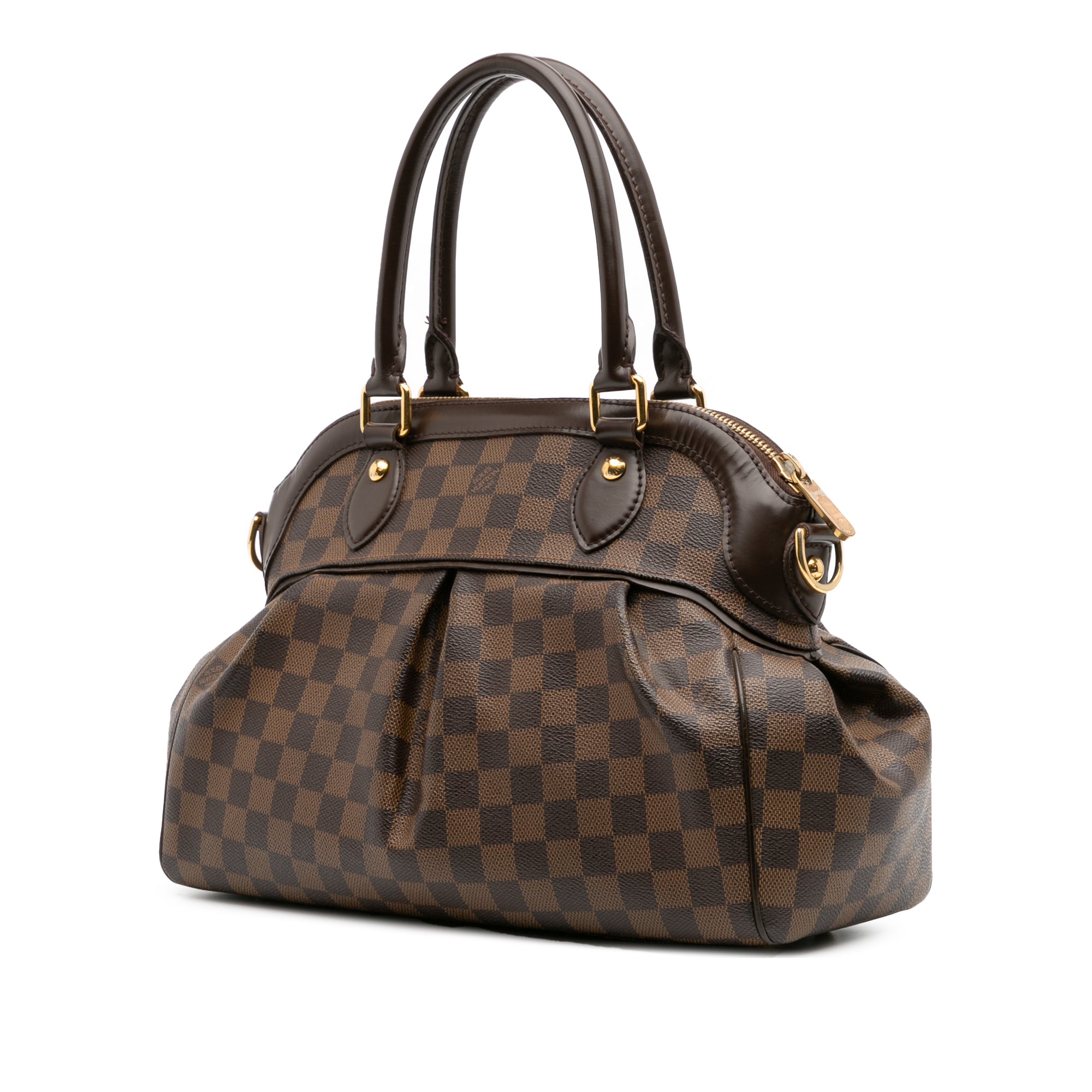 The Trevi features a damier ebene canvas body with leather trim, rolled leather handles, a detachable flat leather strap, a top zip closure, and interior slip pockets. Retail Price: 2410.00